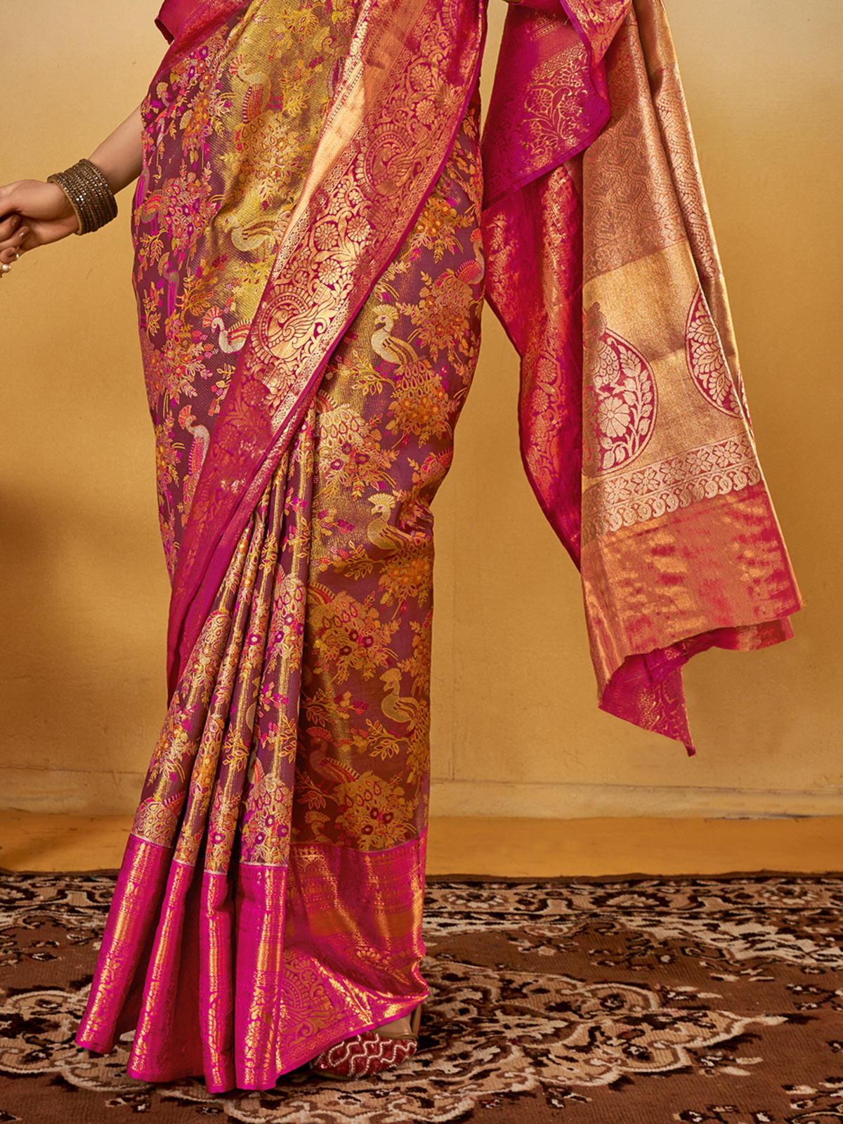 Radiate subtle grandeur in this purple silk saree enhanced with ornate zari weaving. A graceful choice for festive or party settings, its lustrous fabric and detailed accents are paired with an unstitched blouse to offer personalized tailoring and a flawless ethnic ensemble.