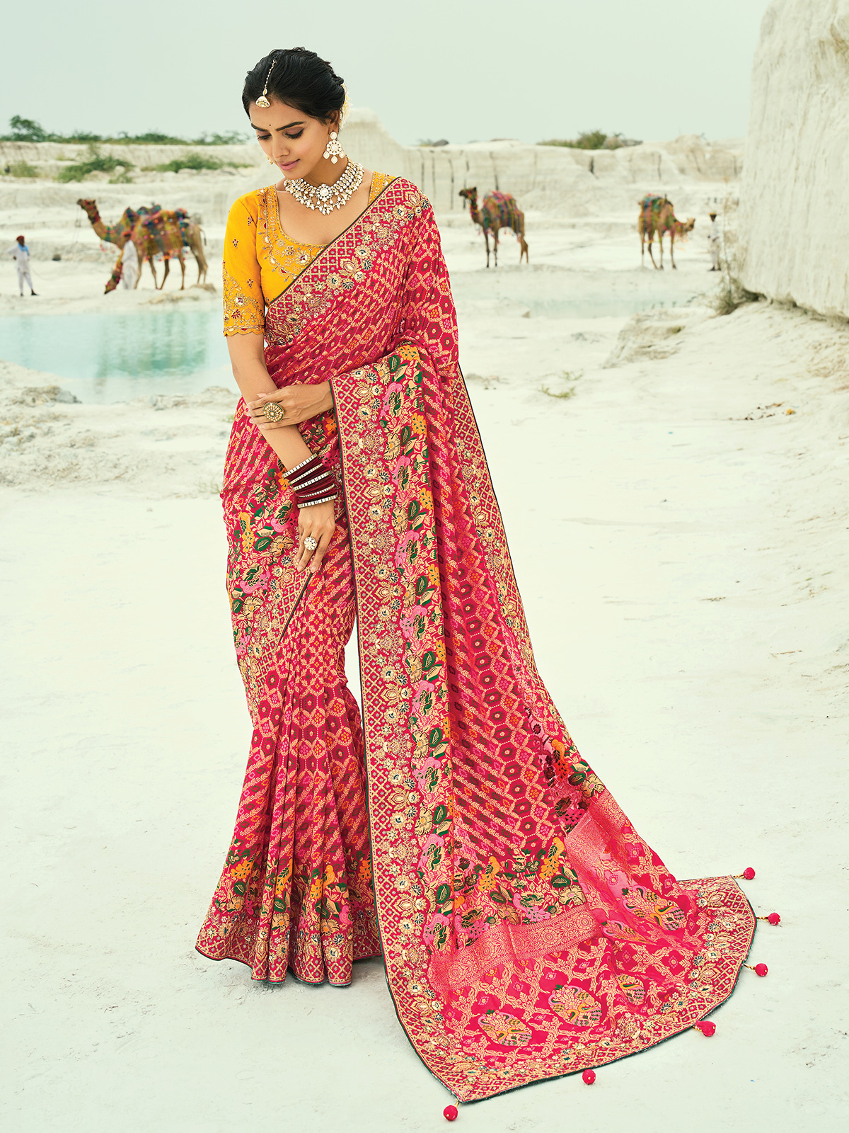 Grace your celebrations in this vibrant red Bandhej georgette saree, embellished with resham, sequins, cutdana, zardosi, pearls, and zari. The saree’s regal drape and traditional artistry make it ideal for weddings and festive events, paired perfectly with an unstitched blouse piece.