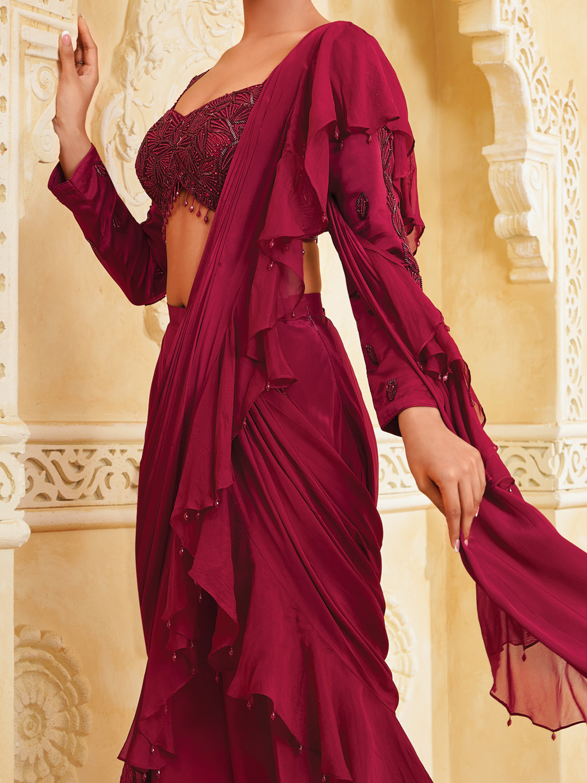 Celebrate timeless beauty in this wine crepe saree featuring a full sleeved ready made blouse adorned with exquisite cutdana and bead embellishments. Its fluid drape and regal hue make it an enchanting choice for weddings, receptions and evening celebrations.