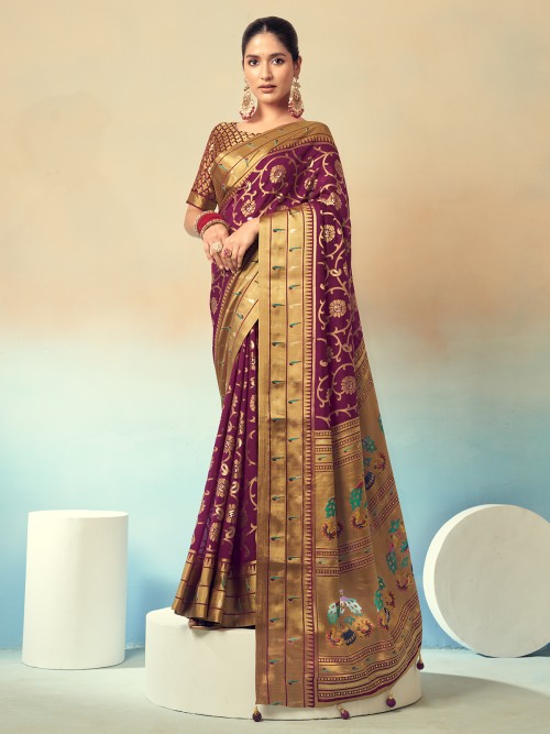 Turn heads at festive celebrations and parties in this elegant wine-colored georgette saree. Beautifully embellished with intricate zari work and a bold border, it features a heavily adorned pallu with vibrant motifs. The saree comes with an unstitched blouse, allowing you to customize the perfect look. Ideal for festivals and family gatherings, this saree brings together tradition and charm.