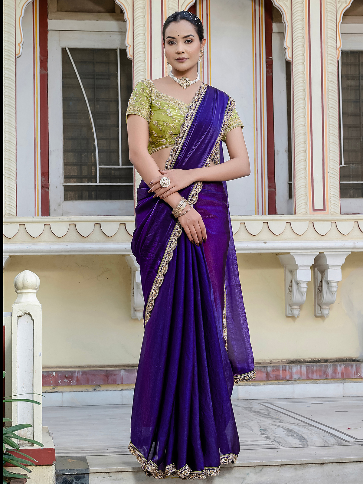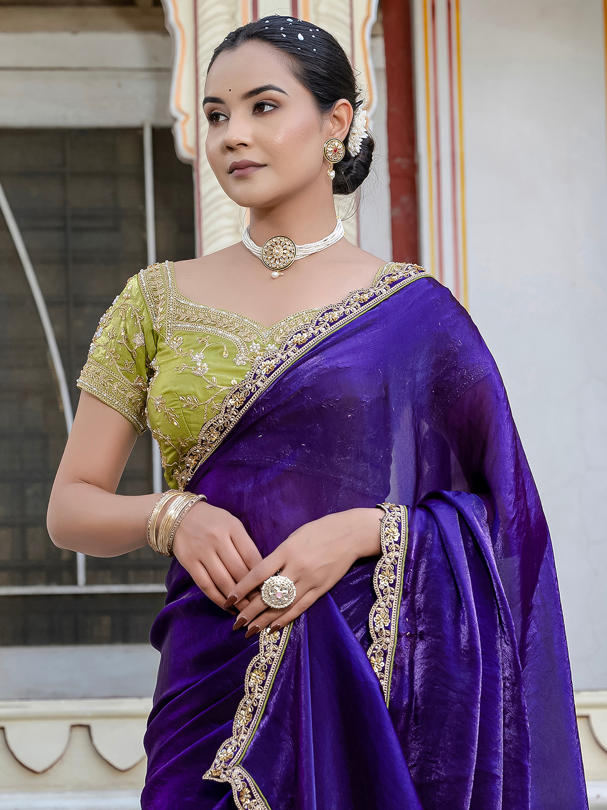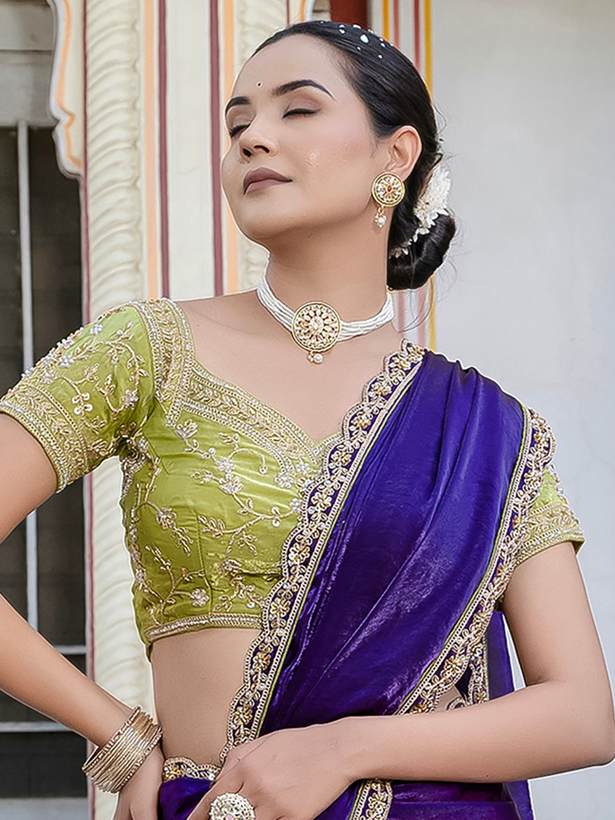 Radiate charm and poise in this navy blue satin silk saree adorned with intricate sequins, cutdana, beads and zari work. Its smooth texture and festive sheen make it perfect for special occasions. Includes an unstitched blouse piece to customize your traditional look with ease and elegance.