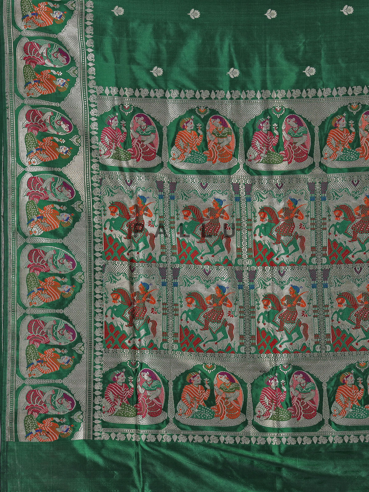 This elegant green banarasi silk saree features a rich, traditional design characterized by its heavy meenakari work on the borders and pallu. The intricate motifs, woven with vibrant multicolored threads and metallic zari, are typical of high end banarasi patola or baluchari handloom styles. The saree of the saree is a deep emerald green, adorned with subtle gold butis, creating a sophisticated contrast that highlights the elaborate, narrative style weaving on the edges. This piece exemplifies classic Indian craftsmanship, making it an ideal choice for formal weddings or festive celebrations. Comes with an unstitched blouse piece.