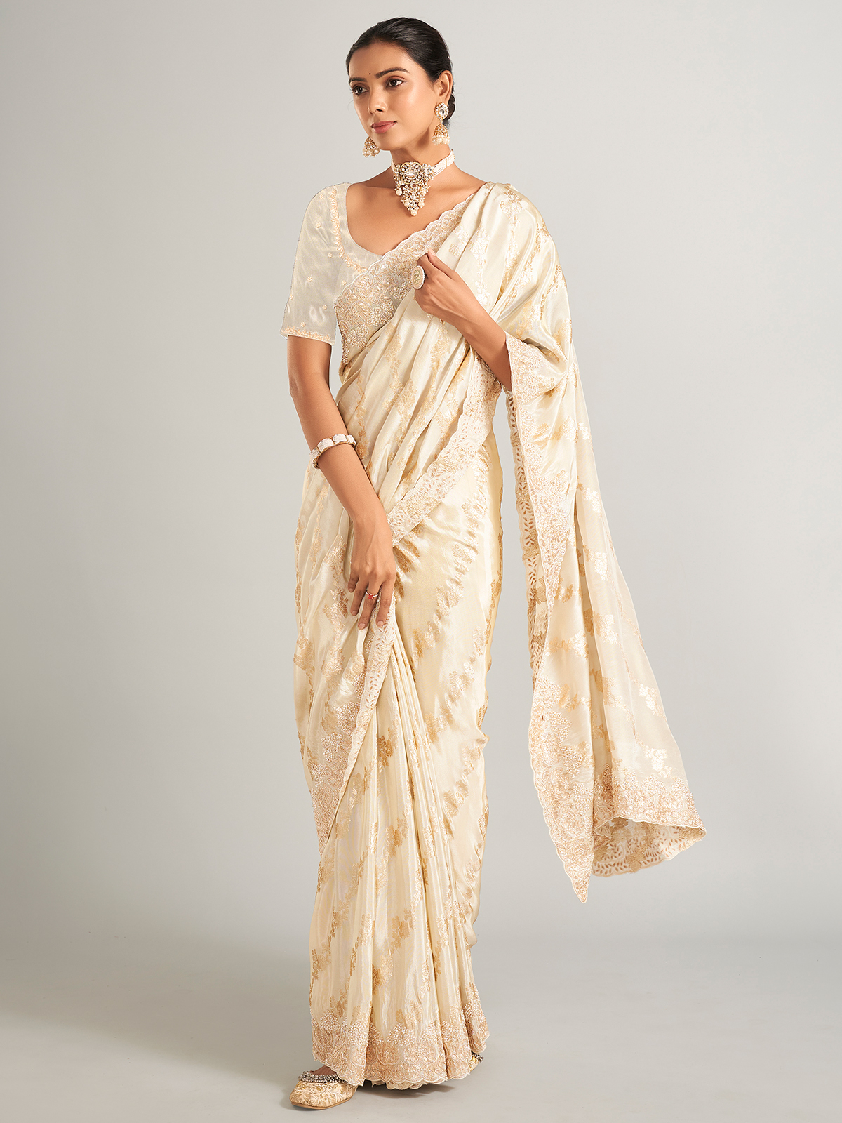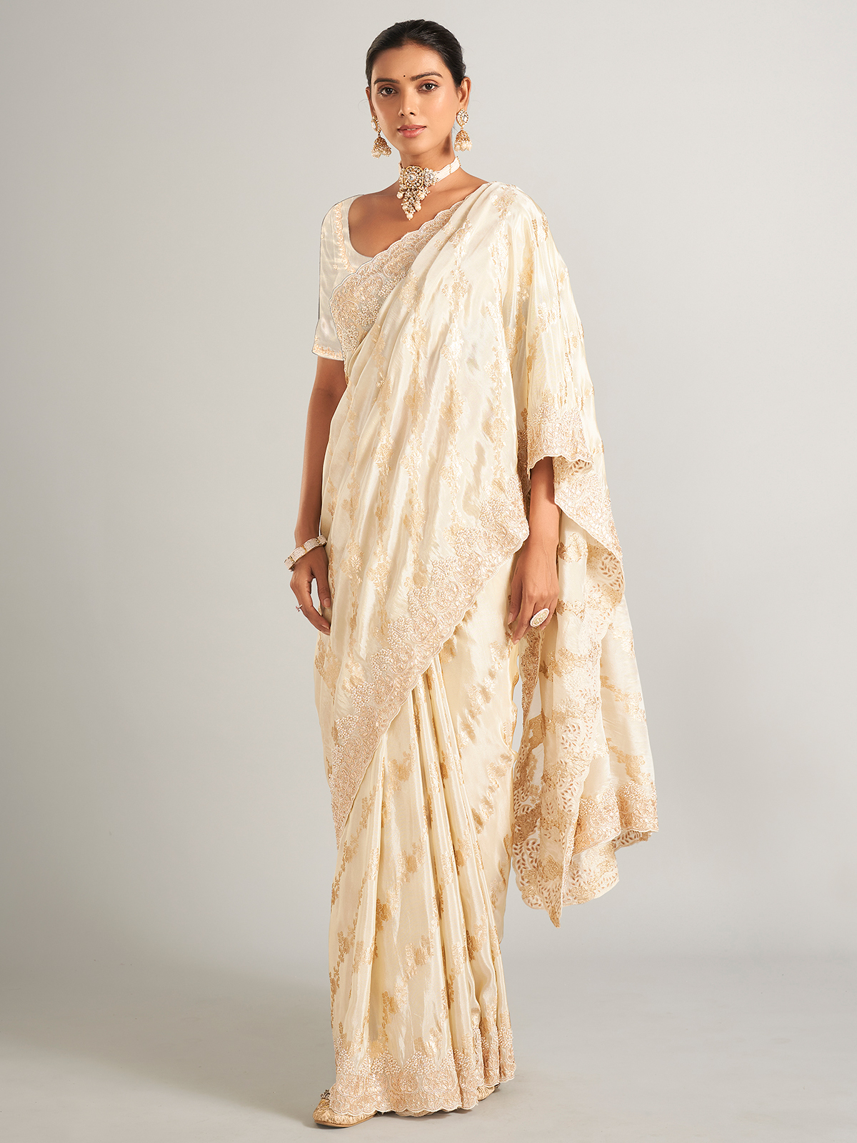 Show off your style with our cream silk saree, wrapped in elegance and draped in history. The entire saree is decorated with intricate zari, sequins, beads, gota, zardosi, and cutdana work, giving your ensemble a hint of grandeur. It has an unstitched blouse of the same color.
