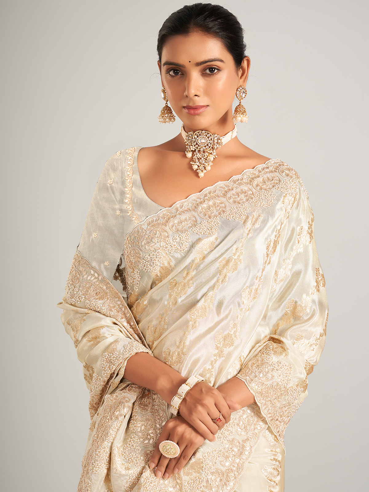 Fascinating Cream Silk Festive Wear Saree