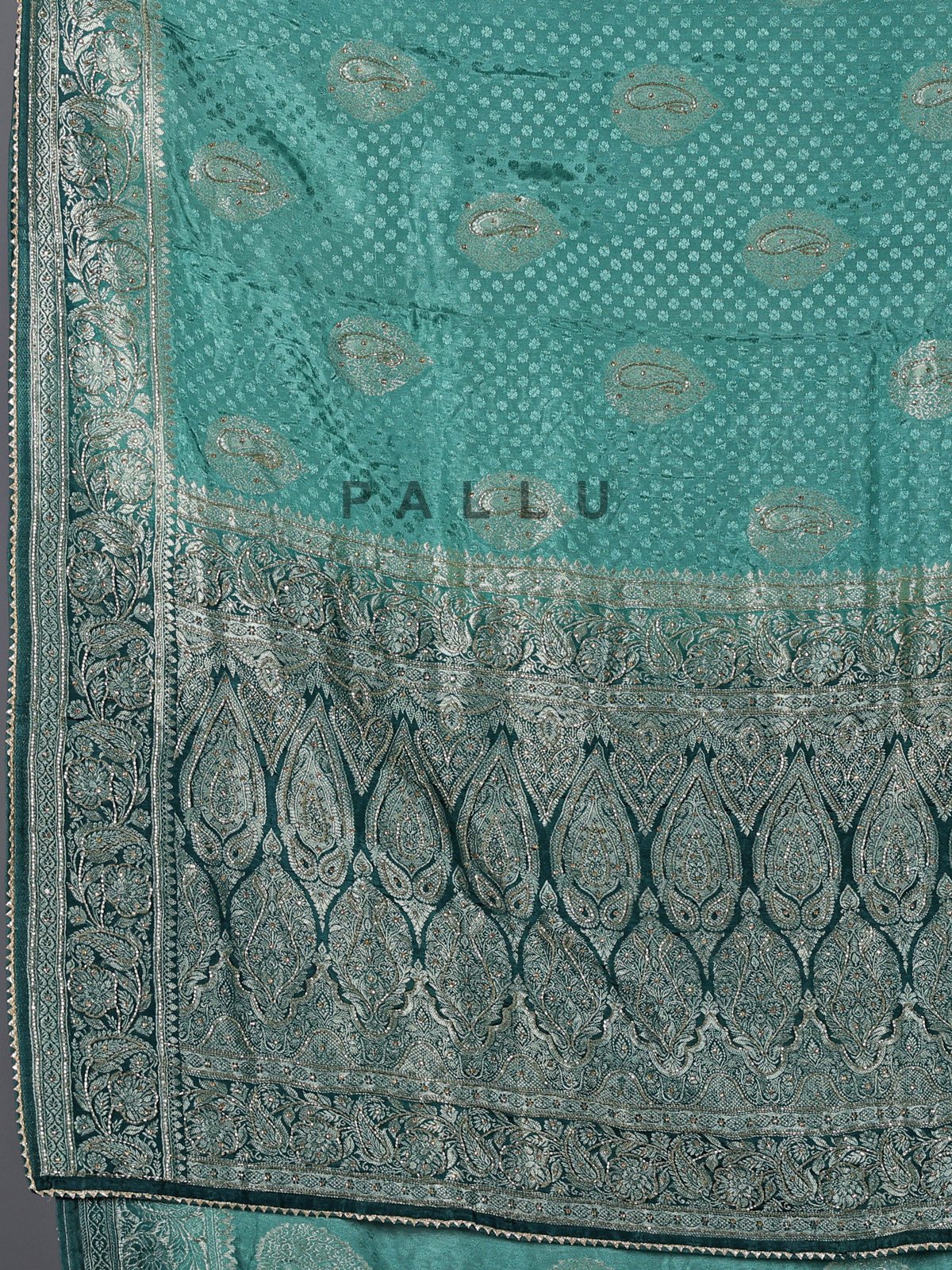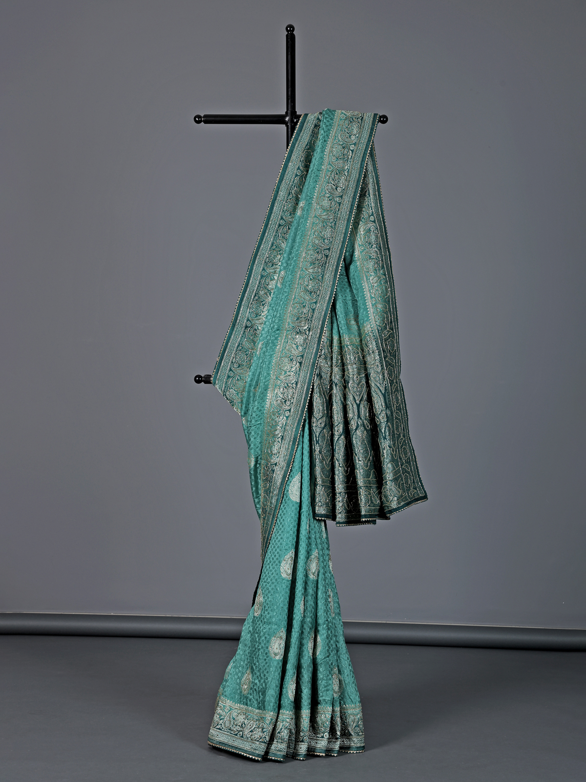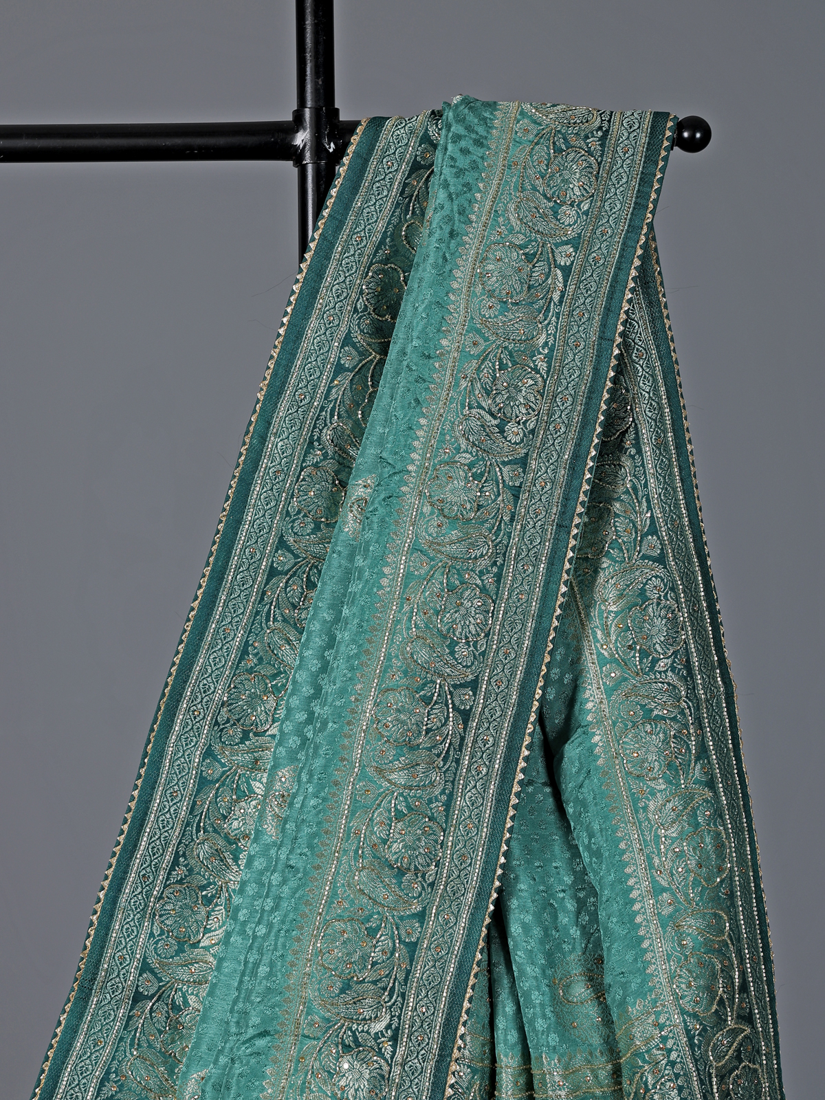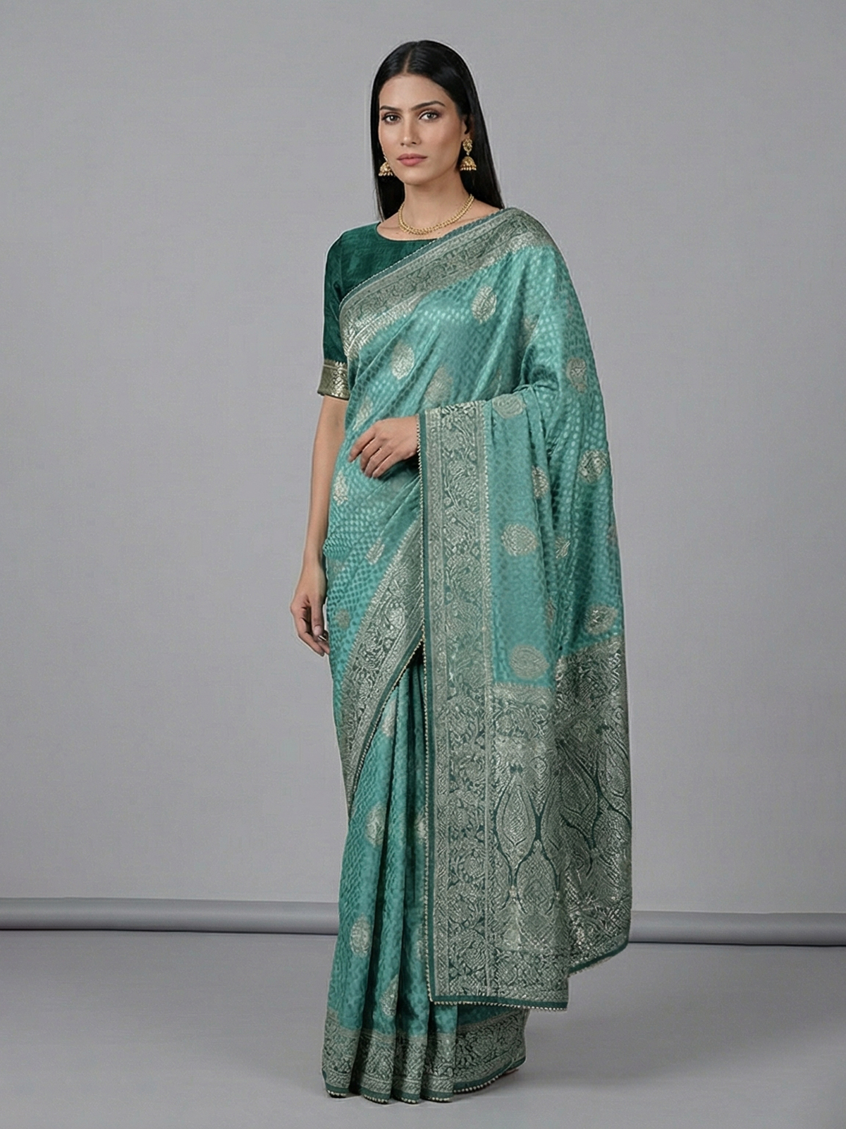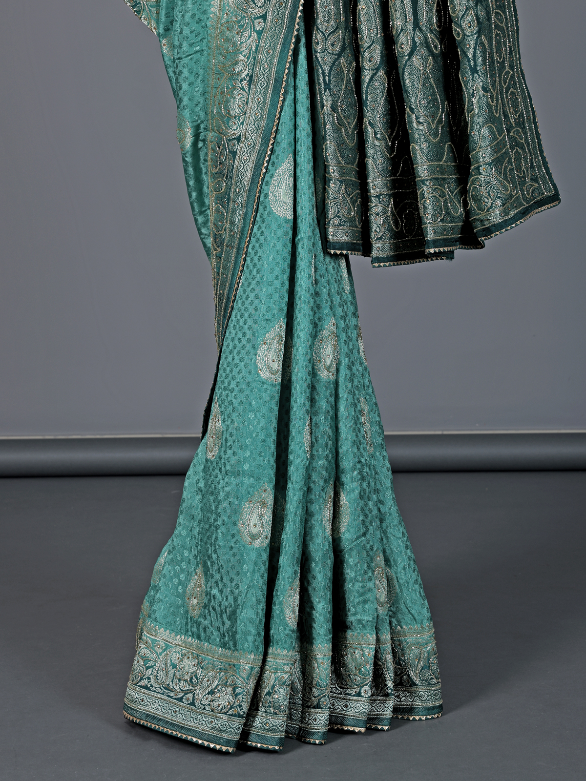 Gracefully draped in firozi blue, this dola silk saree reflects poetic elegance and festive charm. Embellished with delicate cutdana, stone, zari and gota work, it shimmers with refined beauty. The shaded border and pallu add depth and visual richness. Perfect for weddings, sangeet and receptions, it comes with an unstitched blouse piece for a personalized and graceful finish.