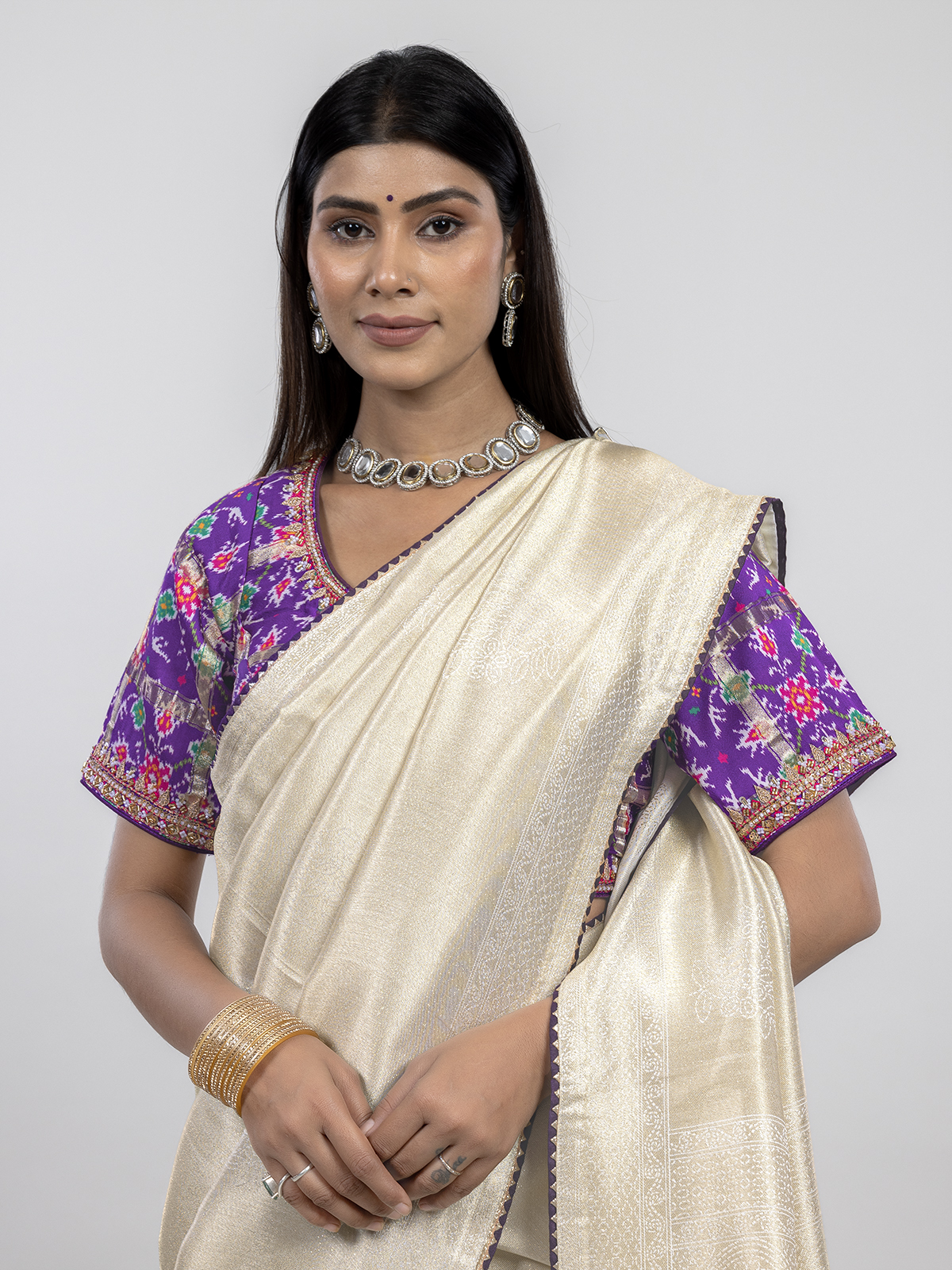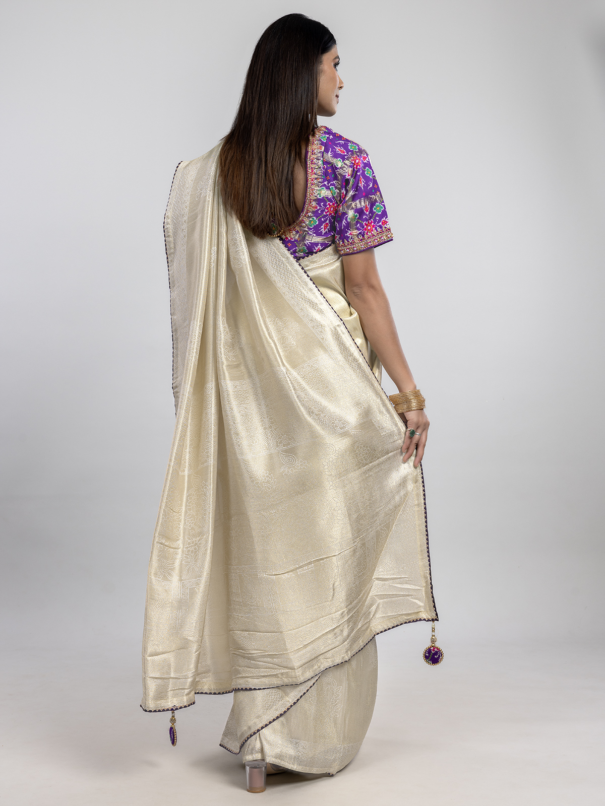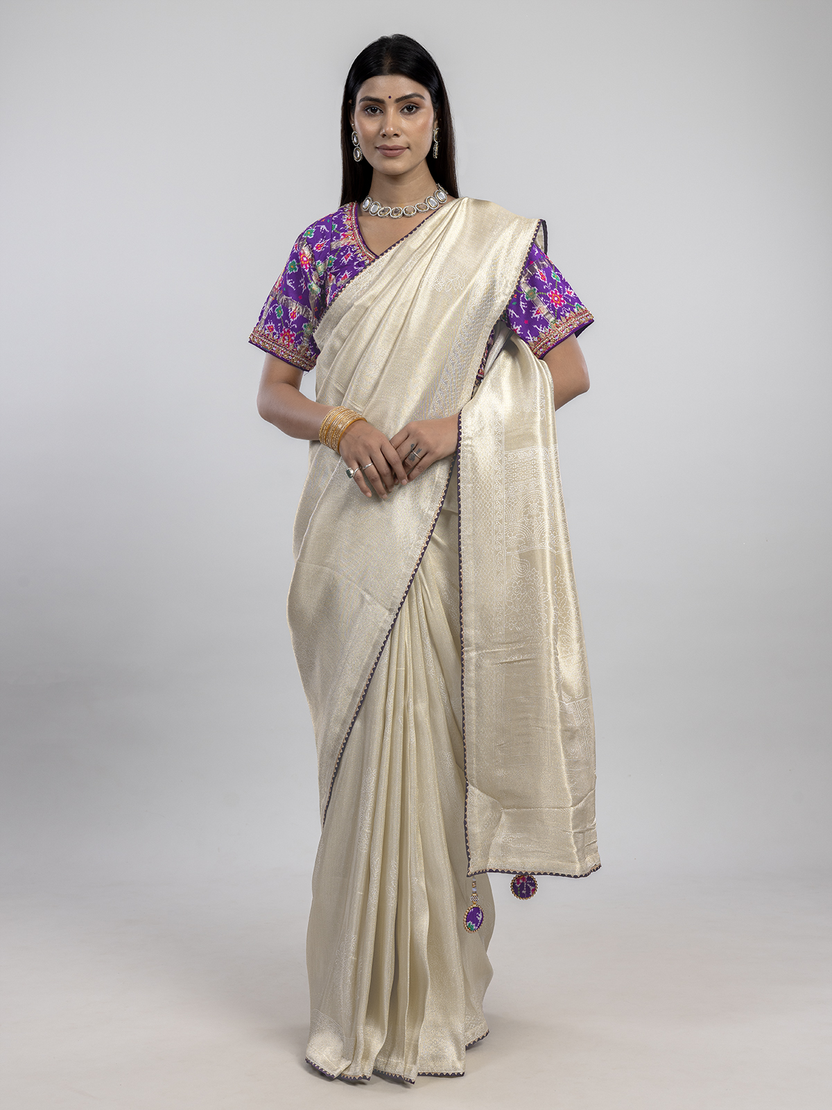 Ethereal and refined, this off-white dola silk saree shimmers with zari, radiating soft elegance. A purple readymade blouse enriched with beads, sequins, and cutdana brings depth and sophistication. Designed for cultural occasions, it embodies understated beauty and timeless grandeur in every fluid drape.