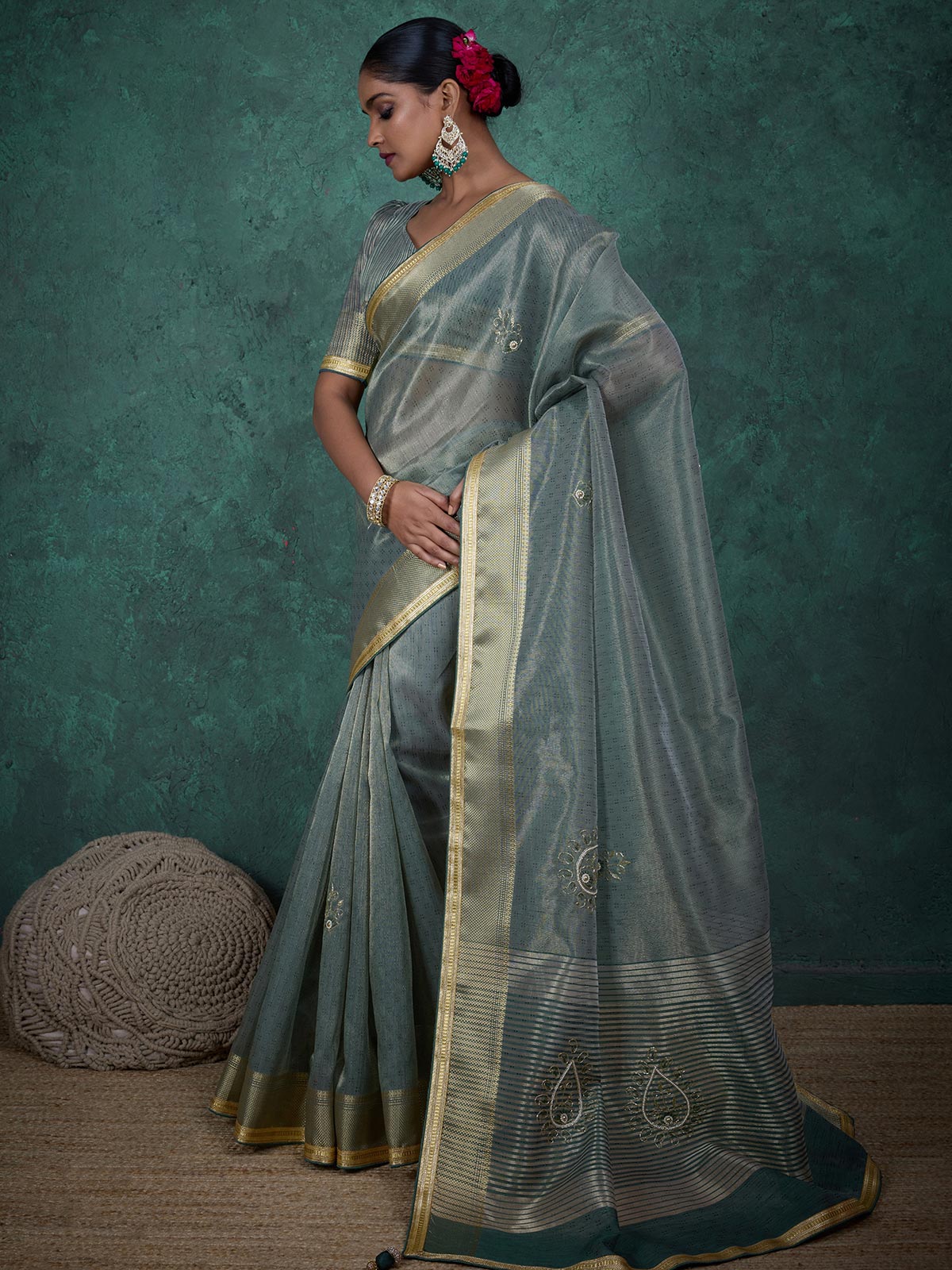 Georgous Mint Blue Saree In Linen Tissue Silk