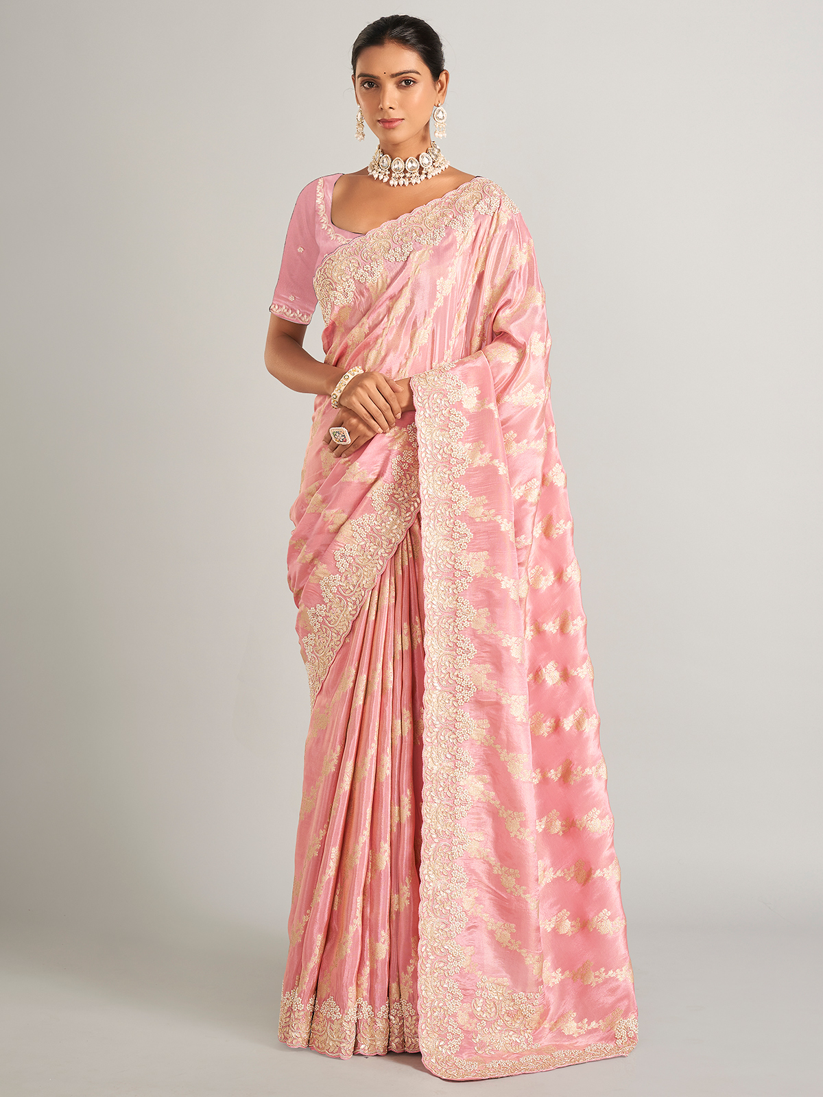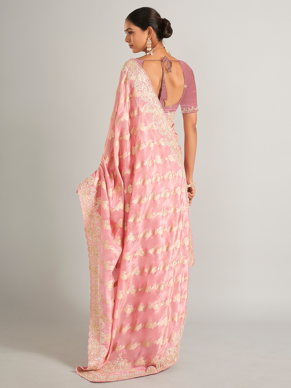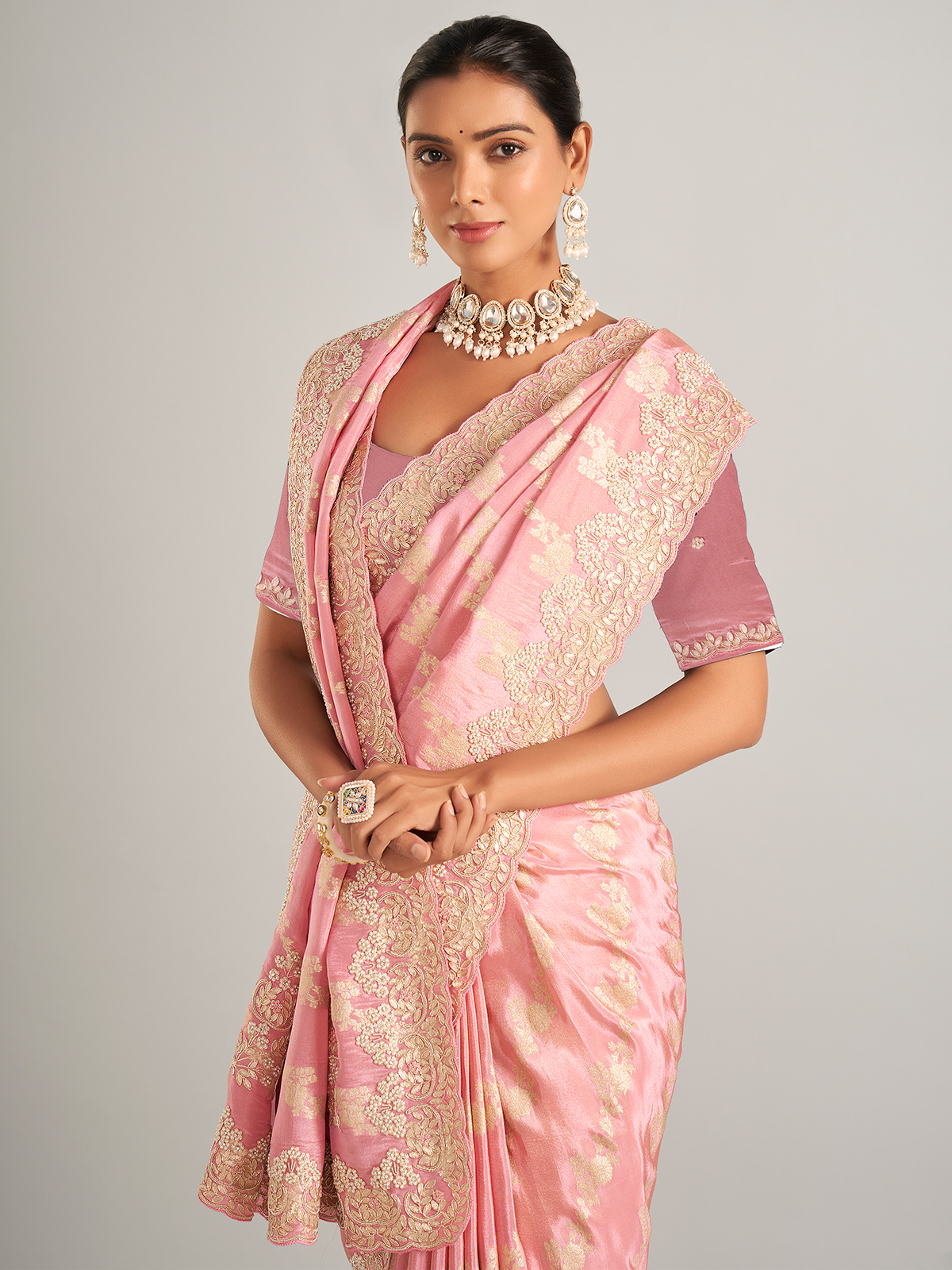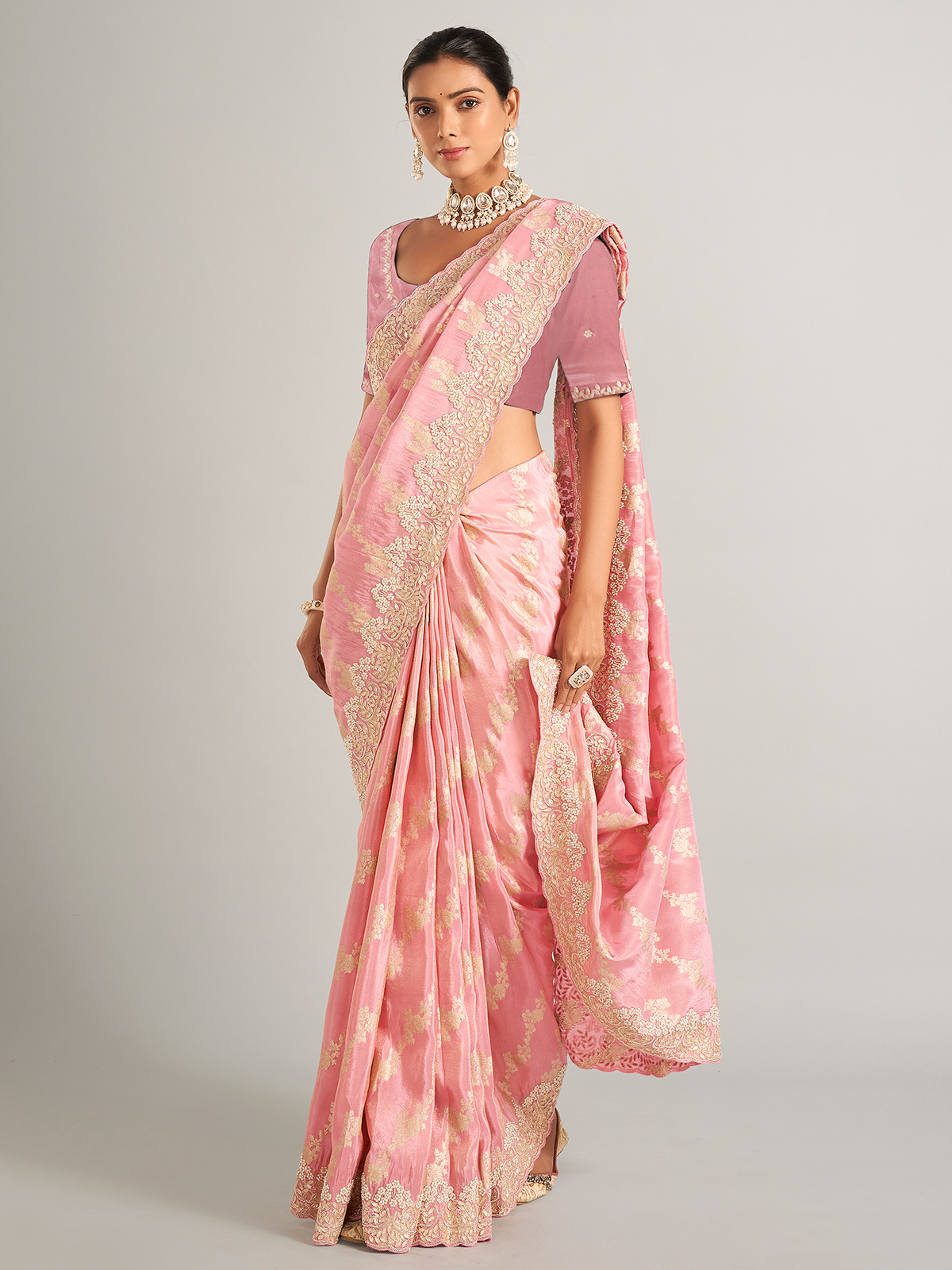 With a light pink silk saree, you may look elegant and timeless at any time. The zari, sequins, beads, gota, zardosi, and cutdana work that adorn this saree add a rich shine. includes a piece of unstitched blouse in the same color.