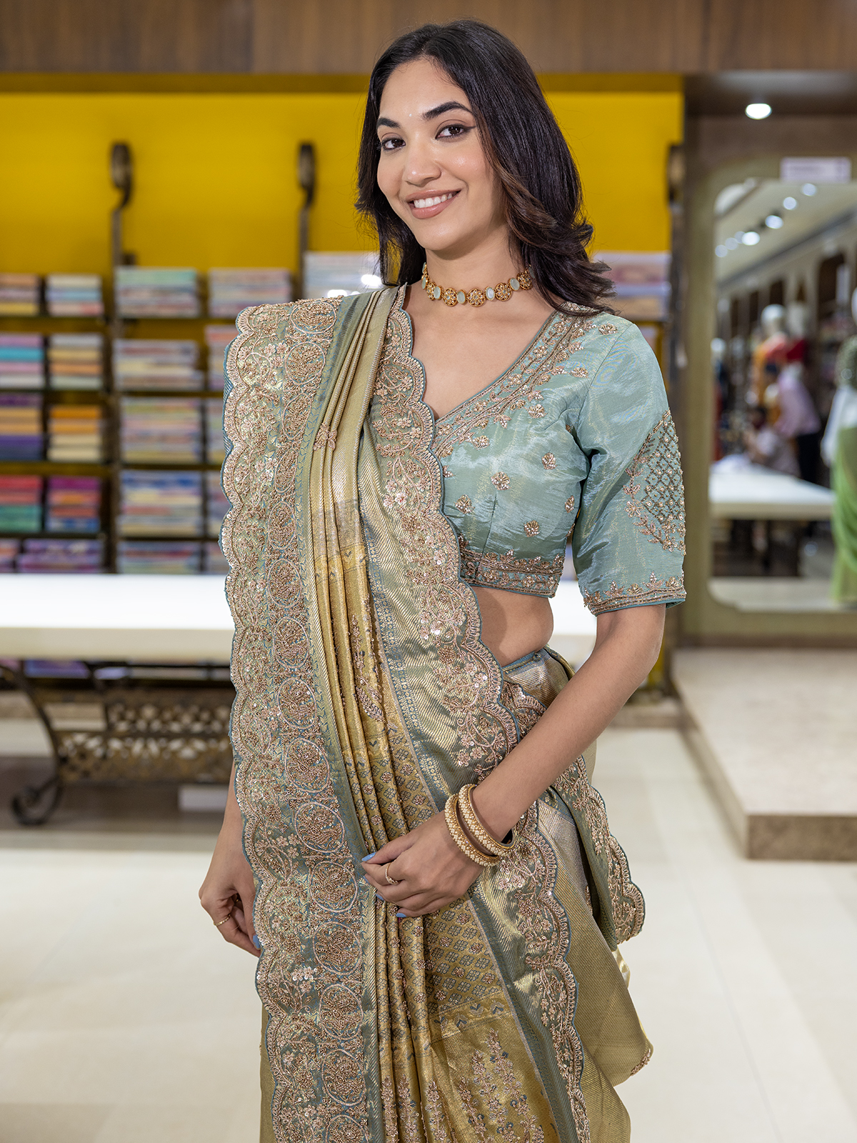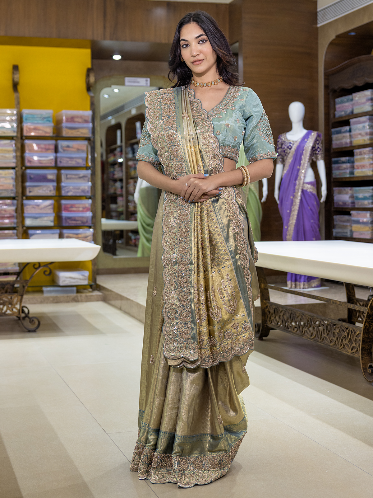 Draped in golden silk, this saree exudes celestial radiance and timeless grandeur making your wedding look more elegant. Adorned with intricate zardosi, sequins, cutdana, beads, and zari work, it gleams with regal artistry. Perfect for weddings, receptions, or bridal soirees, it pairs gracefully with a complementing an unstitched blouse for an ethereal, queenly aura.