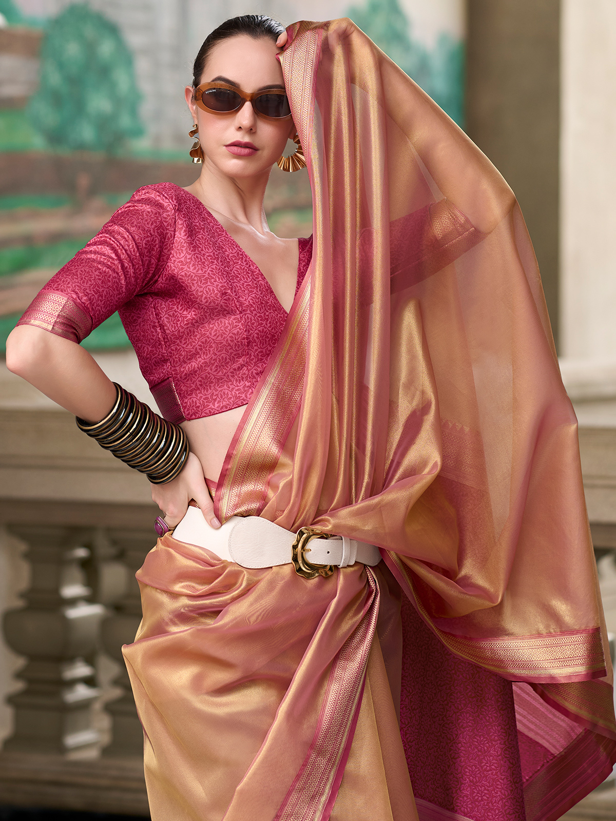 With its opulent zari weaving and striking border, this gorgeous golden tissue silk saree exudes an alluring appearance. Includes a blouse piece that isn't sewn.