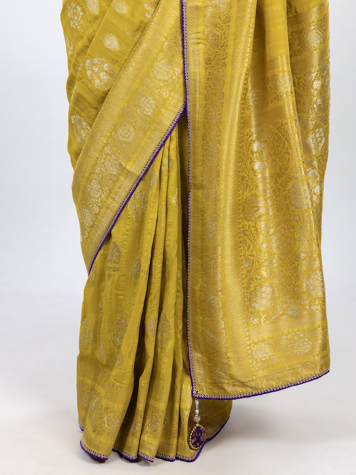 The golden aura of this yellow dola silk saree glimmers with zari, resham, and sequins, embracing festive warmth. Its artistry weaves a story of joy and tradition, perfect for rituals. Paired with a purple readymade blouse, it becomes a graceful ensemble radiating cultural richness and refined brilliance.
