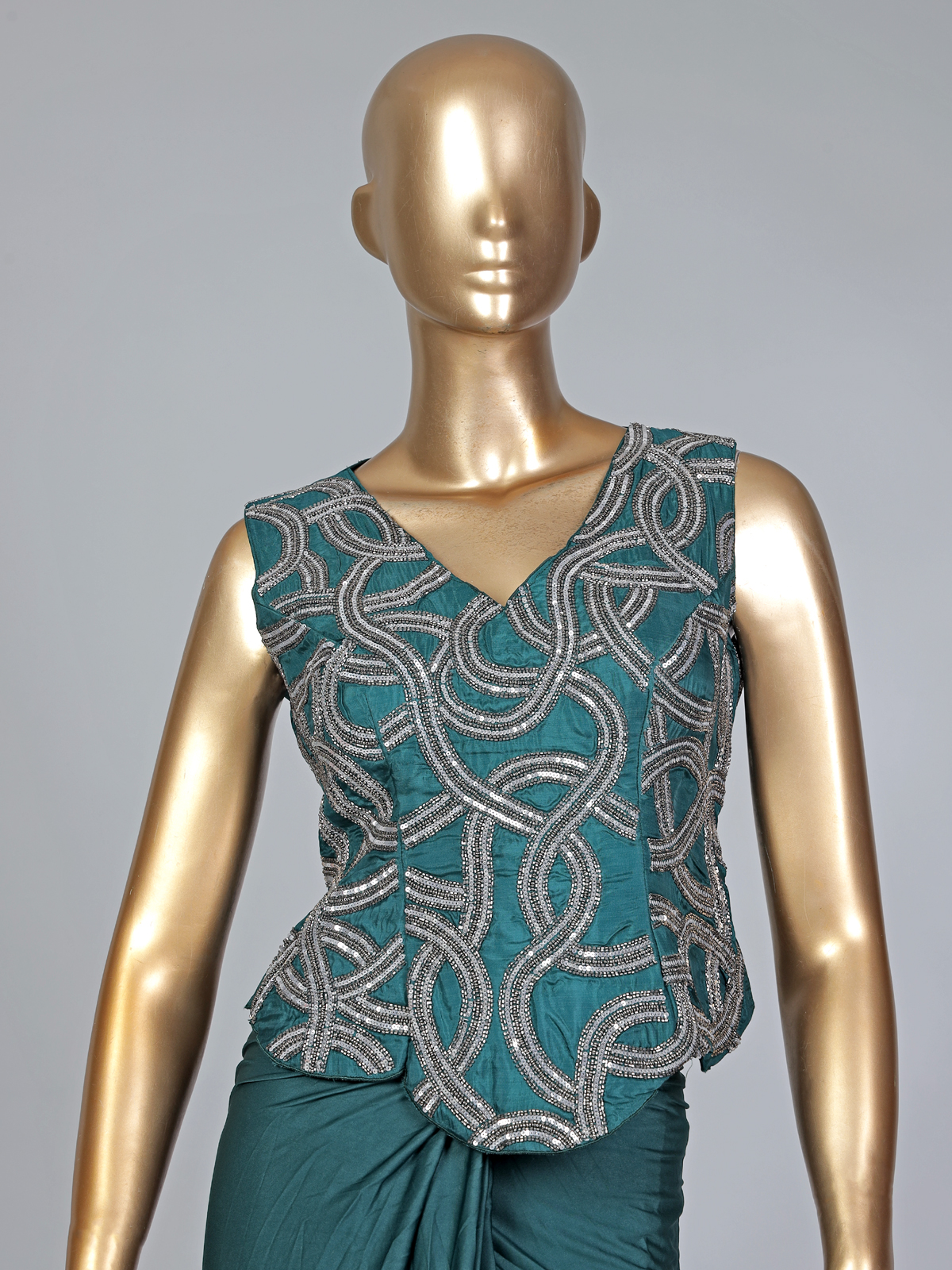 Radiating vibrant charm, this green lycra ready-to-wear saree captures graceful femininity. The sleeveless V-neck blouse is enriched with shimmering cutdana, beads, and sequins that add festive brilliance. The soft drape flows elegantly, making it a perfect choice for weddings, receptions, and lively celebrations.