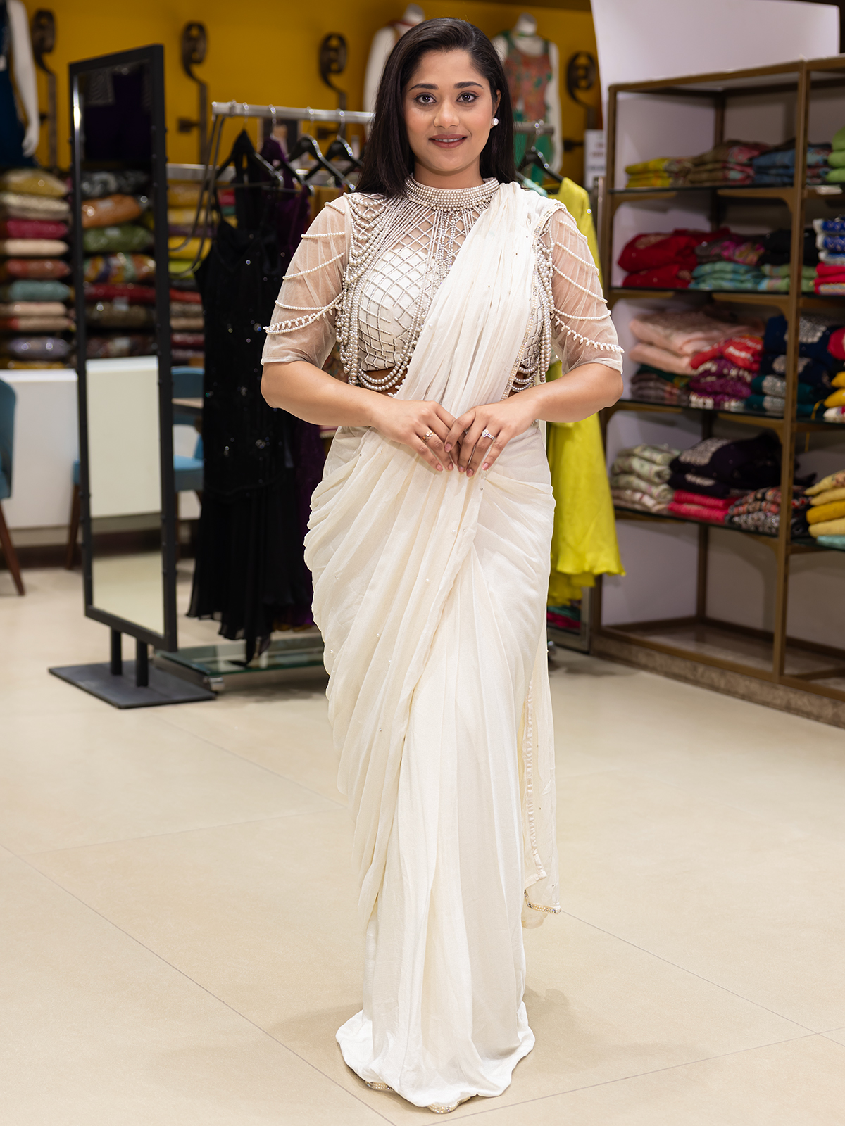 This white ready to wear saree is perfect for any busy woman who wants to achieve an effortlessly stunning look. Made from luxurious silk fabric, it features intricate bead and stone embellishments. The saree comes with a ready made blouse, also adorned with beautiful beadwork for added elegance.