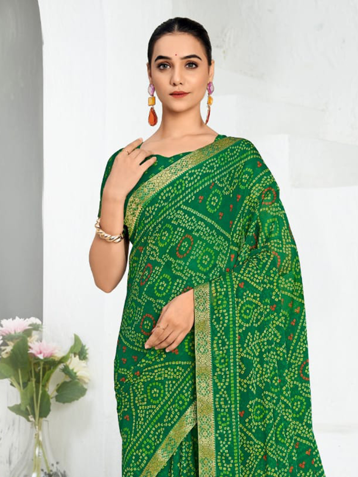 Celebrate your festive spirit with this graceful green chiffon printed saree, crafted to combine effortless elegance and comfort. The lightweight chiffon fabric drapes beautifully, while the intricate prints add a touch of charm and sophistication. Paired with an unstitched blouse piece for customized styling, this saree is perfect for cultural celebrations, traditional gatherings, and festive occasions.