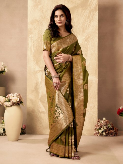 Step into the spotlight with this green silk saree, featuring shimmering zari weaving that adds a modern edge to festive fashion. Ideal for parties and cultural events, it includes an unstitched blouse to help you design your signature ethnic look.