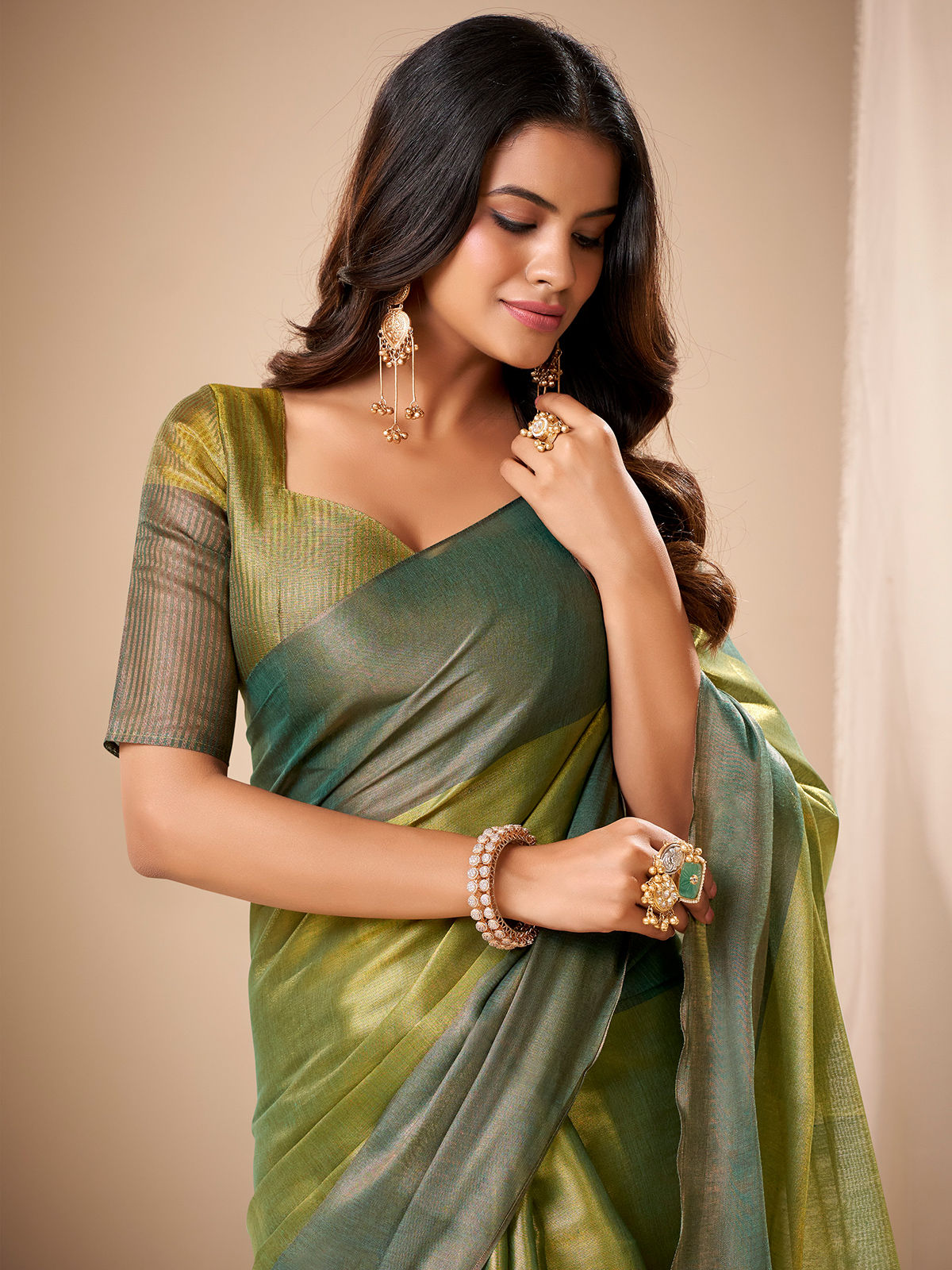 Crafted in graceful green tissue silk, this saree is enhanced with refined zari work for understated elegance. Completed with an unstitched blouse piece, it offers a luminous drape, making it a versatile choice for weddings, festive gatherings, sangeet nights and mehndi celebrations.