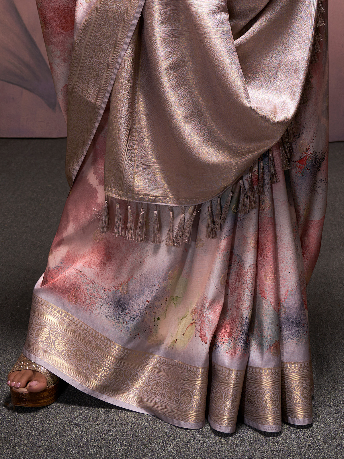 Elevate your festive wardrobe with this saree set featuring an unstitched handloom silk blouse. Soft lilac shades complement the painted artistry and refined zari accents, creating a regal appearance. Ideal for wedding ceremonies and joyous celebrations, it showcases refined taste and skilled craftsmanship.
