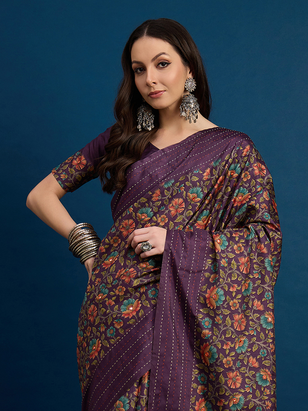 Graceful Purple Cozi Silk Saree With Artistic Prints And Thread Embroidery