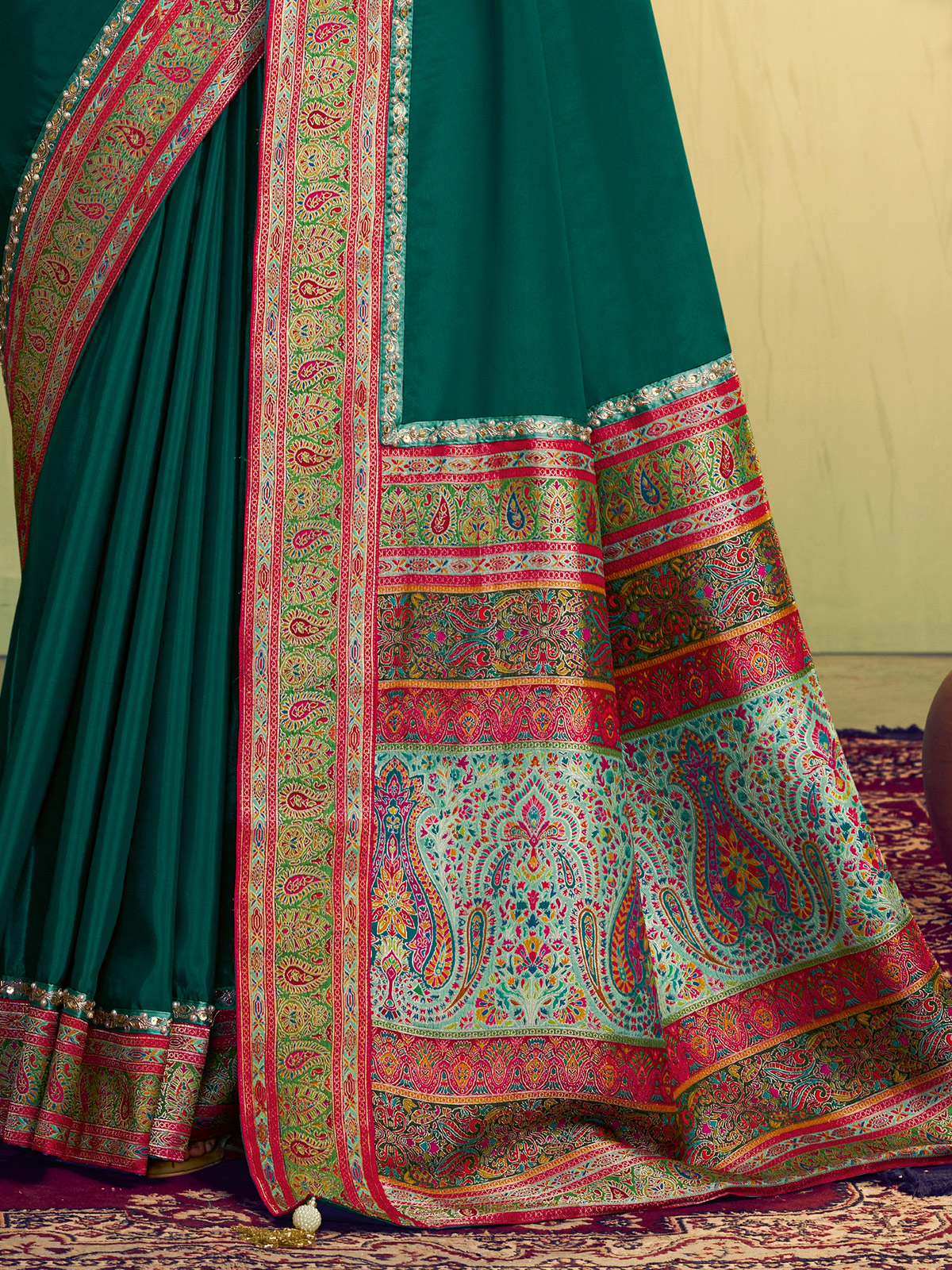 Enhancing graceful charm and regal confidence, this green Banarasi natural silk saree is a statement of classic beauty. Intricately decorated with resham, sequins, cutdana, and beads, the saree features colorful motif weaving on the border and pallu for traditional richness. Perfect for festival, party, and wedding wear, it is paired with an unstitched blouse to complete the elegant look.