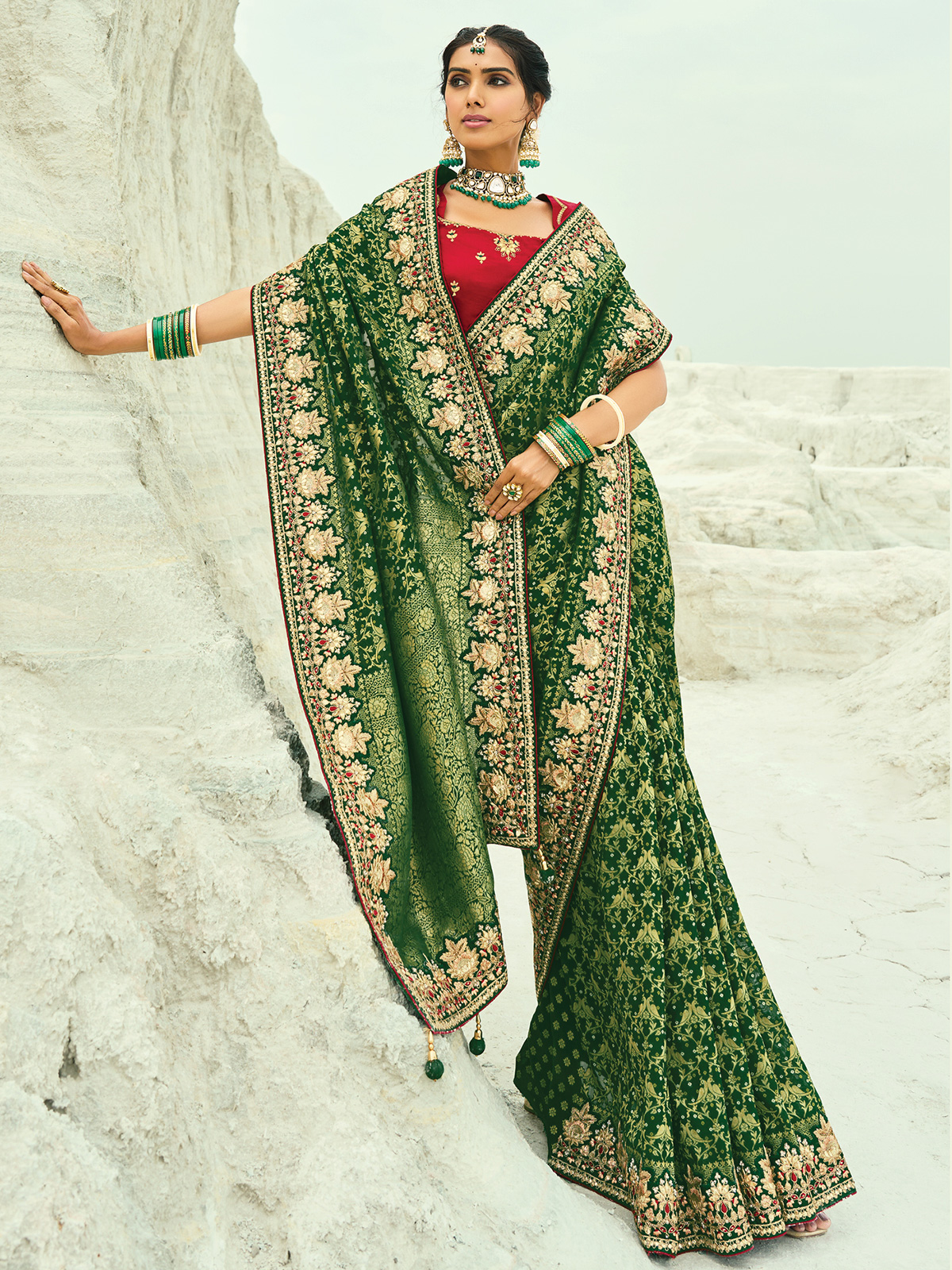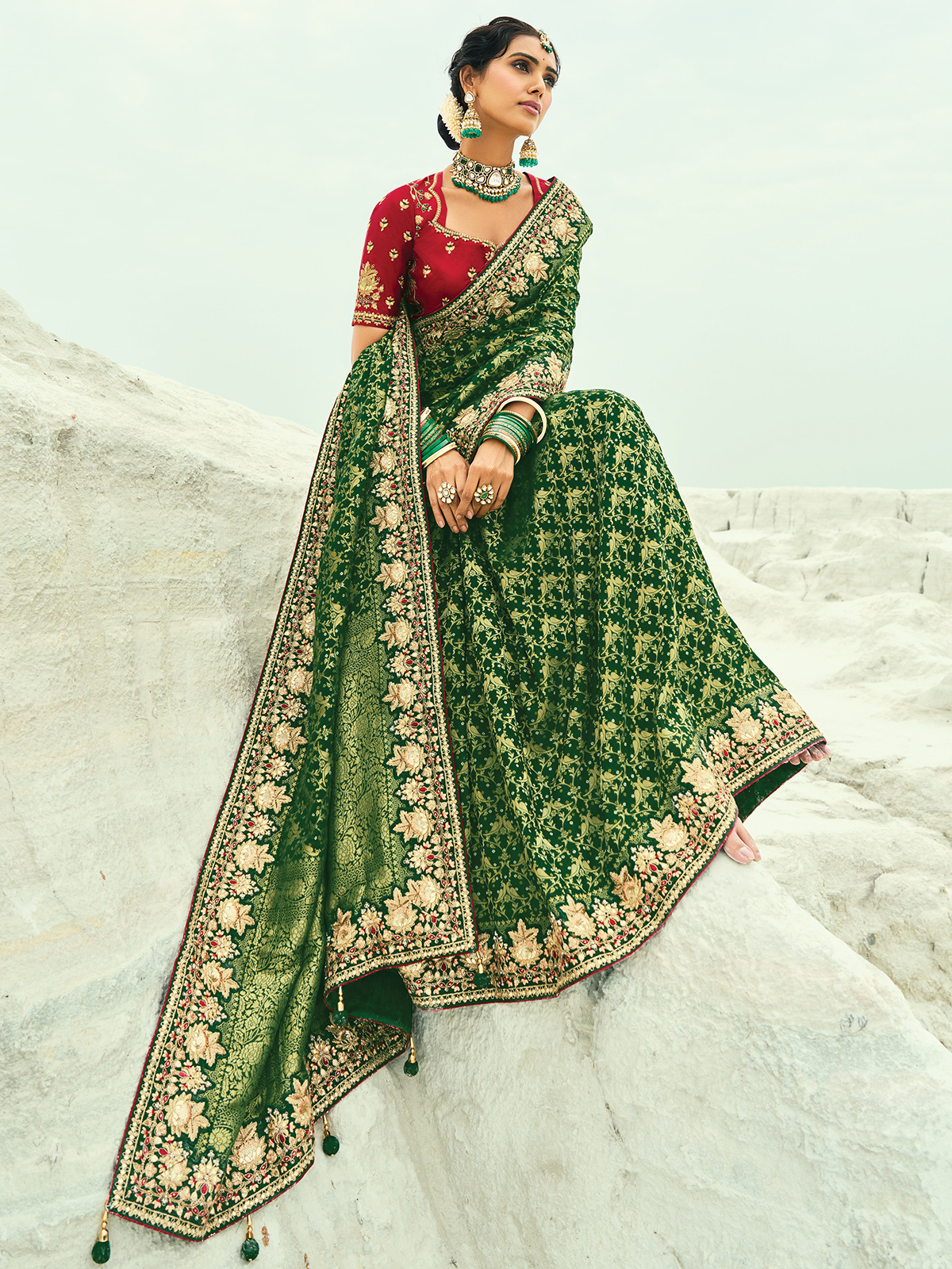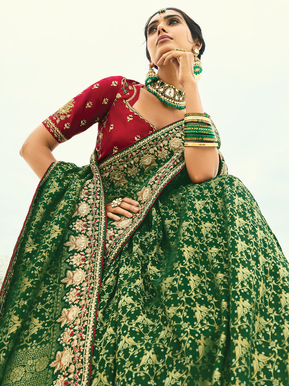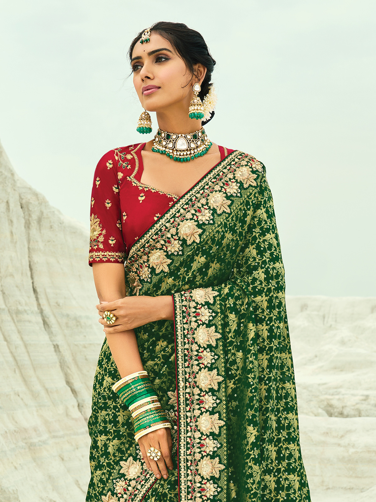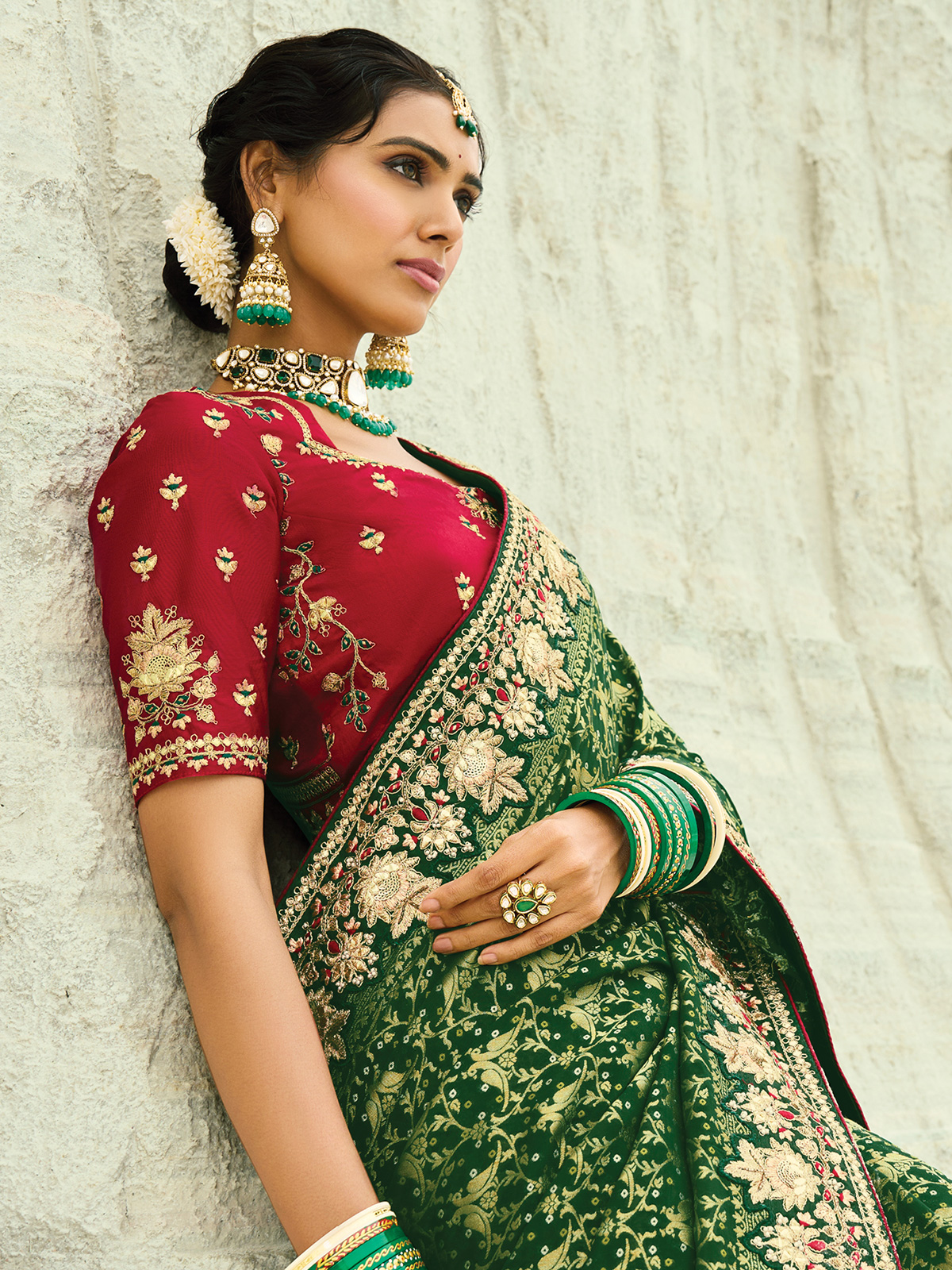 Celebrate heritage in this green bandhej georgette saree, detailed with zari, sequins, pearls, resham, thread, cutdana, and zardosi work. Ideal for mehendi and wedding celebrations, it includes an unstitched blouse piece, radiating royal and traditional appeal.