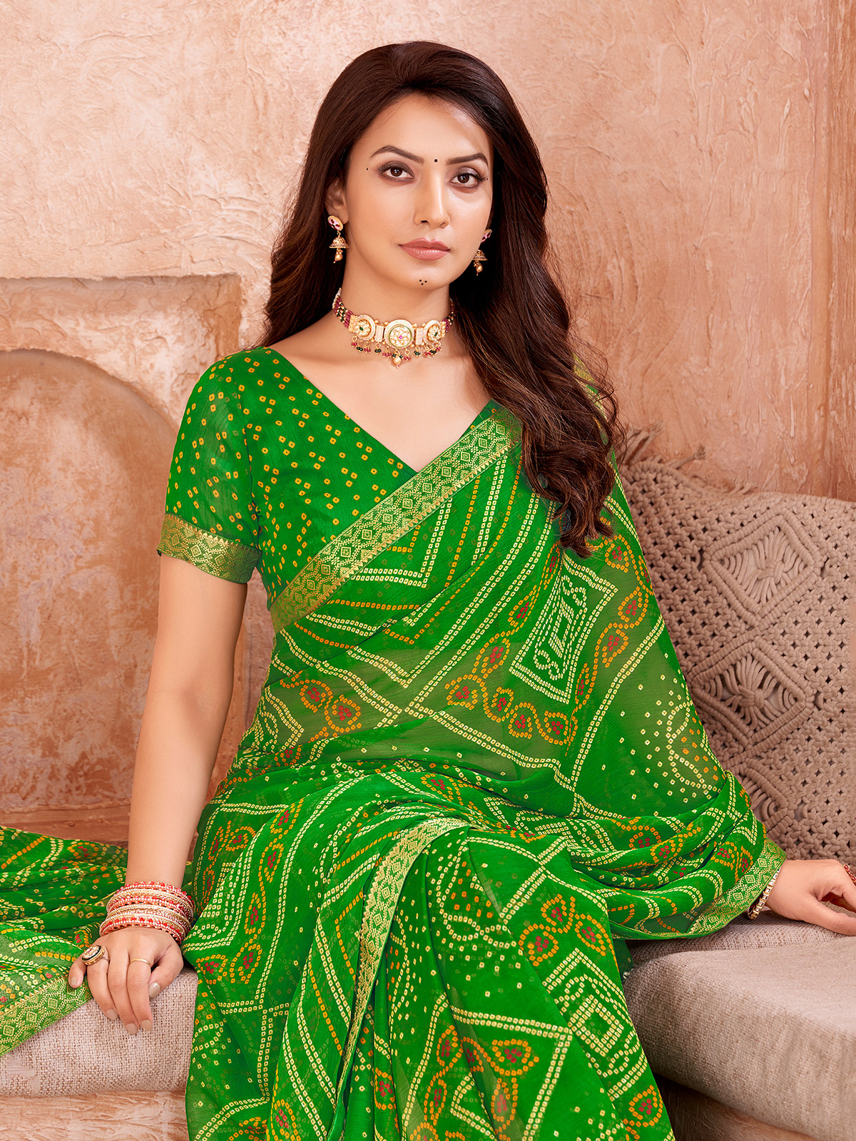 Gracefully blending tradition and sophistication, this green chiffon saree showcases exquisite bandhani print. A regal choice for festivals, it offers a refined, elegant look. Includes an unstitched blouse piece.