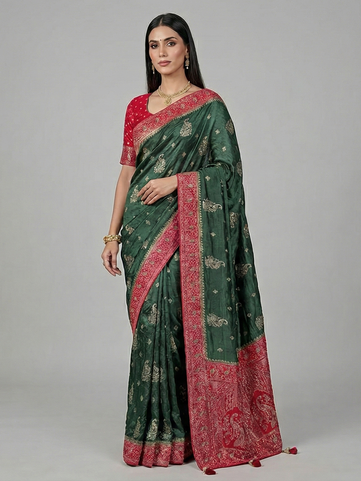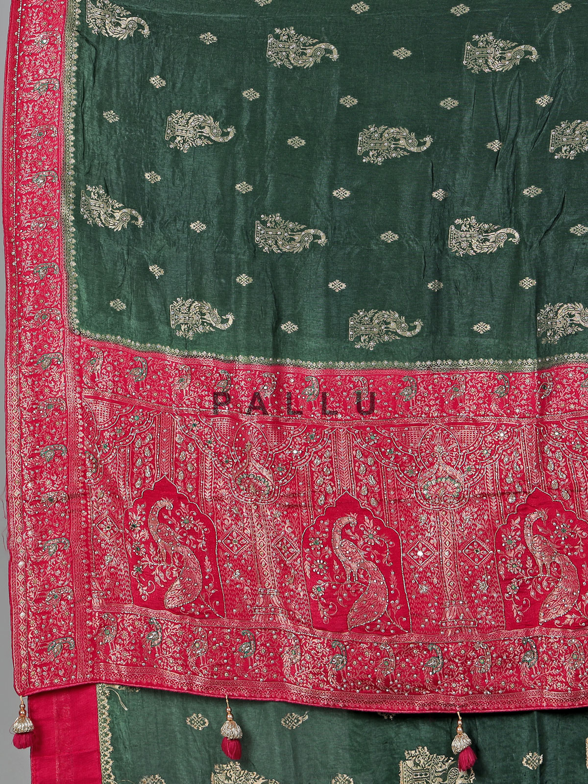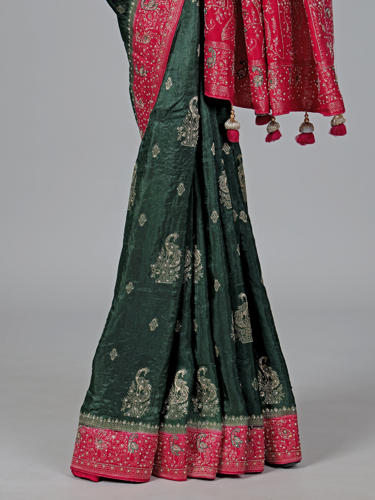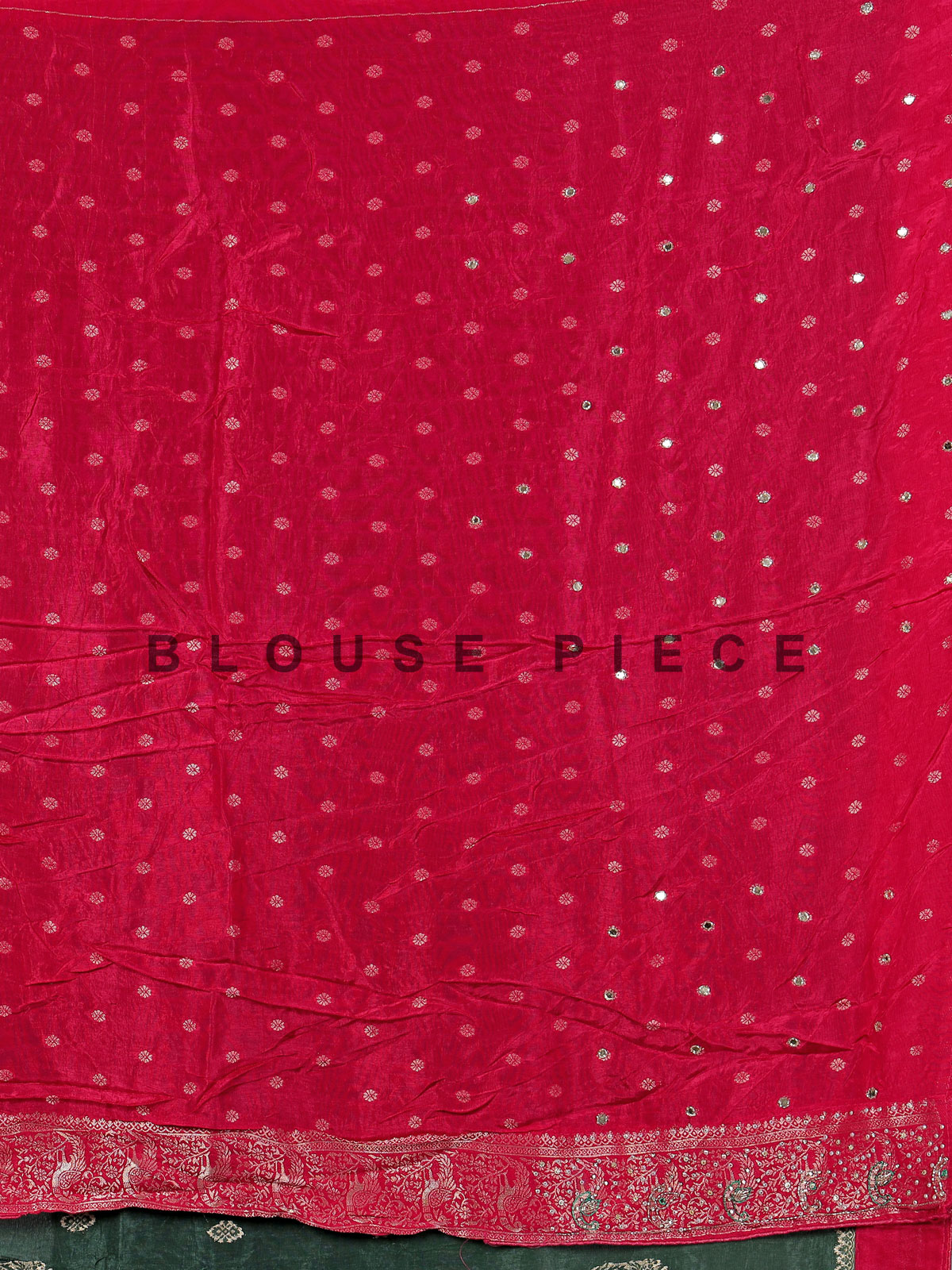 Celebrate vibrant elegance with this green dola silk saree, adorned with intricate cutdana, sequins, thread, mirror, stone and zari work. The contrast border and pallu add a refined festive finish. Perfect for weddings and sangeet nights, it comes with an unstitched blouse piece for customized styling.