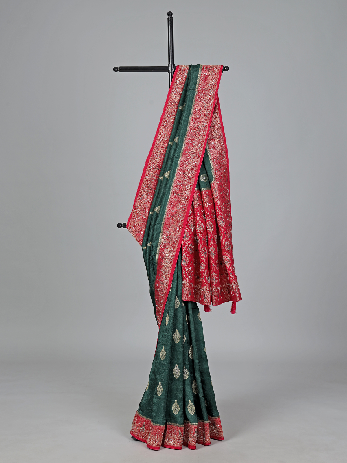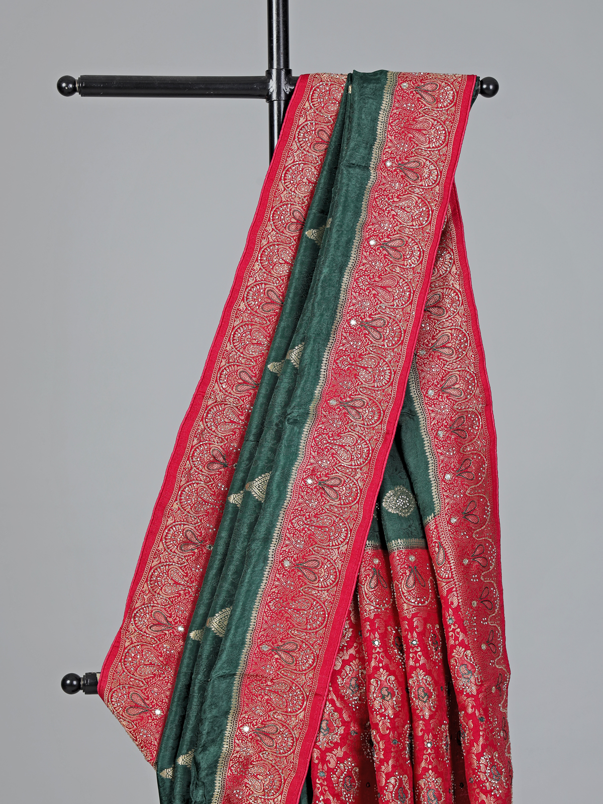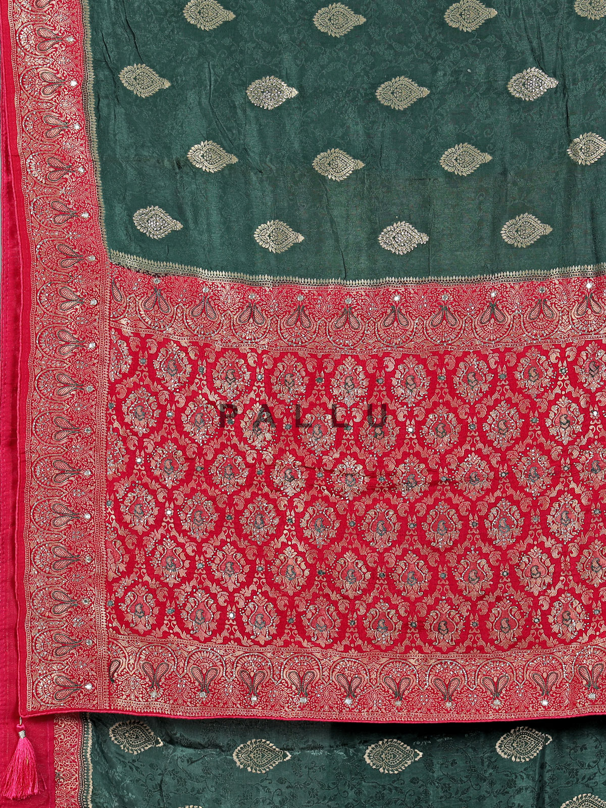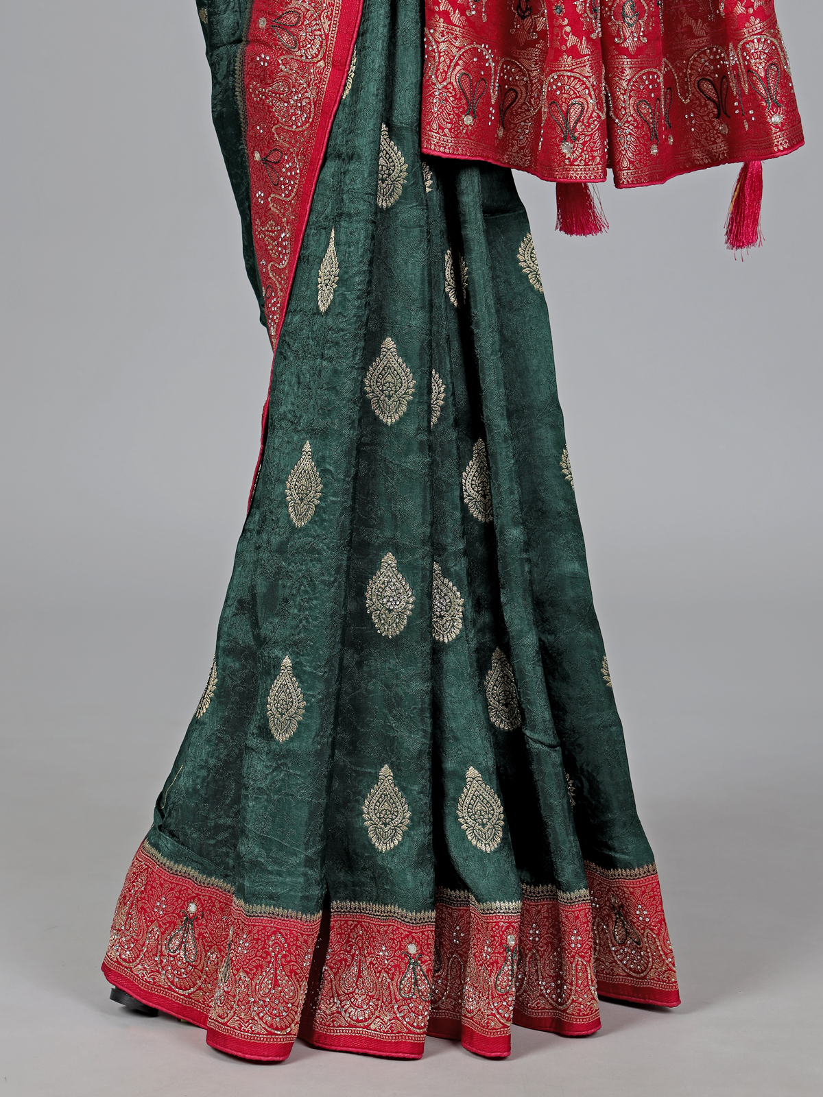 Elegant and timeless, this green dola silk saree showcases intricate cutdana, sequins, thread, mirror, stone and zari detailing. The contrast border and pallu enhance its festive charm, making it ideal for weddings and grand occasions. Comes with an unstitched blouse piece for a flawless look.