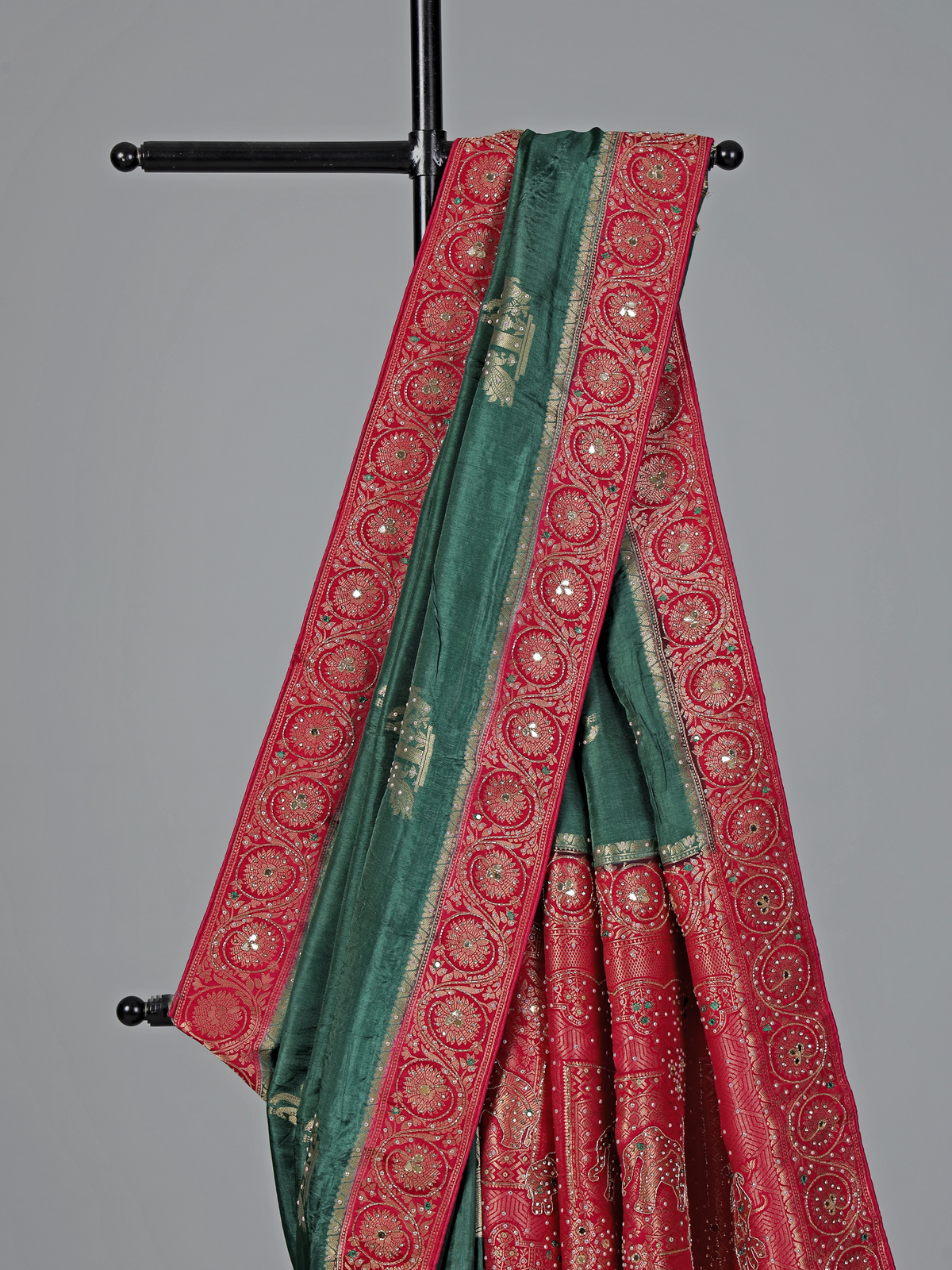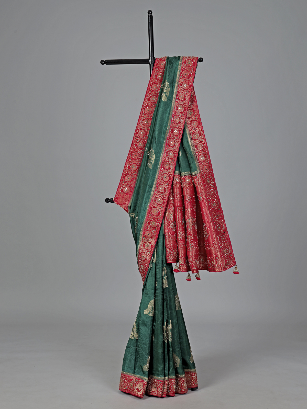 Timeless and elegant, this green dola silk saree is adorned with intricate cutdana, sequins, thread, mirror, stone and zari embellishments. The contrast border and pallu add graceful definition, making it ideal for festive occasions. Includes an unstitched blouse piece for a refined and tailored look.