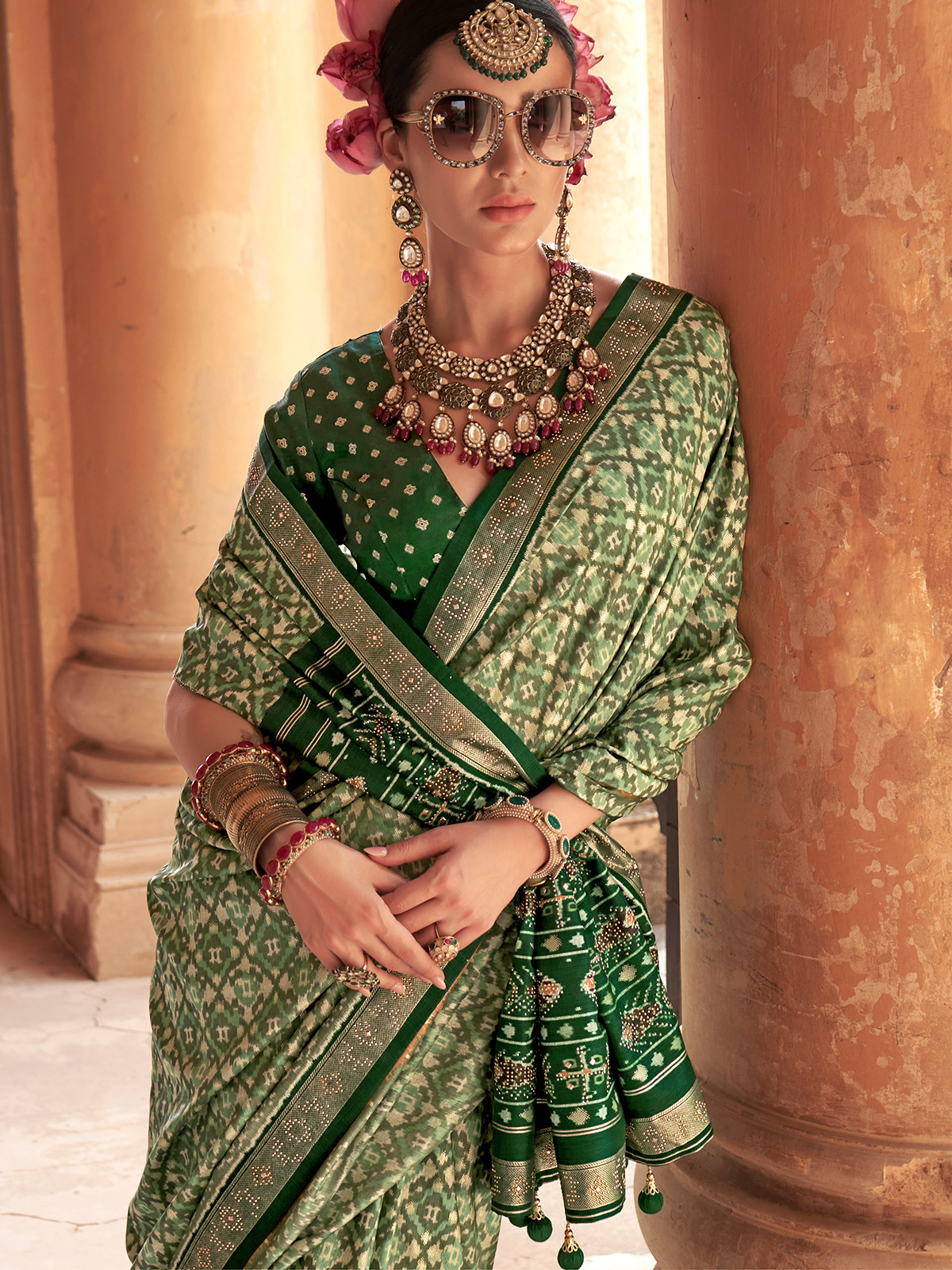 This green patola silk saree brings together rich printed patterns and sparkling stone and zari details, creating an elegant ethnic look. Ideal for weddings, mehendi, and festive celebrations, it drapes beautifully. An unstitched blouse is included for customised finishing.