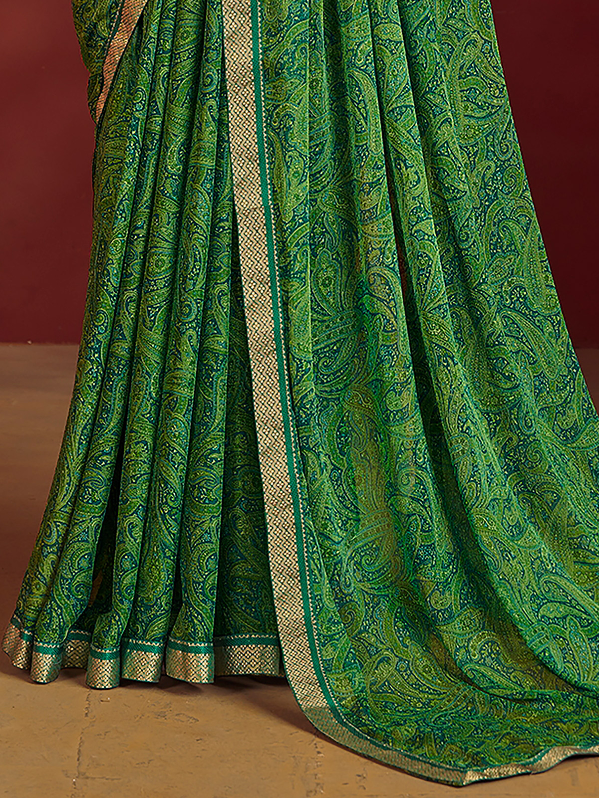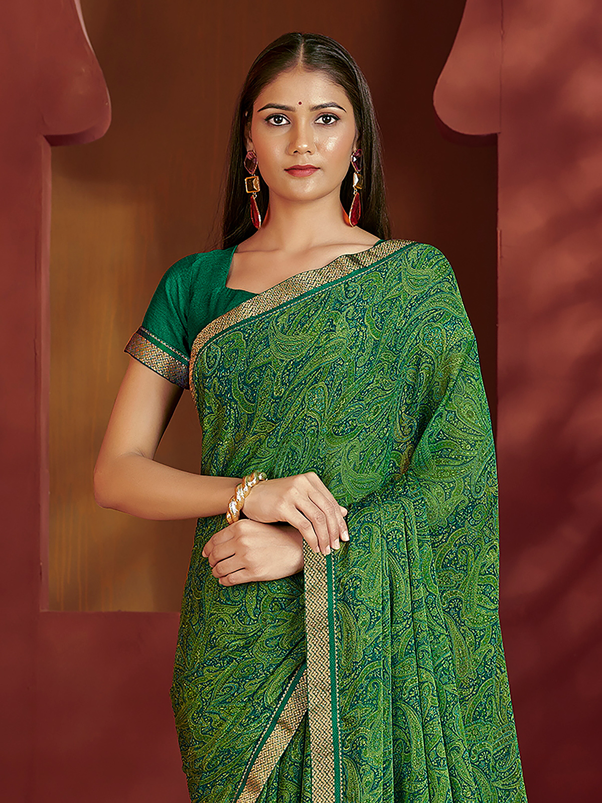 Crafted in soft chiffon, this green saree features refined printed patterns enhanced with lace accents and zari work borders. The graceful drape adds feminine charm and comfort. Paired with an unstitched blouse piece, it is suitable for festive gatherings, puja ceremonies, casual wear and mehndi celebrations.