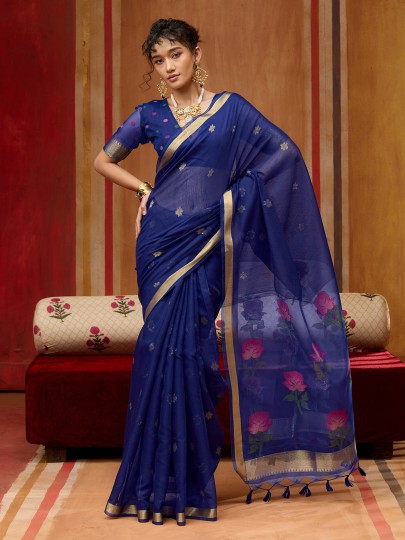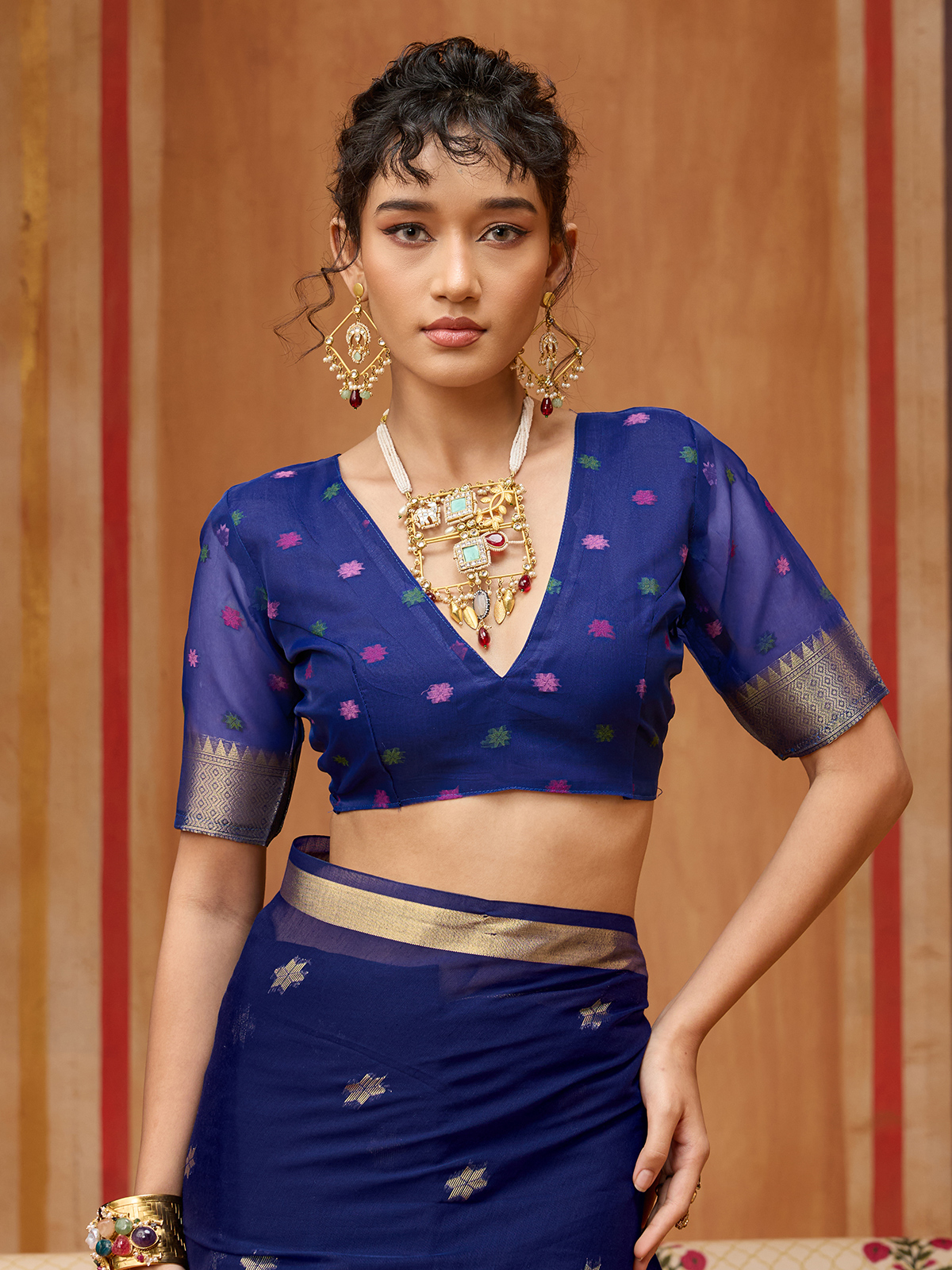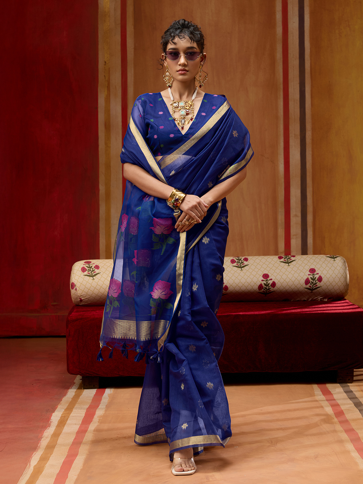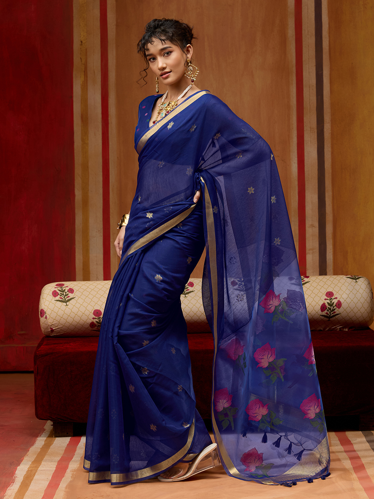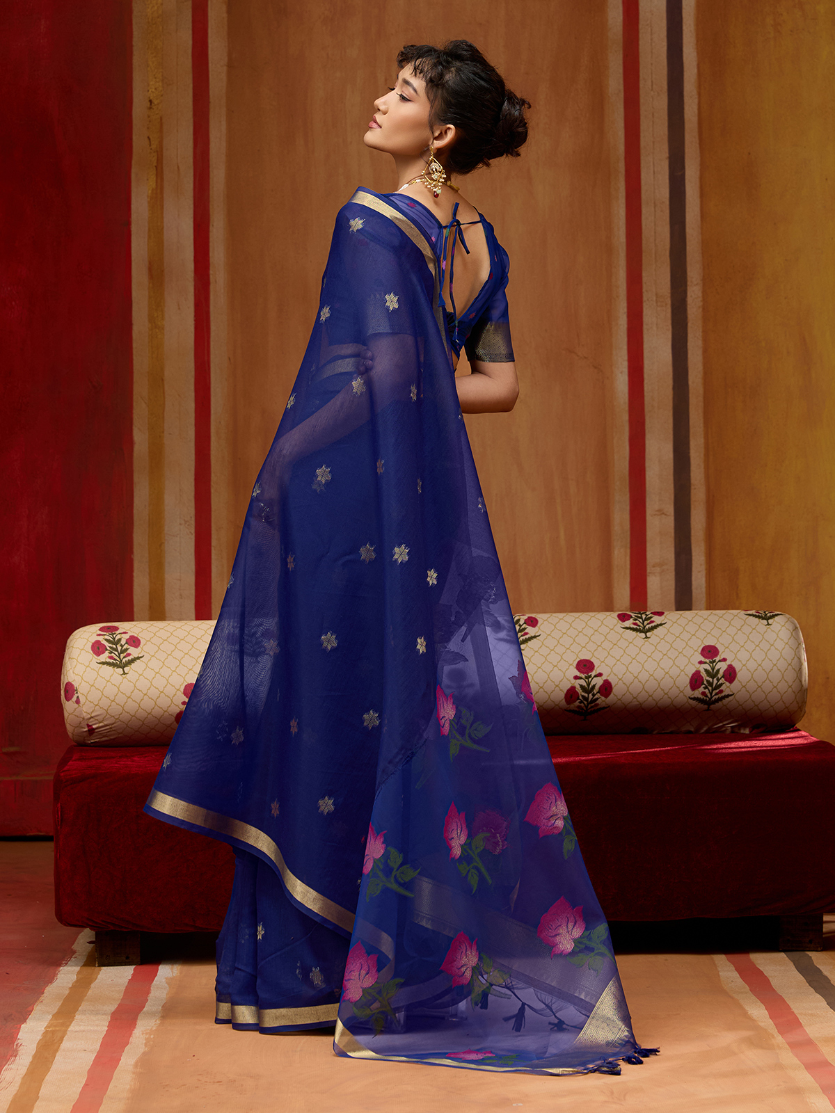 Designed with fine handloom zari weaving and vibrant floral colouring patterns, this green munga cotton organza saree delivers timeless festive elegance. Perfect for sangeet, partywear and celebrations, it drapes effortlessly with a sheer finish. The saree comes with an unstitched blouse, allowing customized tailoring for a complete look.