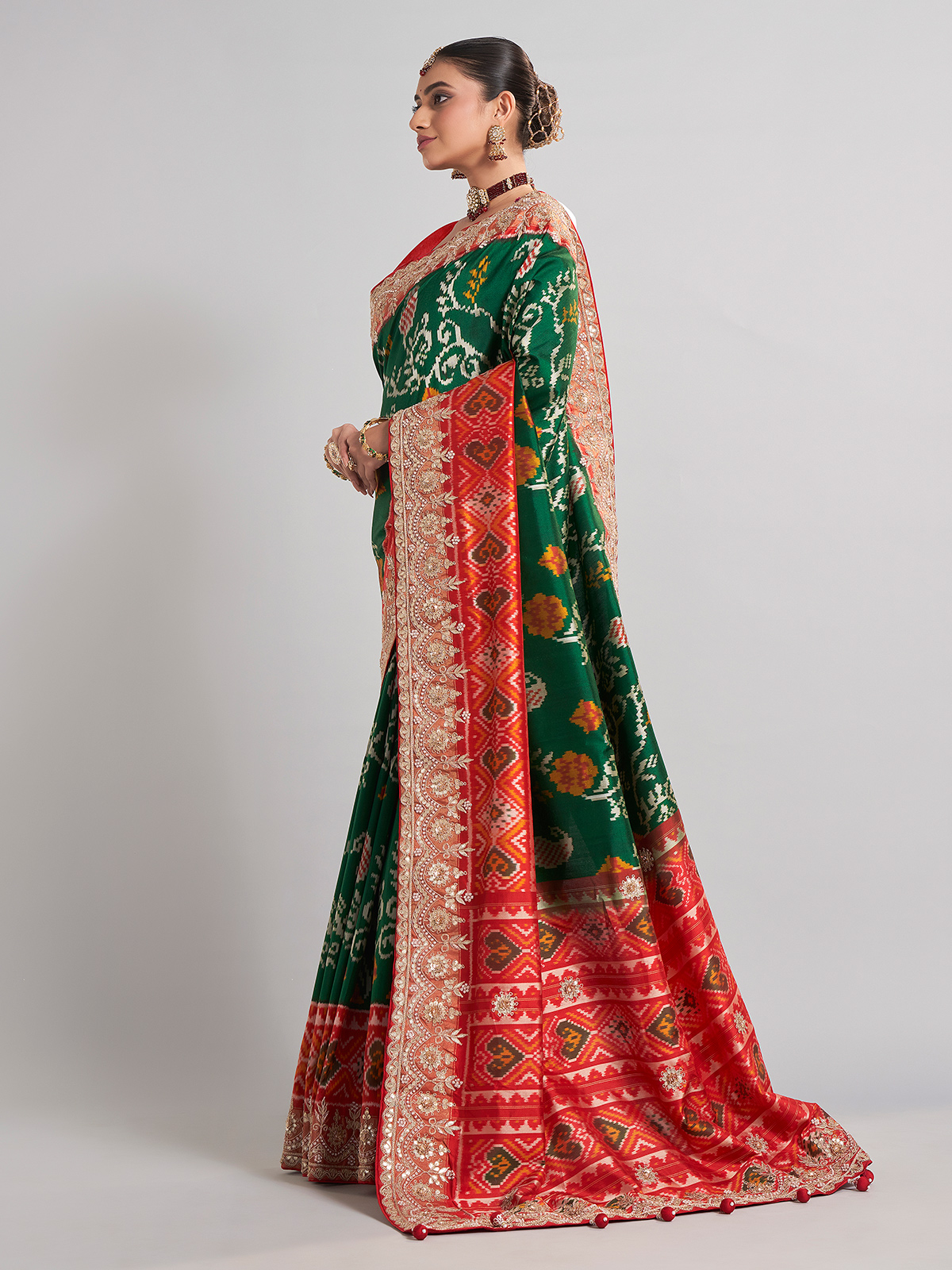 This green Hyderabadi patola silk saree blends traditional richness with a modern touch through zardosi, sequins, beads, cutdana, and a contrast border. Comes with an unstitched blouse piece.
