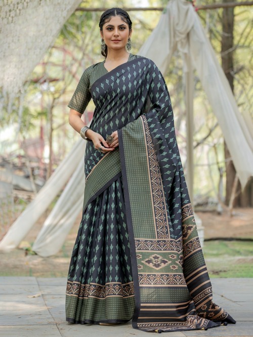 Make a statement in this stunning green Kozi silk saree. Adorned with a captivating printed pattern, it perfectly combines elegance and contemporary style. Includes an unstitched blouse piece for a customized fit.