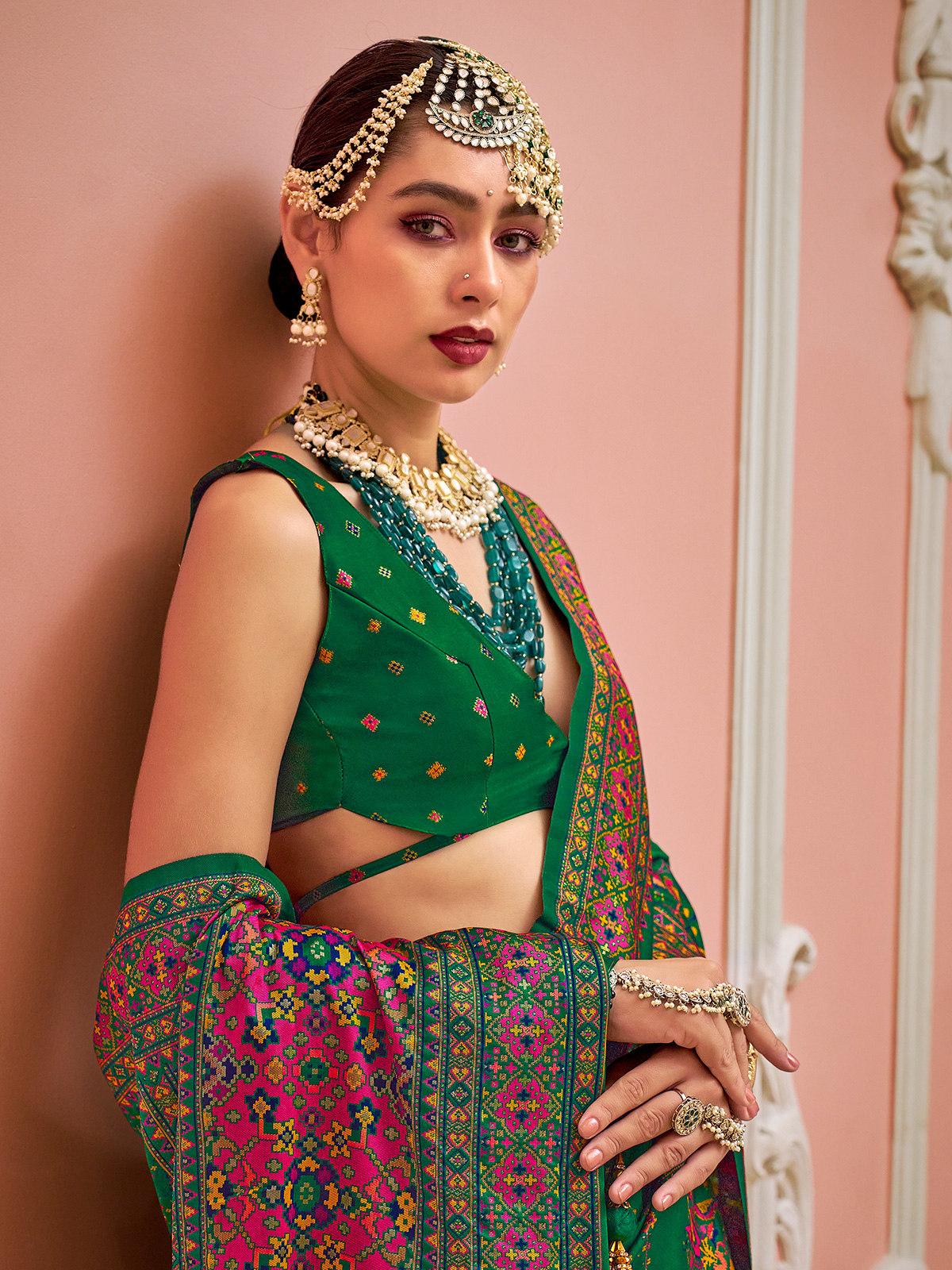 A timeless choice for traditional celebrations, this elegant green Banarasi silk saree offers rich colour and a classic drape. The detailed Meenakari print enhances its beauty with intricate craftsmanship. Perfect for bright festival occasions, it comes with an unstitched blouse for custom tailoring.