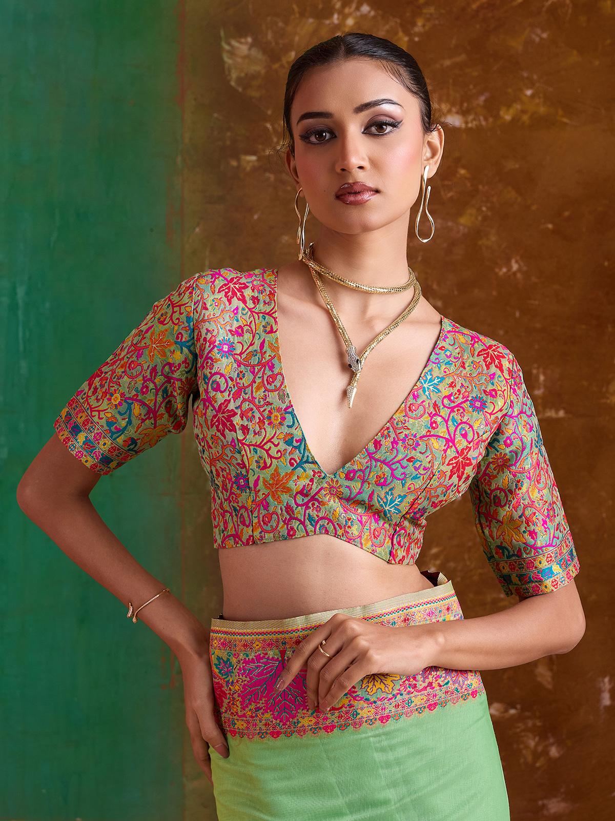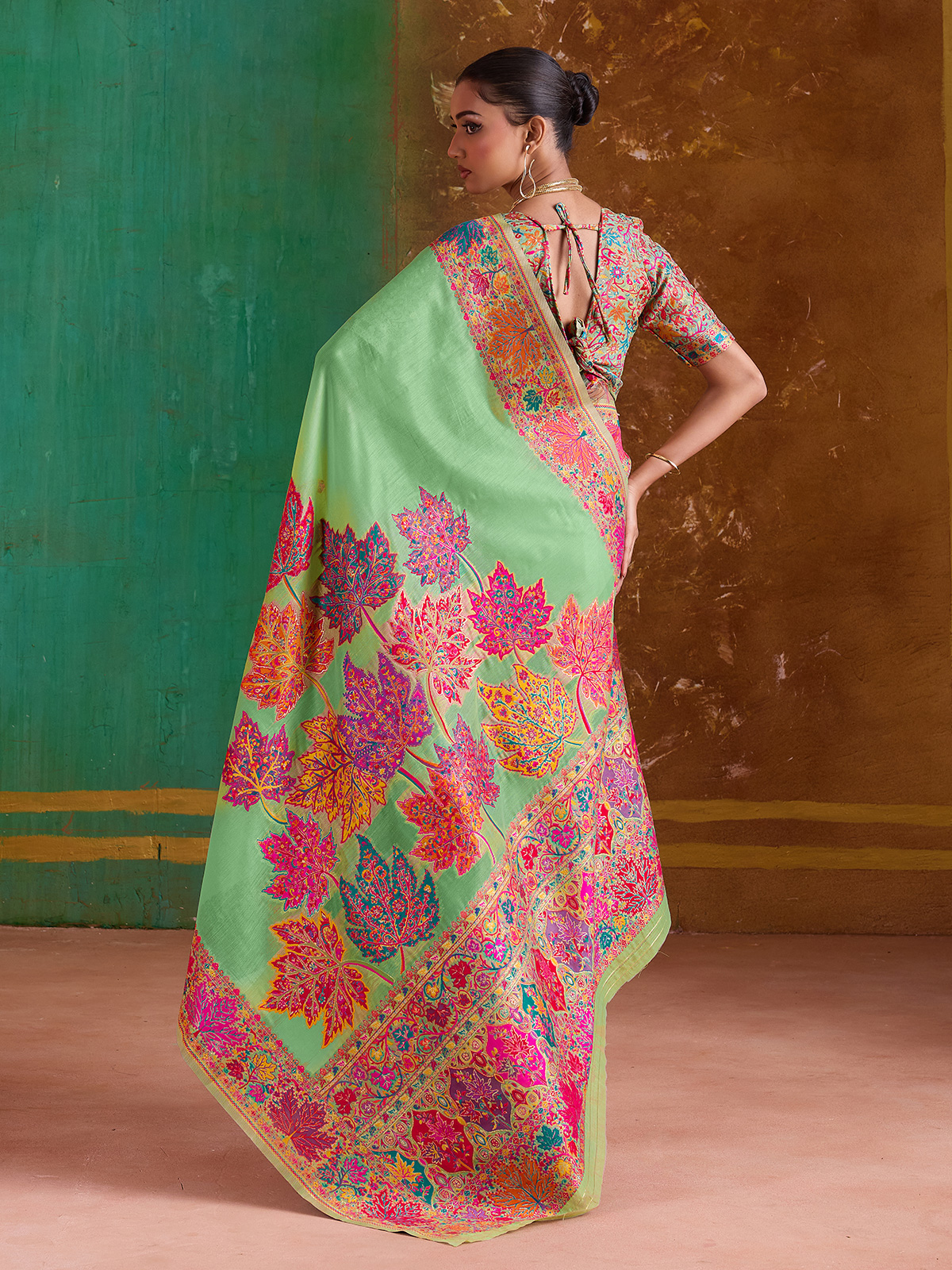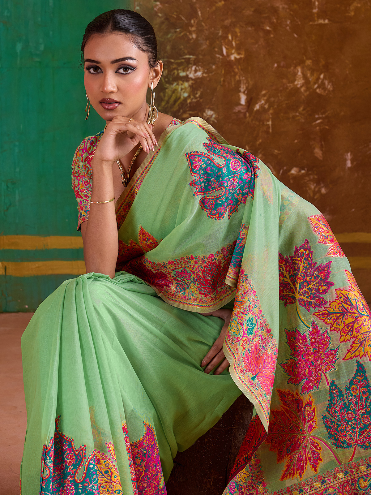 Designed with detailed embroidery and smooth modal cotton pashmina weaving, this green saree offers a fresh and elegant festive look. Comfortable and stylish, it is ideal for partywear and celebrations. The saree comes with an unstitched blouse, providing versatility for personalized tailoring.
