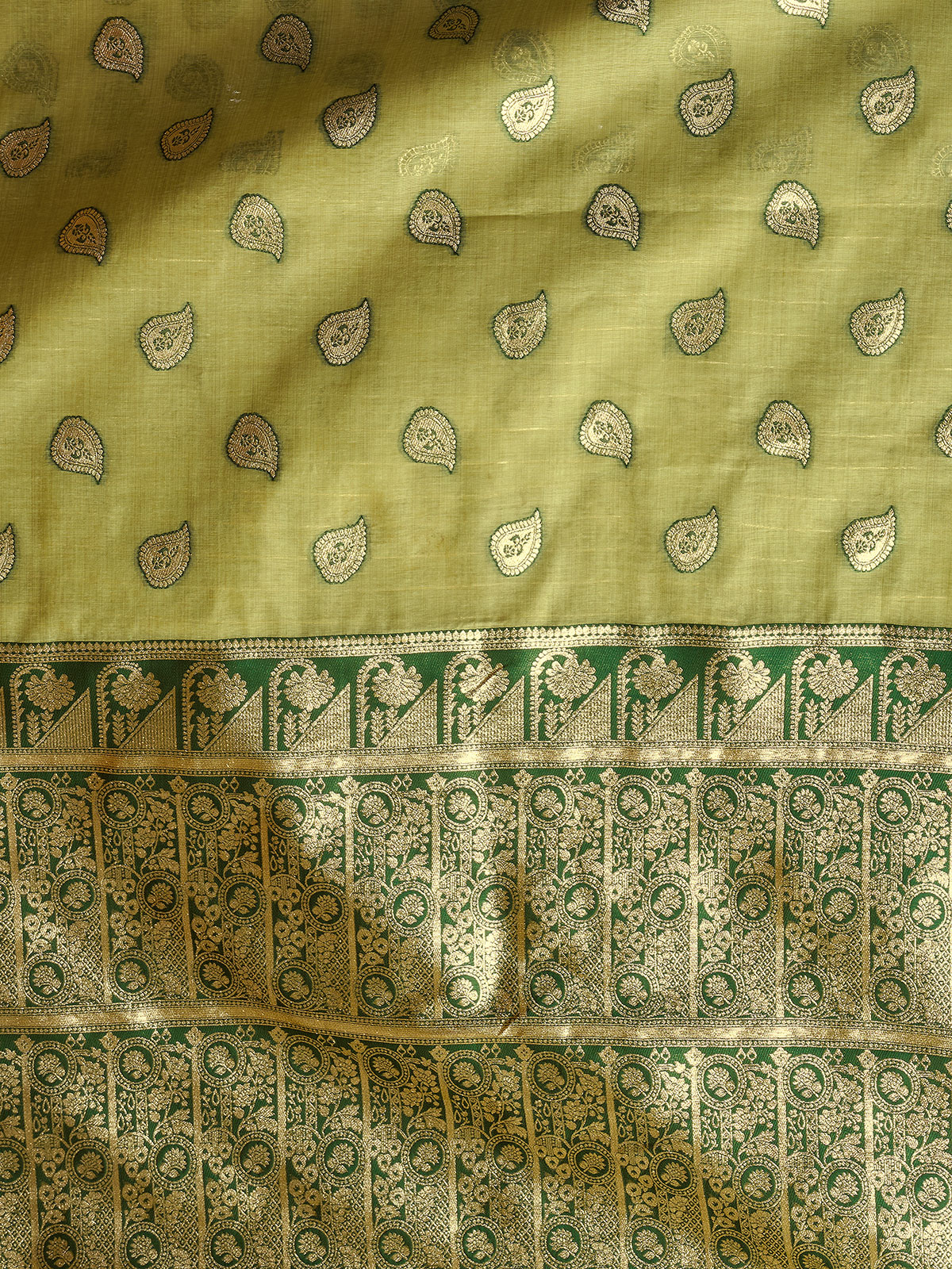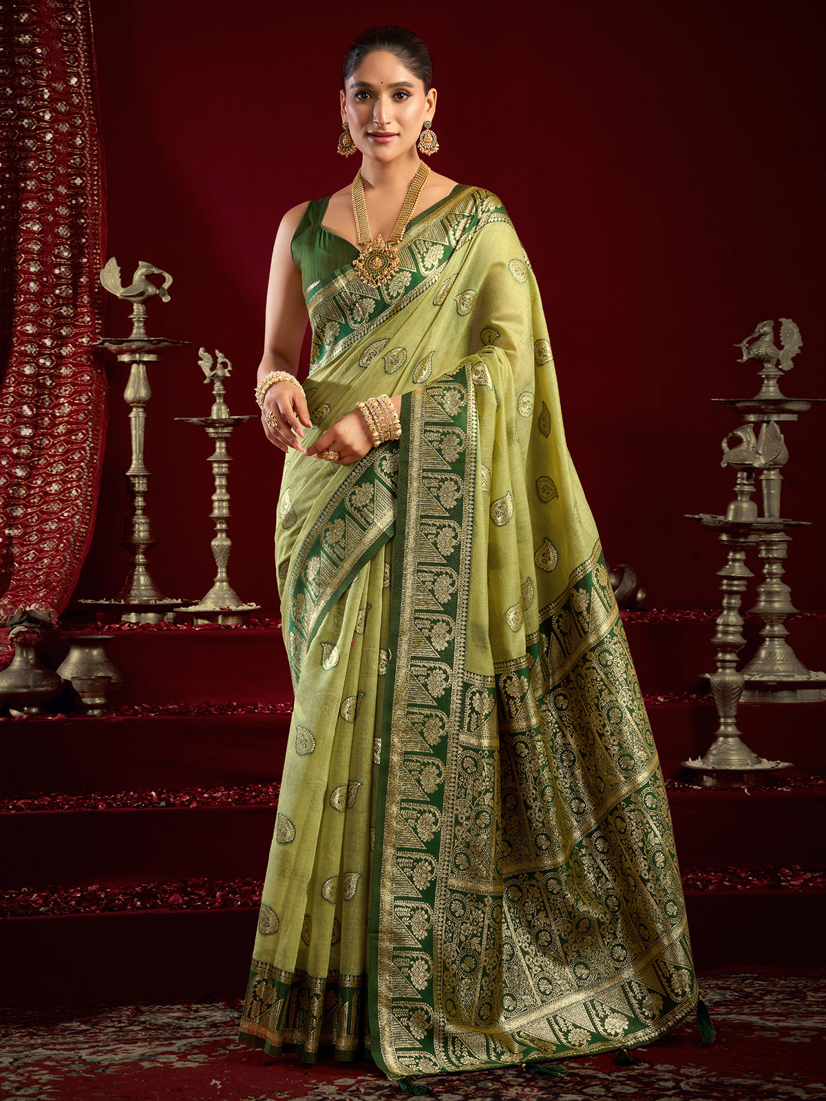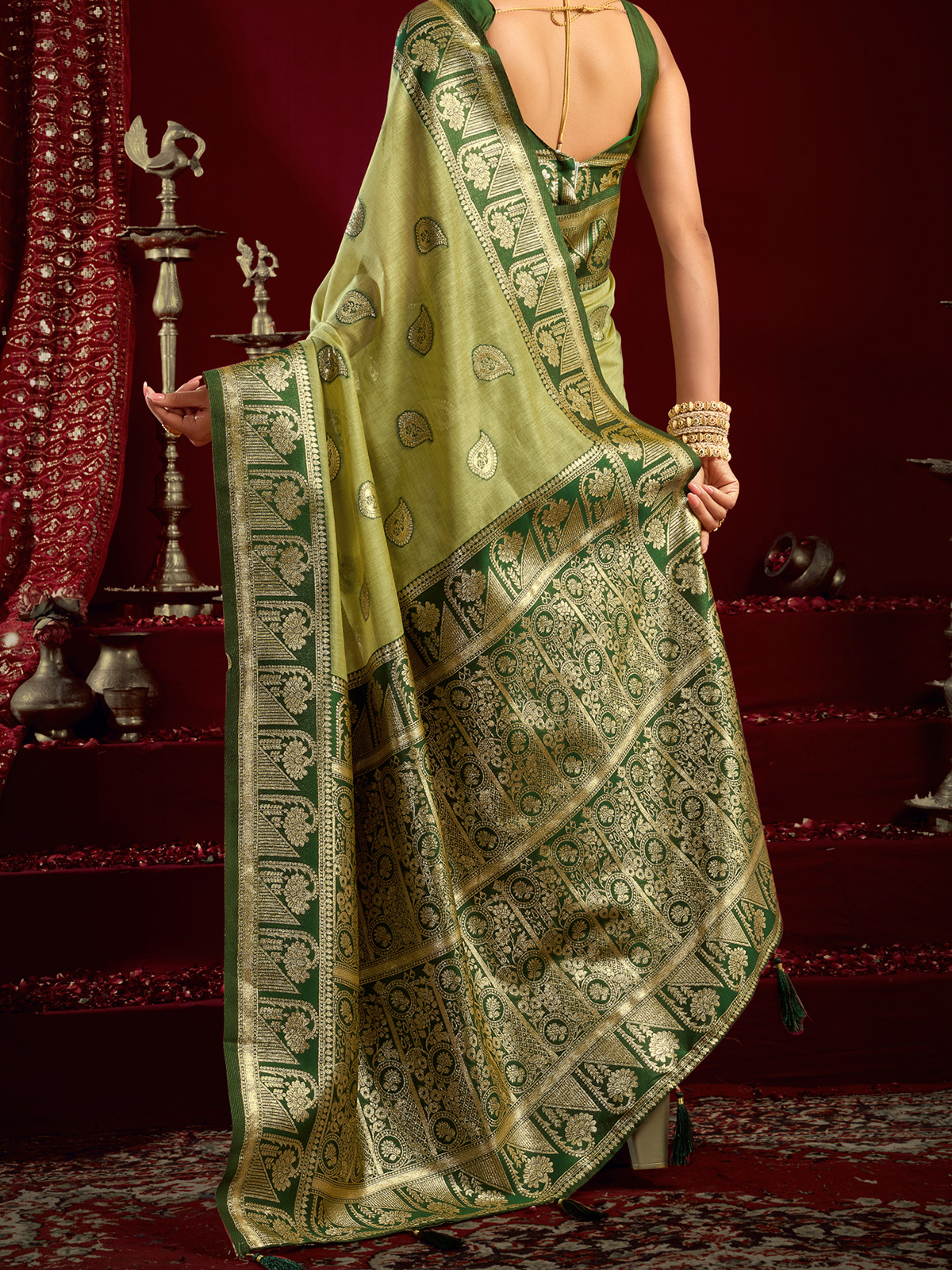 Embrace timeless charm with this green modal silk banarasi saree featuring intricate zari detailing. Its soft, graceful fall and included unstitched blouse make it perfect for weddings, mehndi functions, receptions, and festive gatherings, adding a touch of cultural beauty to your celebrations.