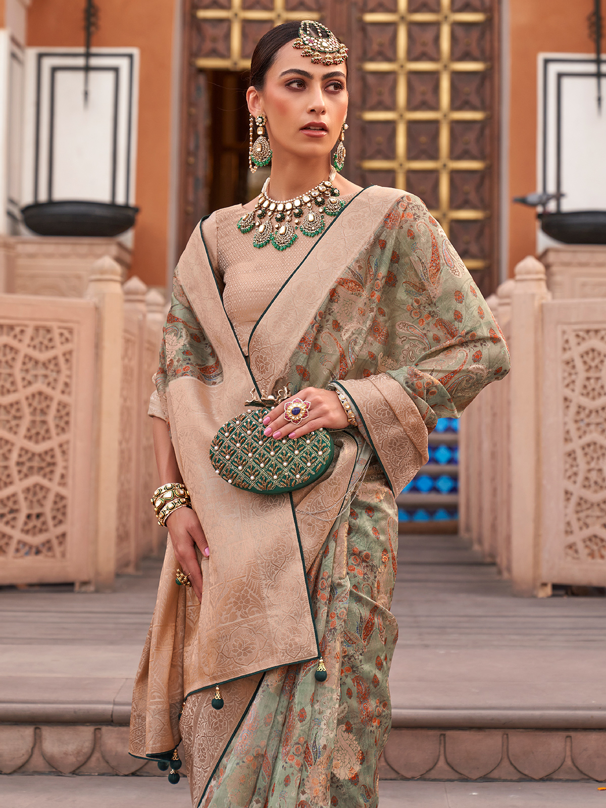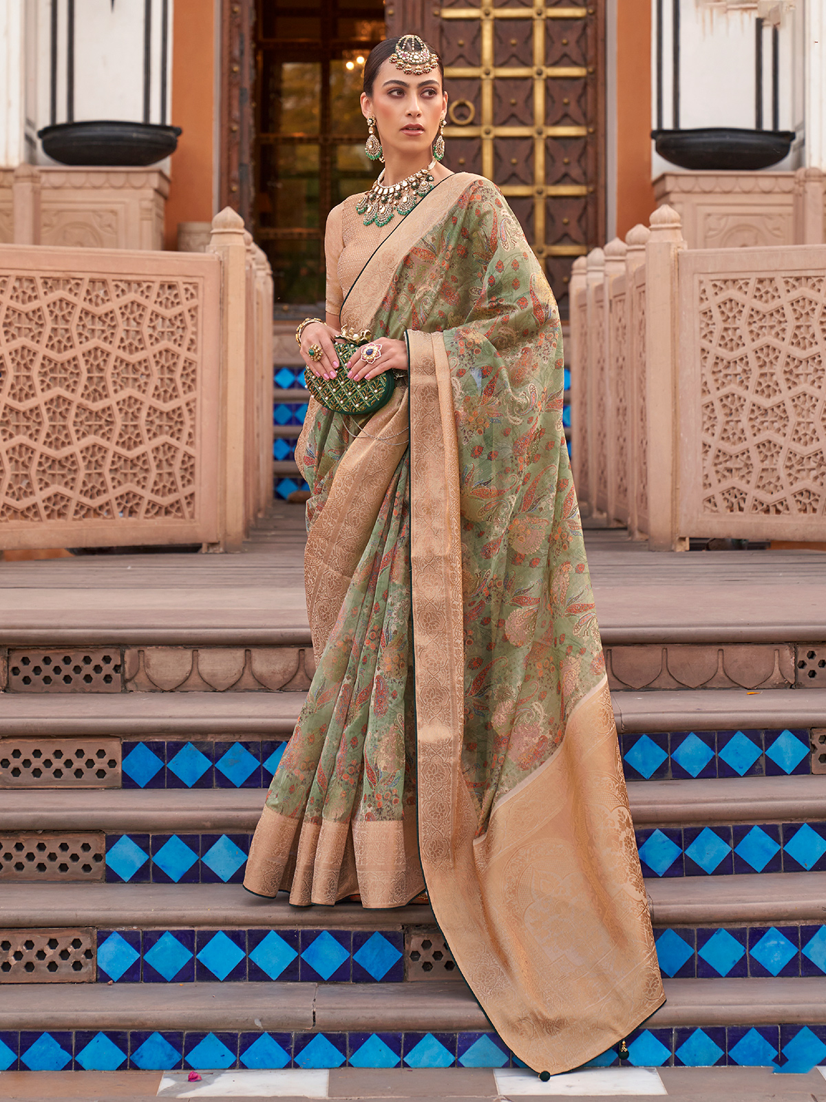 Gracefully crafted in green organza, this saree blends traditional zari weaving with modern digital prints. Its luminous finish makes it perfect for wedding and festive wear. Includes an unstitched blouse to complete your personalized look.