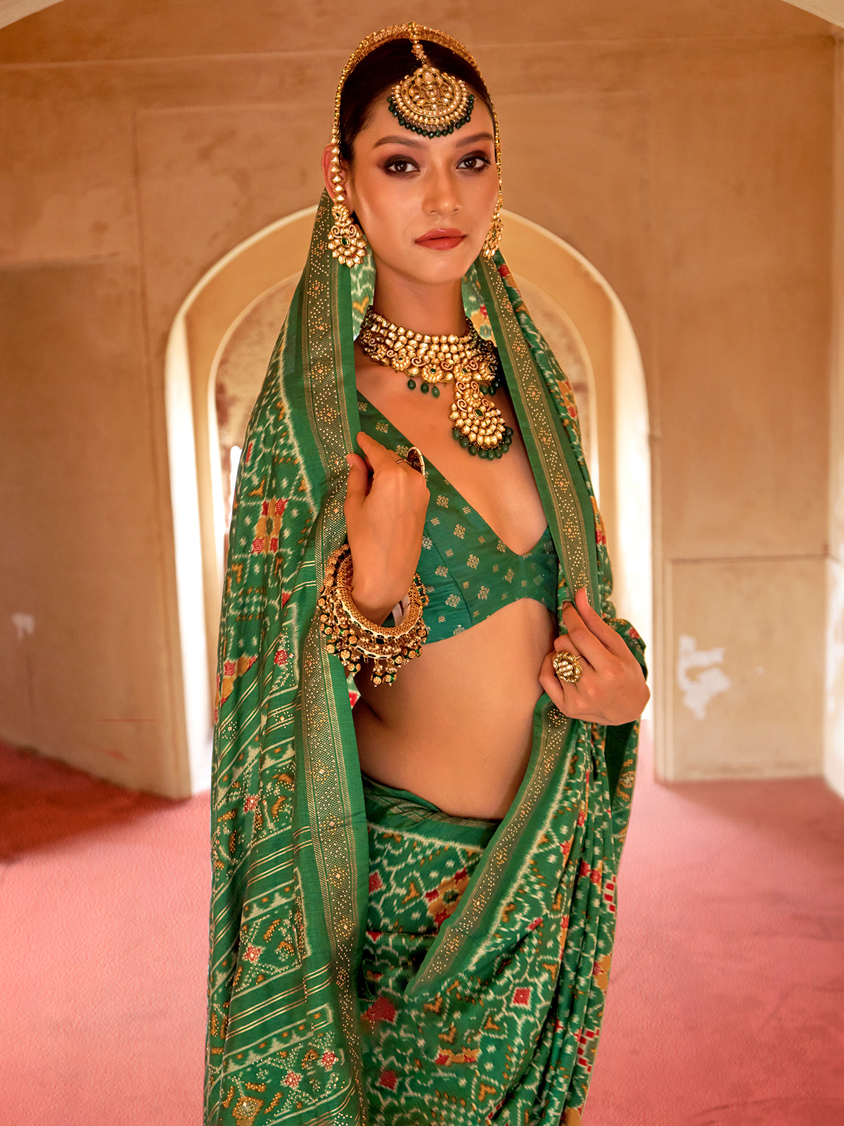 A vibrant green patola silk saree showcasing intricate ikkat patterns and a shimmering lace-stone border. The coordinated blouse enhances the traditional charm, making it an ideal pick for cultural celebrations and family gatherings.