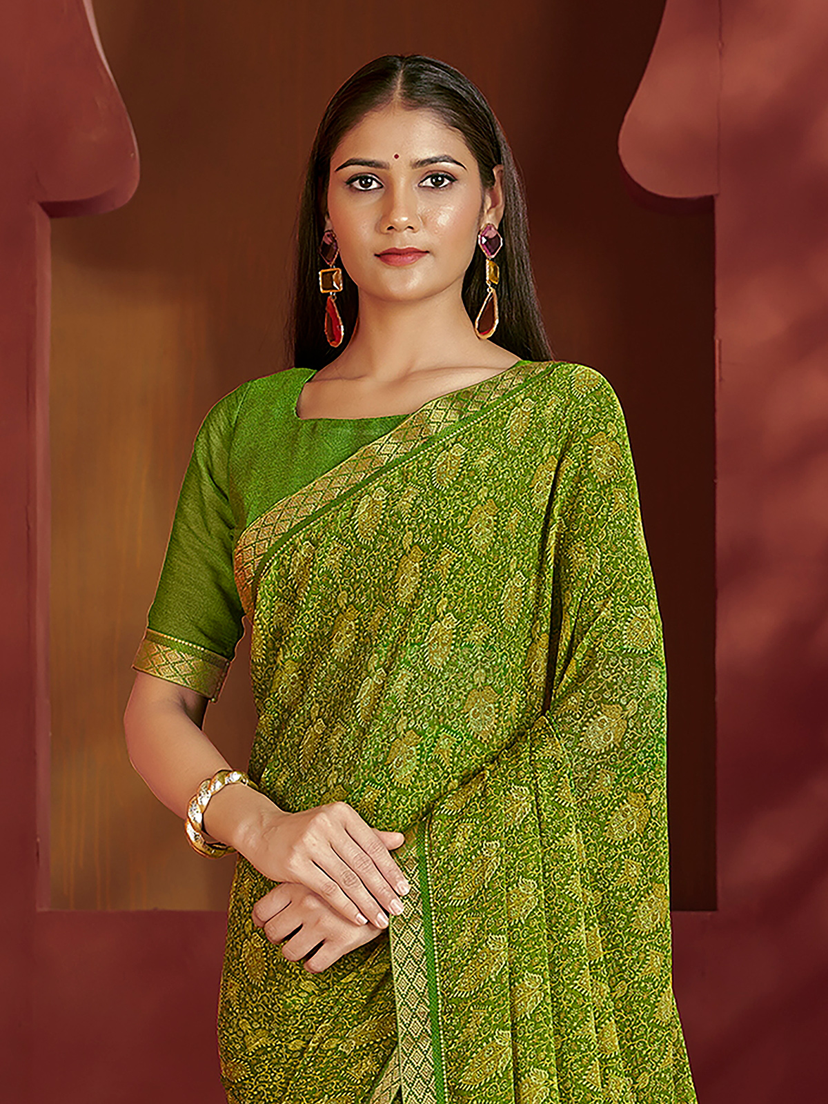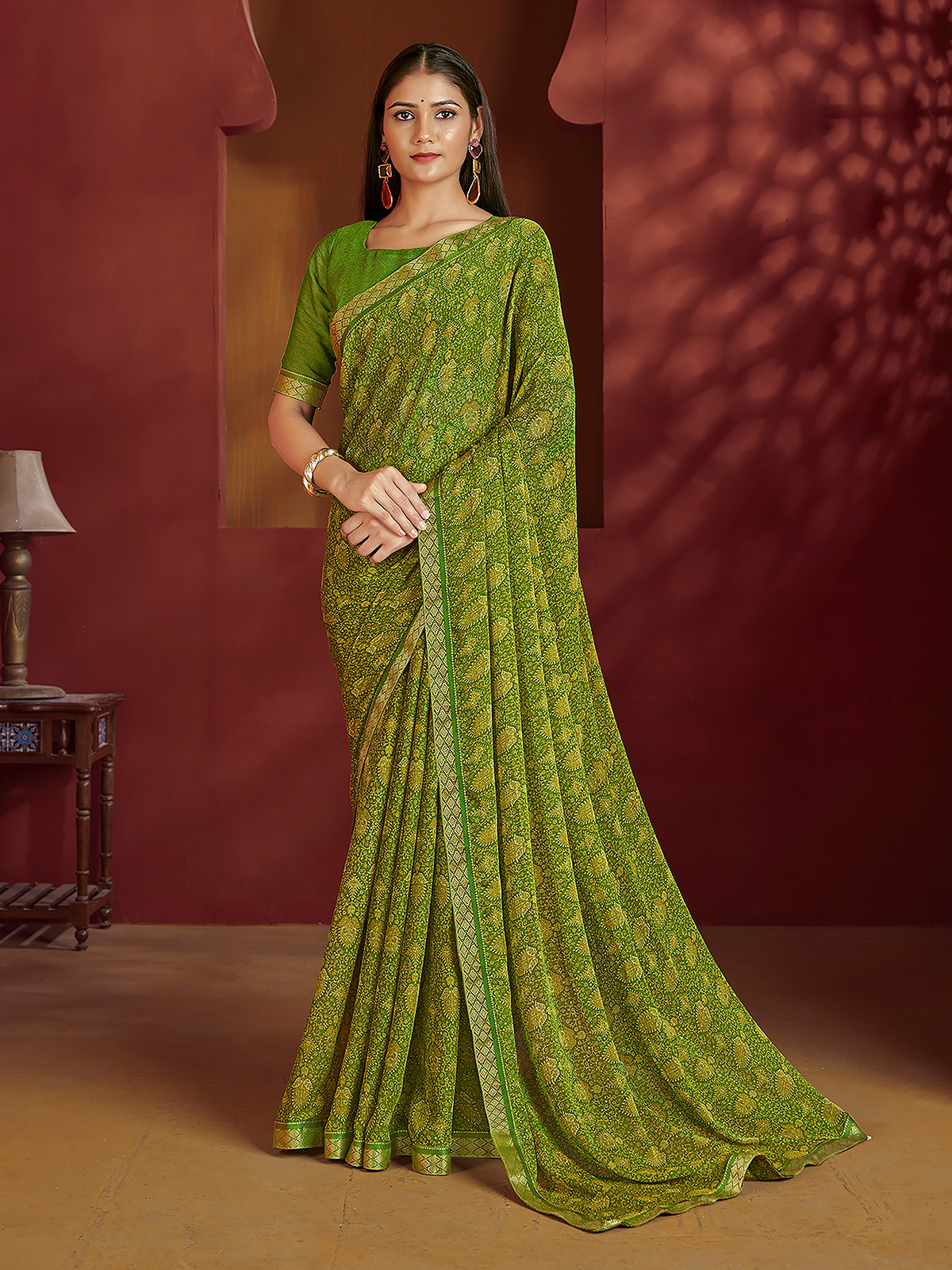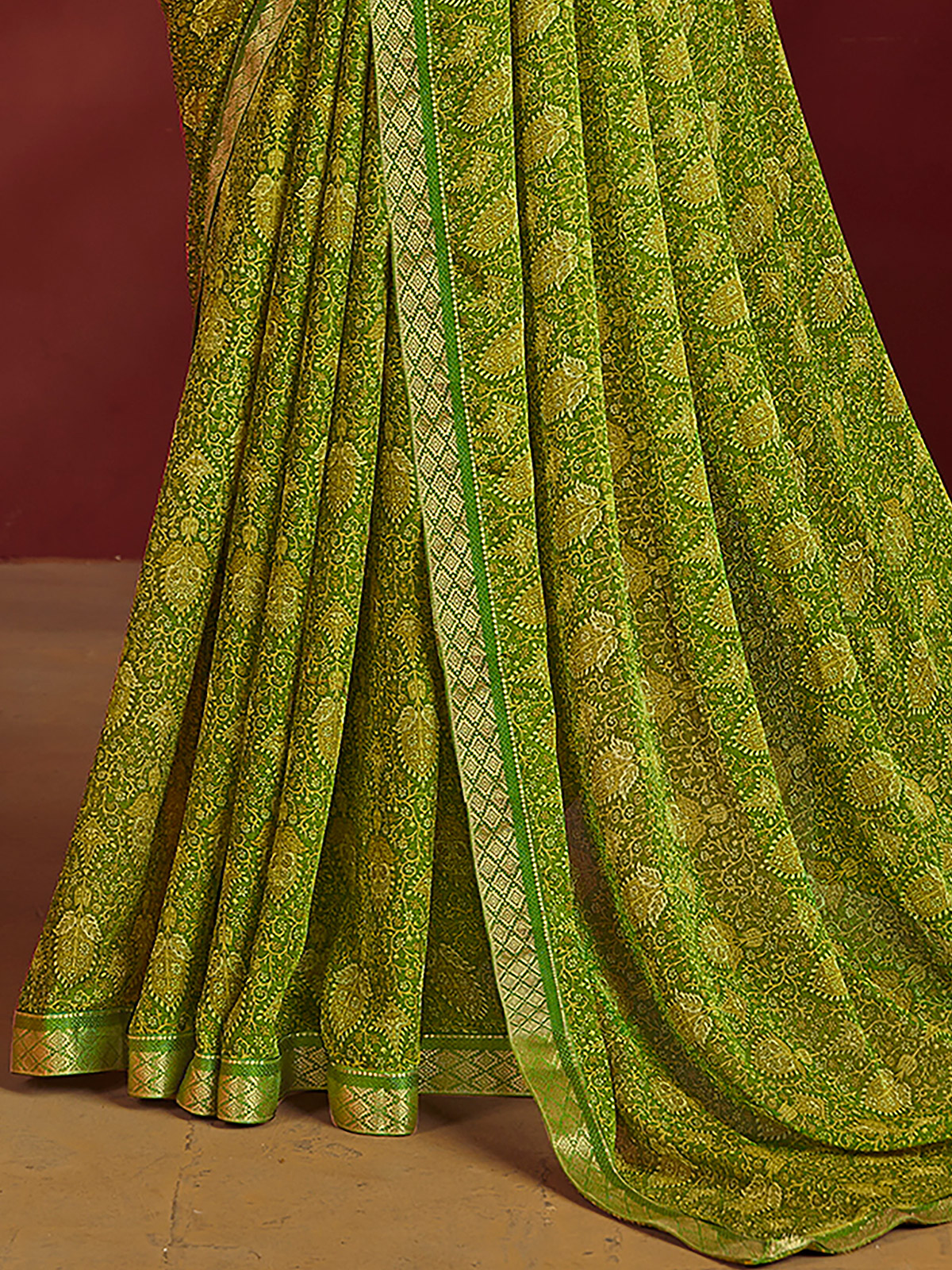 Crafted in airy chiffon, this green saree showcases charming printed designs highlighted with lace accents and zari work along the border. The soft drape adds effortless elegance and comfort. Paired with an unstitched blouse piece, it is perfect for festive wear, puja ceremonies, casual gatherings and mehndi celebrations.