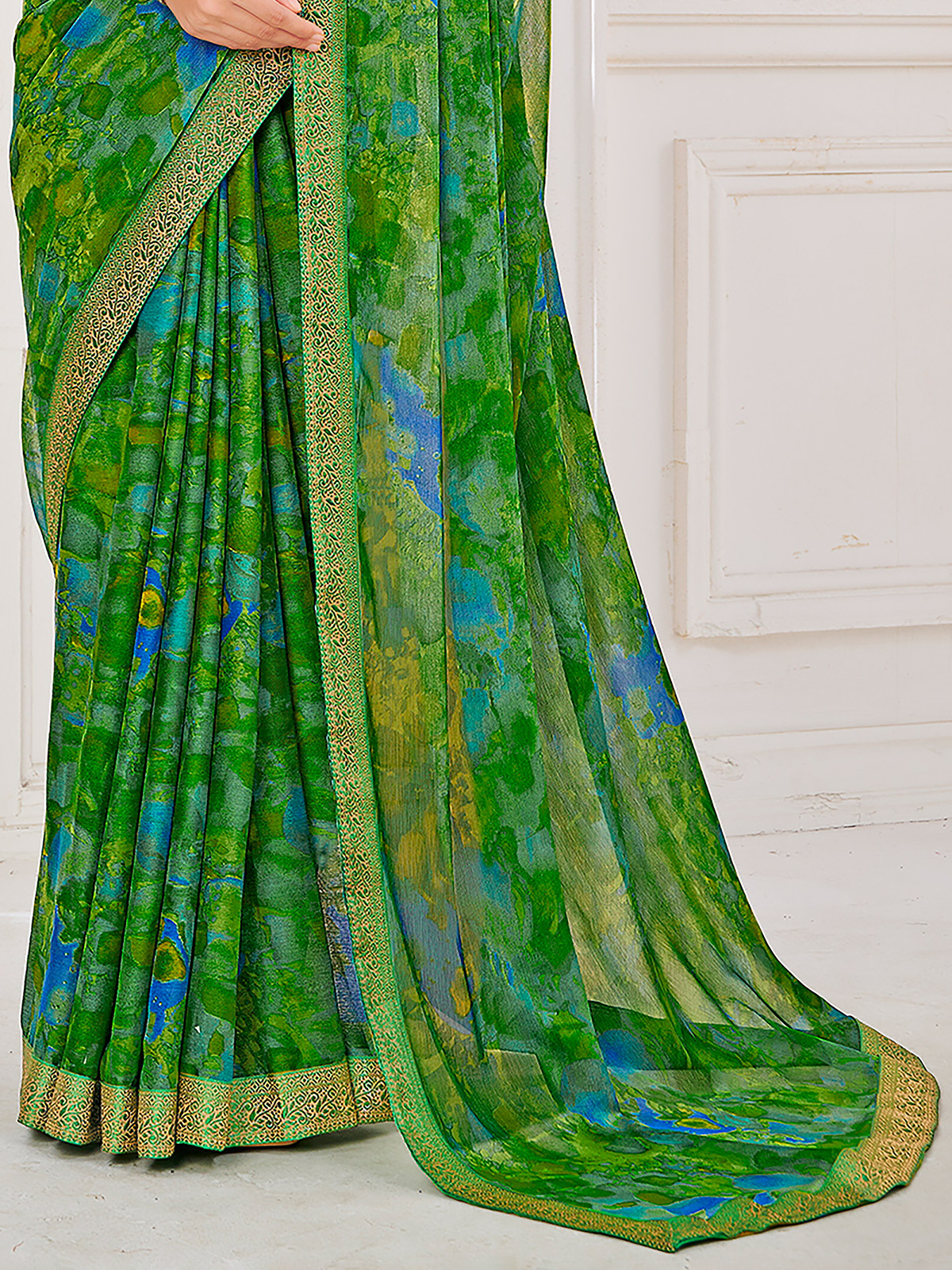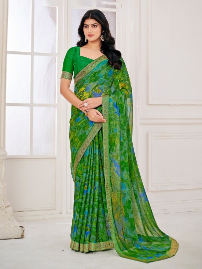 Green Printed Zari Work Georgette Saree