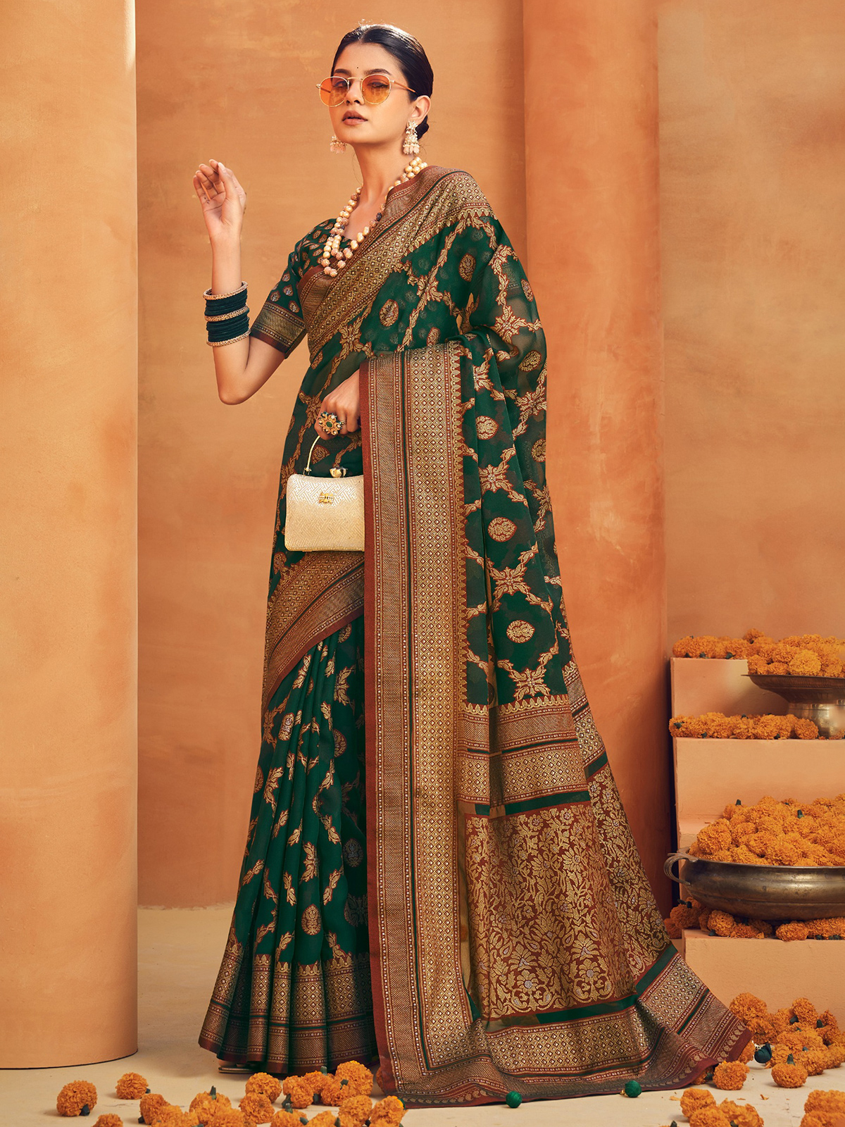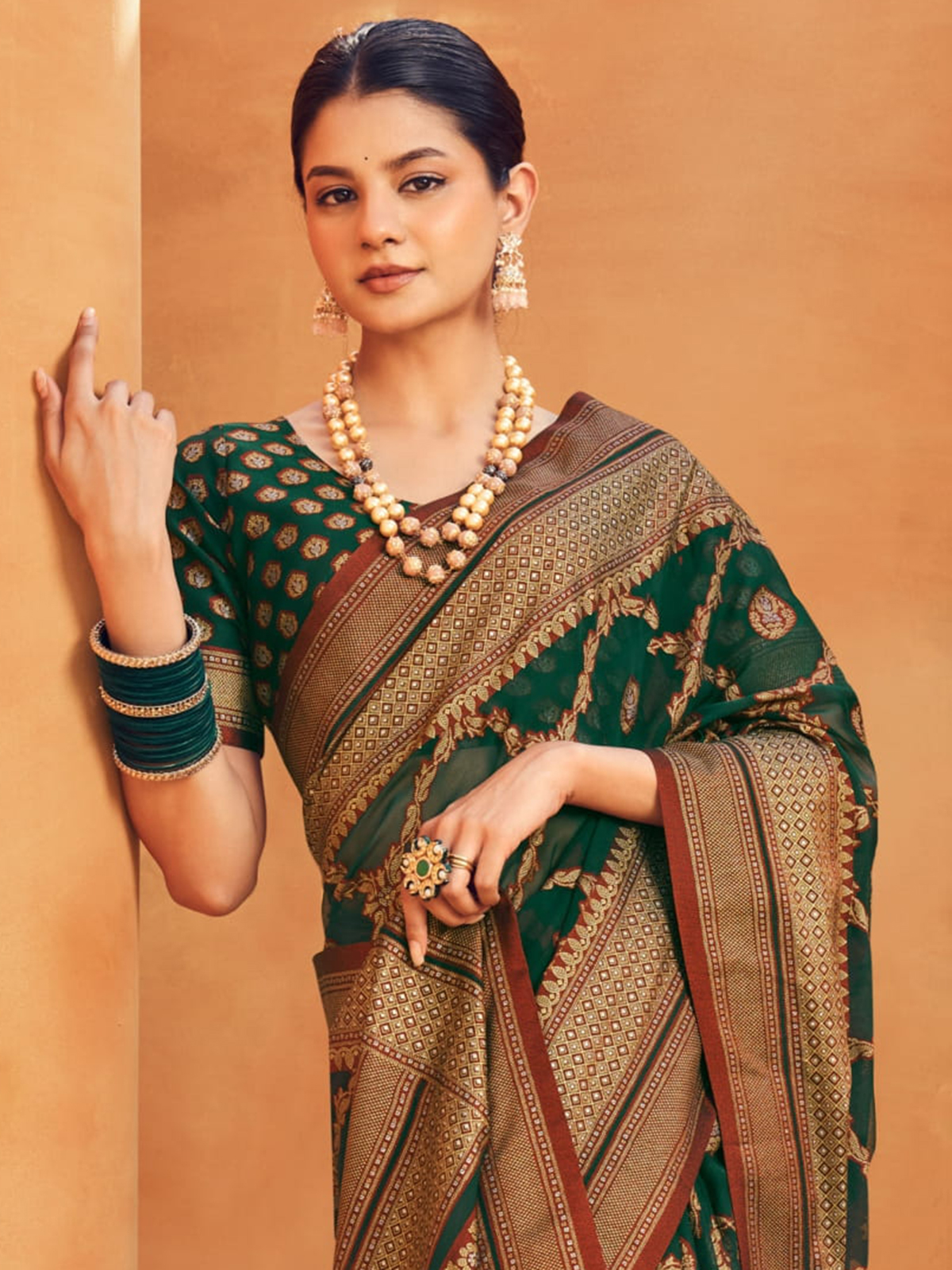 Perfect for traditional celebrations, this green georgette saree exudes luxury with its striking zari detailing. Paired with an unstitched blouse piece, it completes your festive ensemble beautifully.