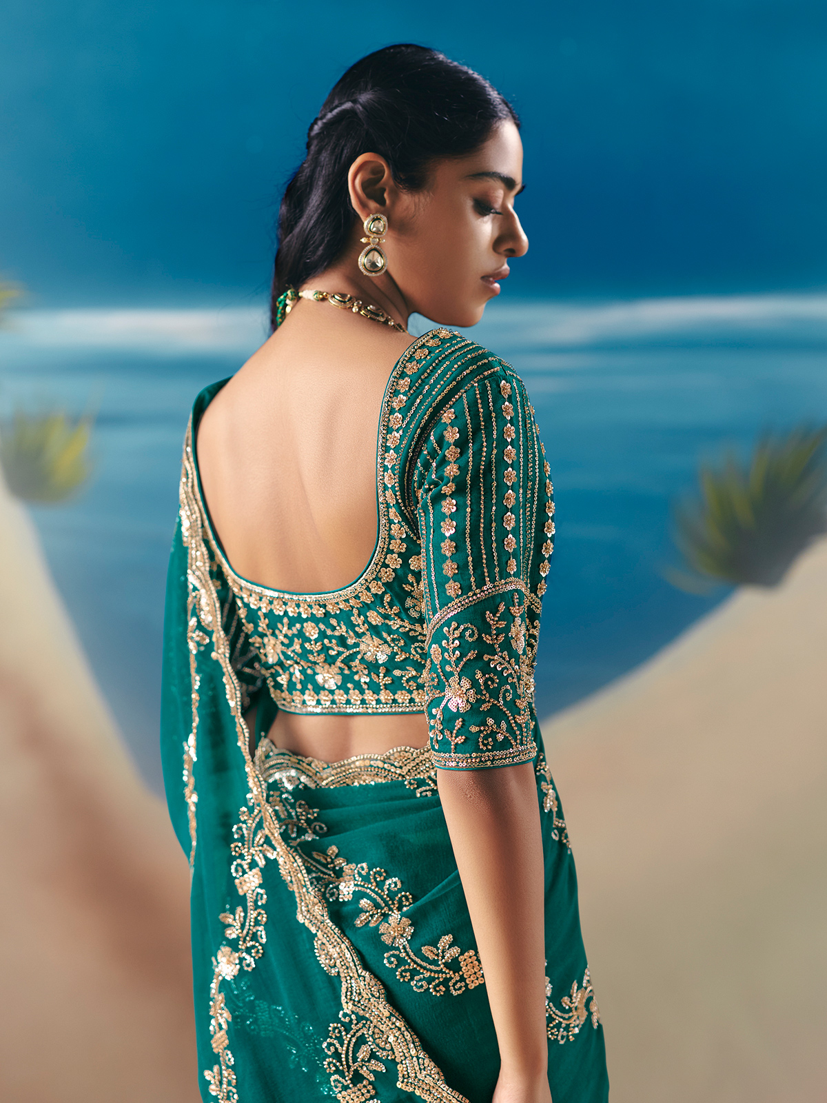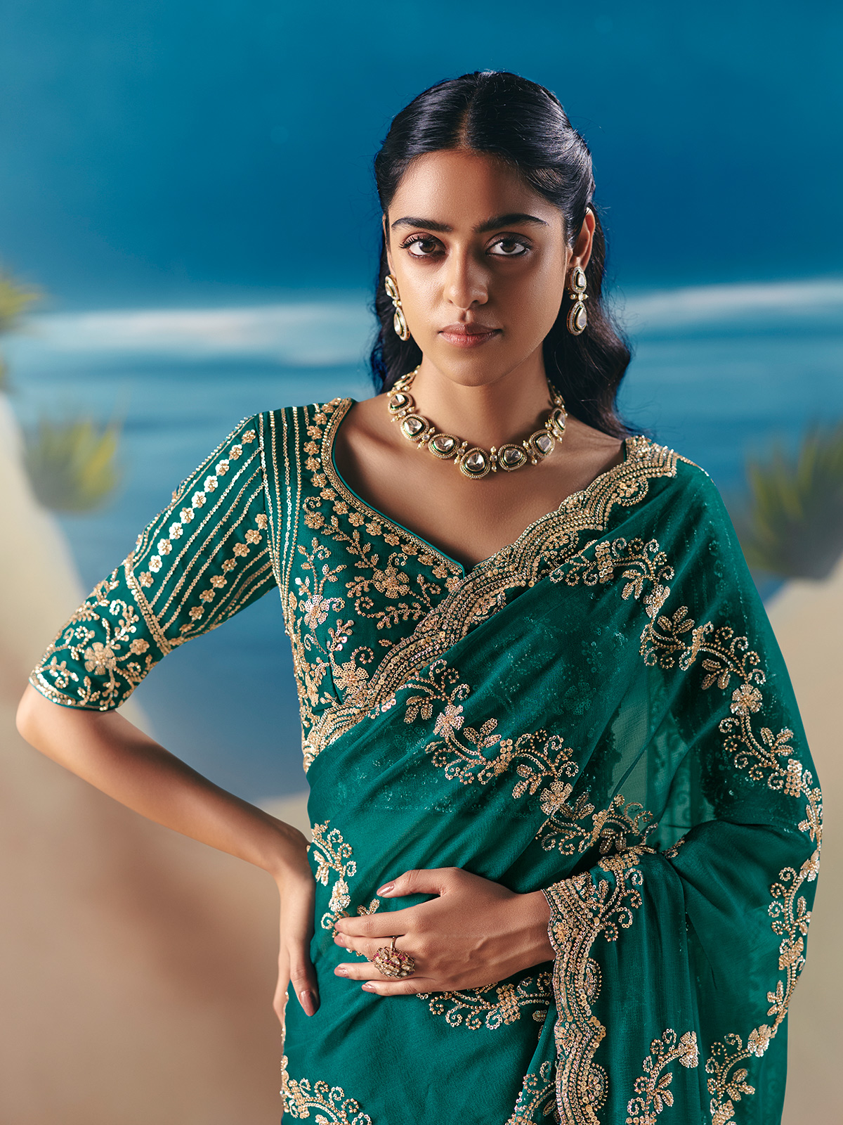 This green satin organza saree sparkles with sequins, beads, stones and cutdana, creating a lively festive vibe. The fluid drape makes it perfect for mehendi, weddings and joyous celebrations. With an unstitched blouse included, it offers customizable elegance with refreshing, vibrant charm.
