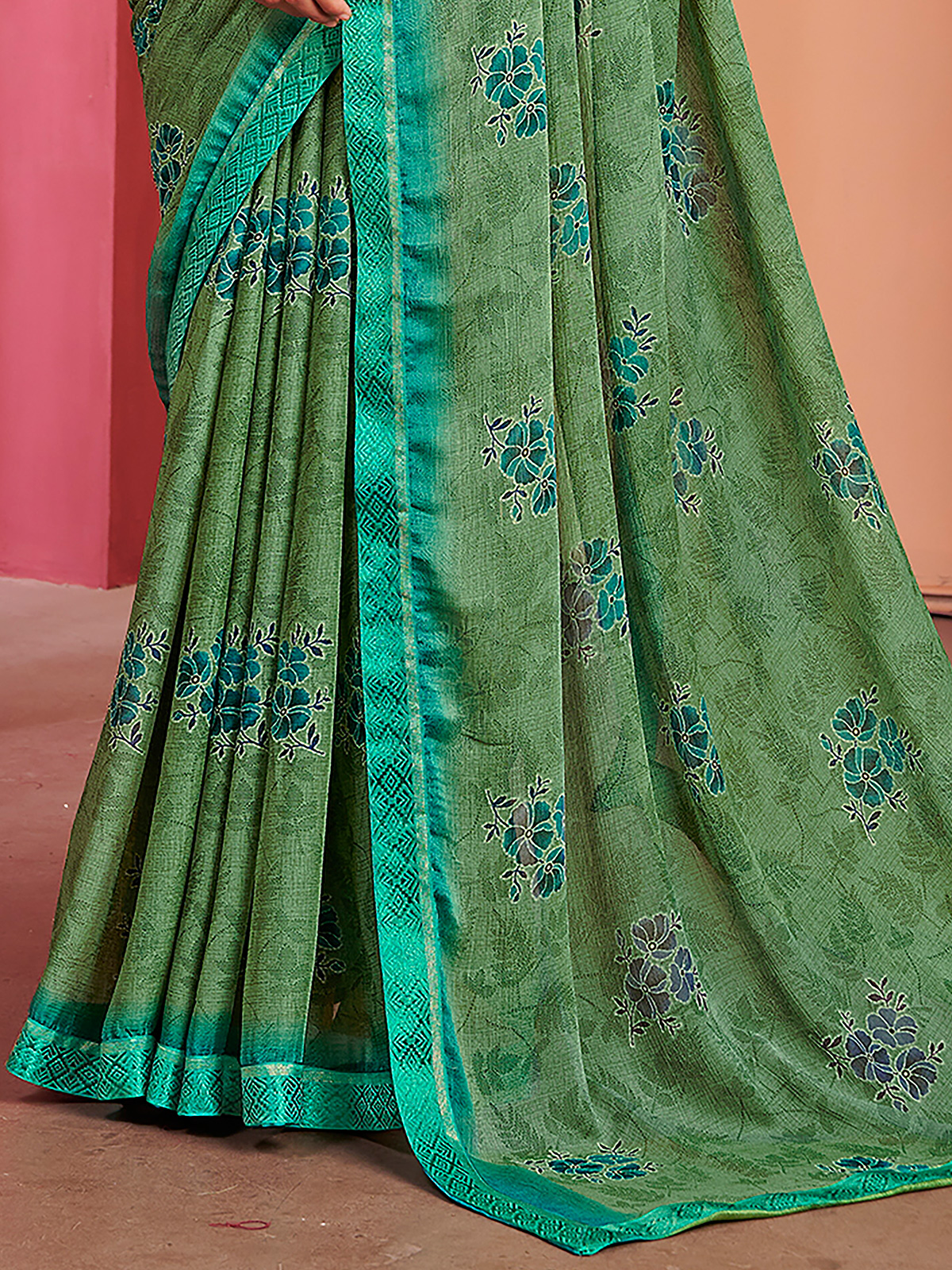 This beautiful green georgette saree showcases soft shading blended with floral printed motifs for a refreshing ethnic appeal. Accented with delicate lace detailing, it drapes effortlessly and feels light on the skin. Paired with an unstitched blouse piece, it is a perfect choice for casual wear, puja ceremonies and festive moments.