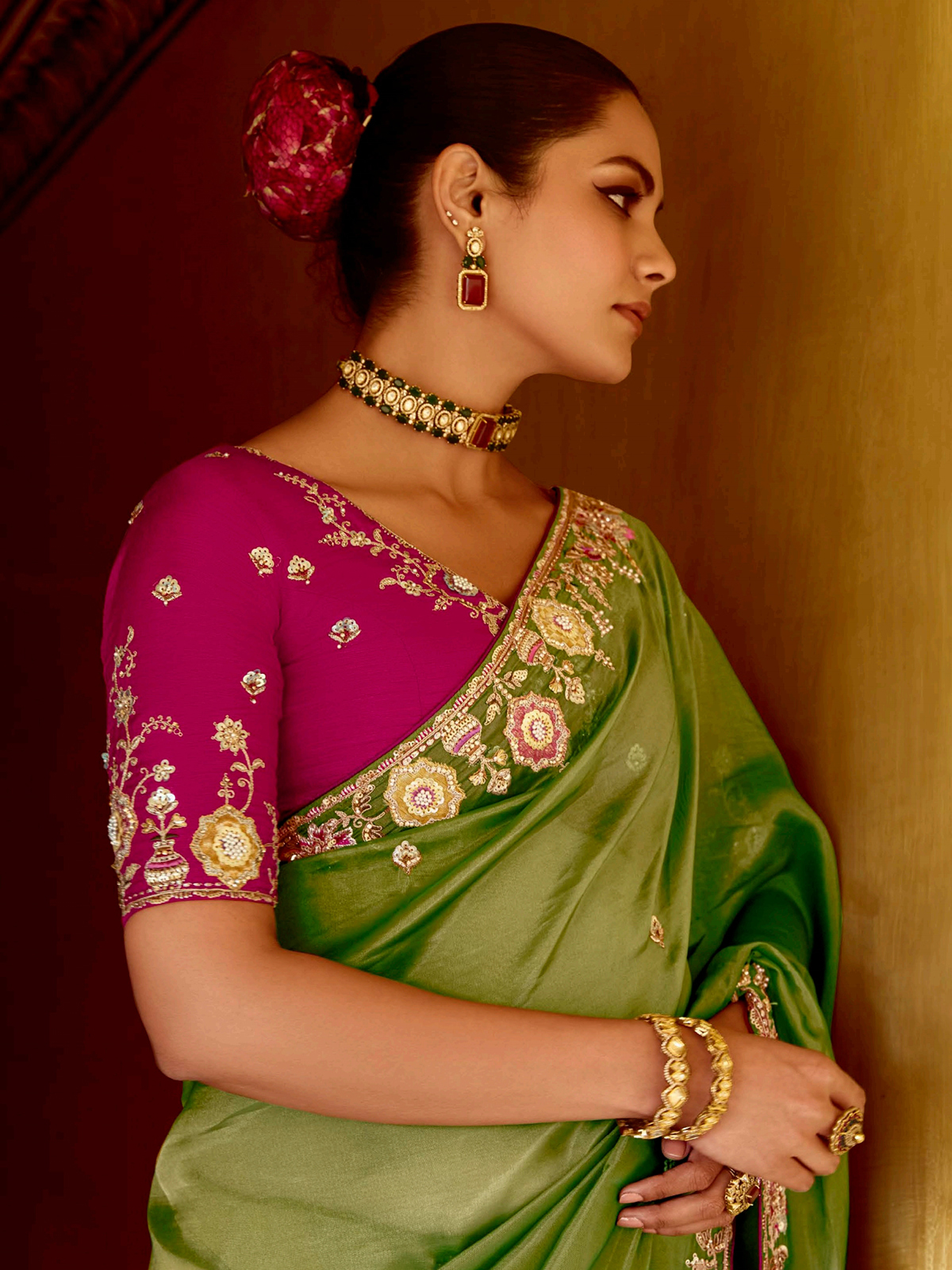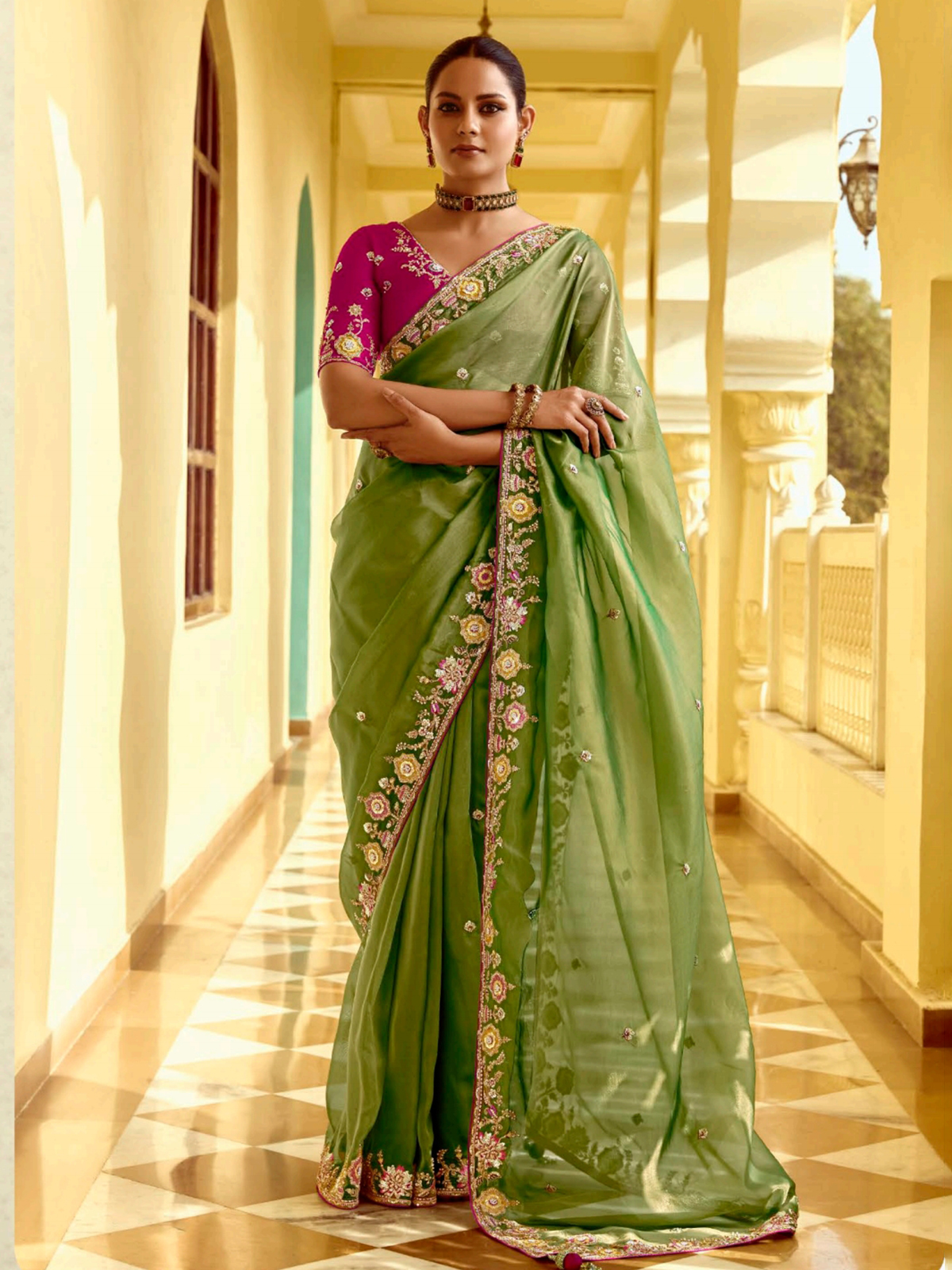 Regal and striking, this tissue silk saree dazzles with sequins, beads, resham, and stone embellishments. Its luminous finish makes it perfect for festive occasions. Designed to radiate grandeur, it comes with an unstitched blouse piece, offering a complete ethnic ensemble that captures both traditional richness and modern elegance.