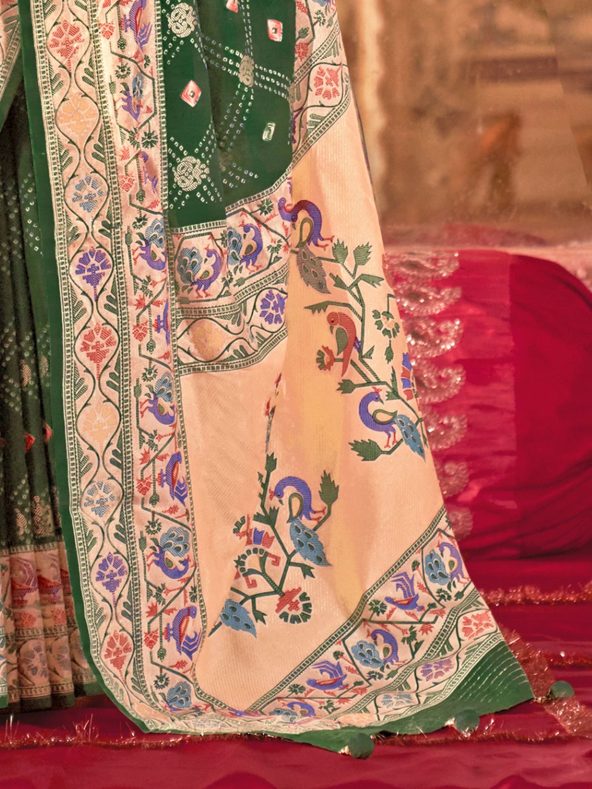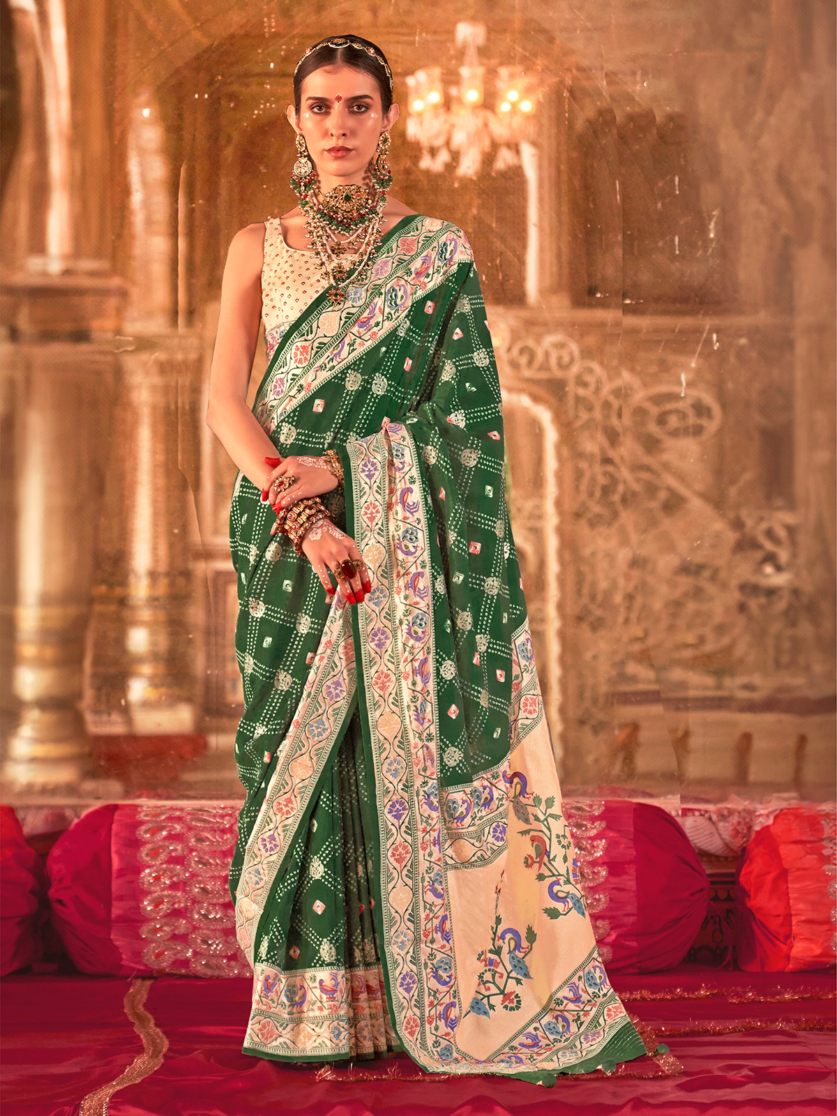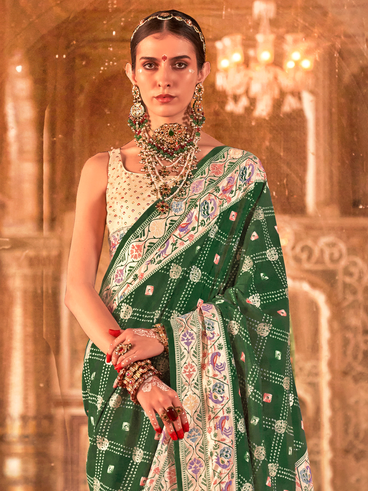 This green silk saree showcases a stunning blend of digital prints and intricate zari weaving, making it perfect for festive and wedding celebrations. The rich fabric adds elegance and charm, while the unstitched blouse lets you tailor a look that’s uniquely yours.