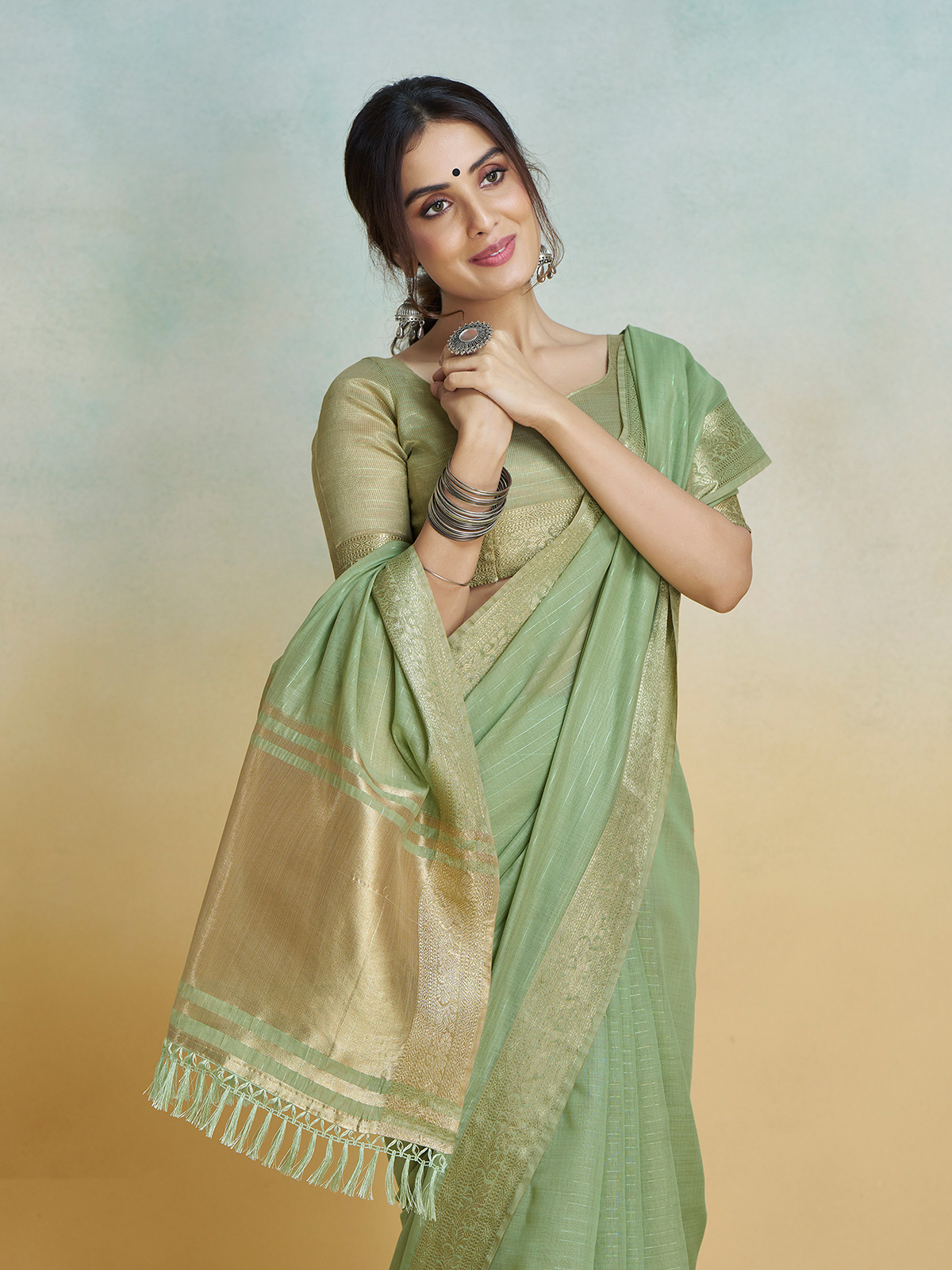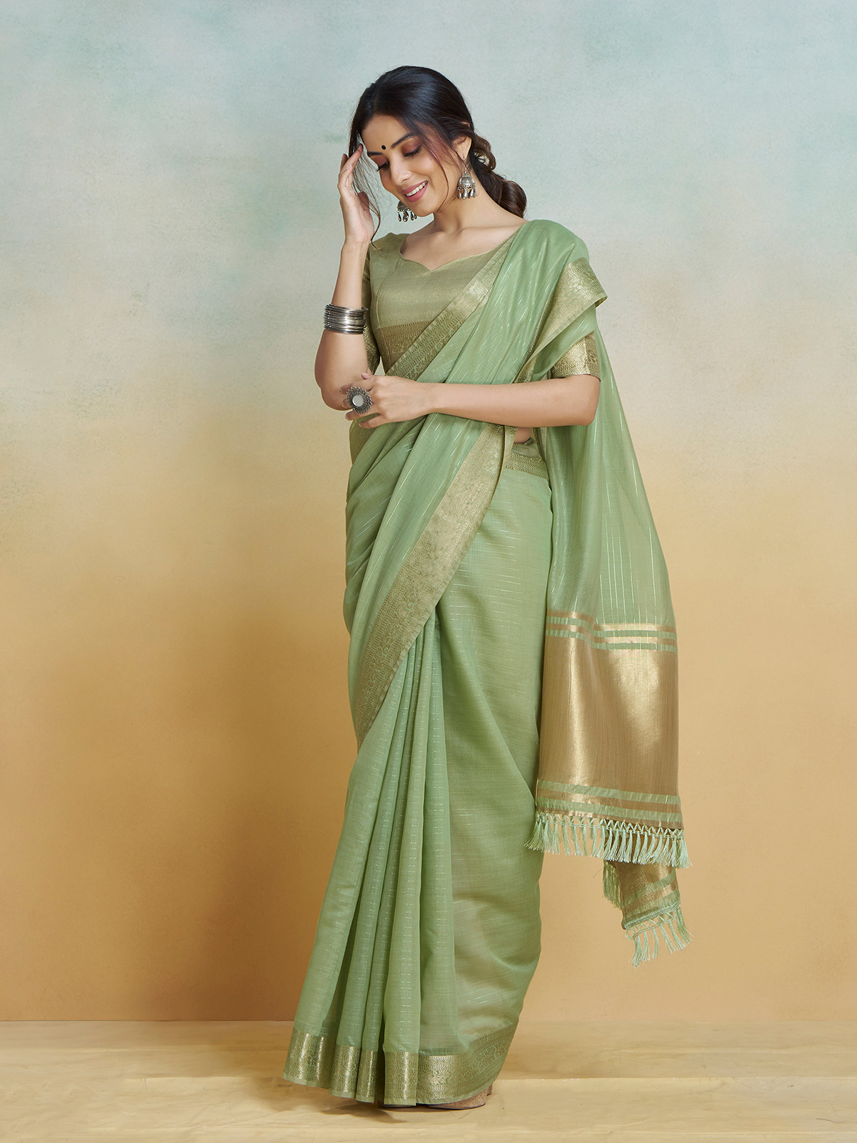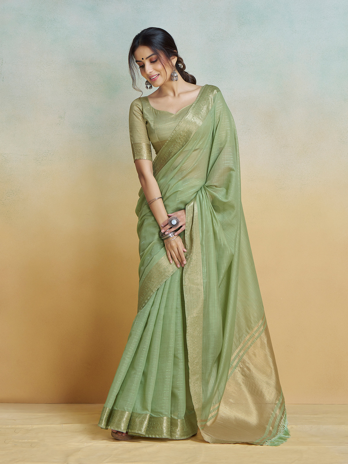 A vibrant green silk saree enhanced with elegant zari weaving makes a perfect festive statement. The unstitched blouse offers tailored comfort, while the flowing drape adds regal charm. Ideal for weddings, festivals, and cultural gatherings, its a celebration of craftsmanship, luxury, and timeless tradition.