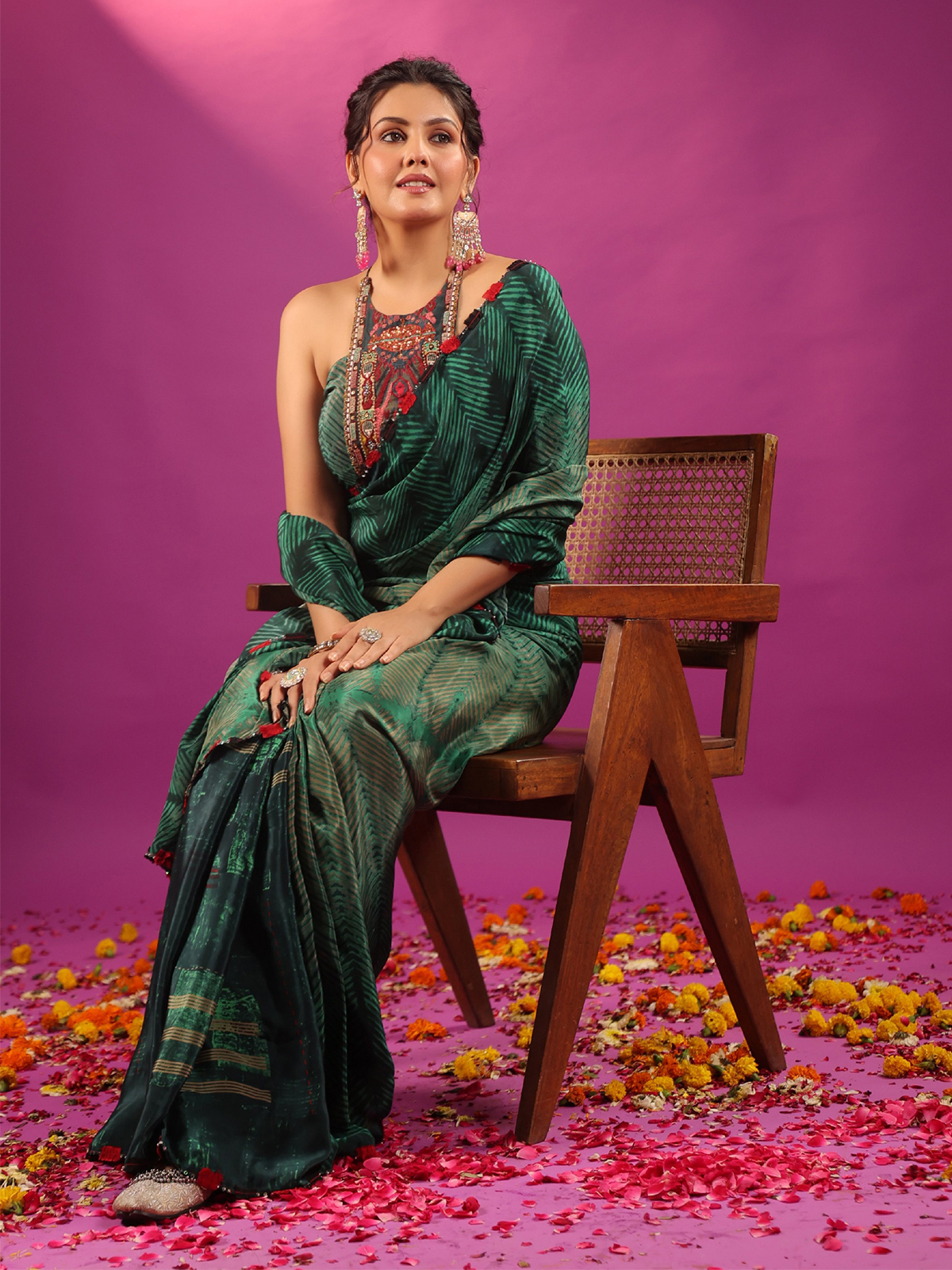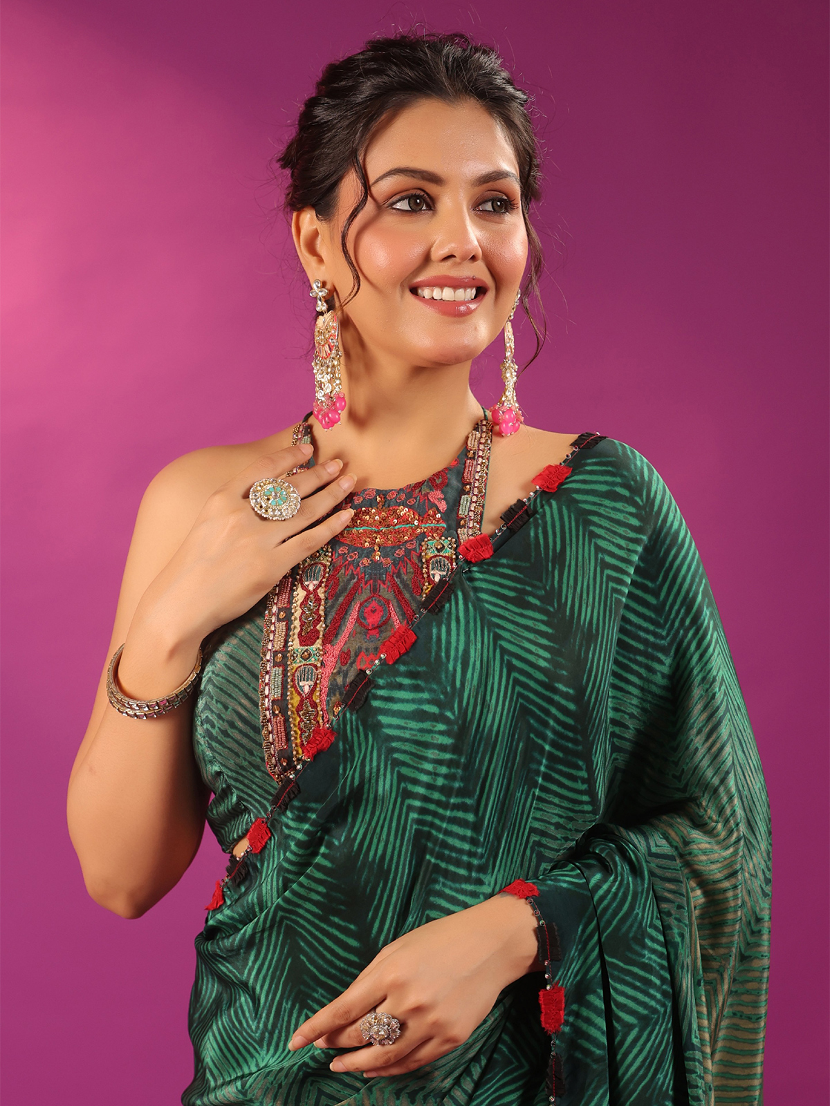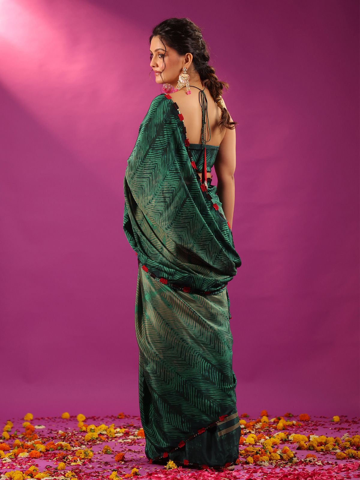 A rich green cruss tussar silk blouse featuring detailed thread embroidery, sequin highlights, and bead accents. Designed for mehandi, festive events, or pre-wedding functions, it captures traditional aesthetics with its vibrant color and heritage-inspired surface work.