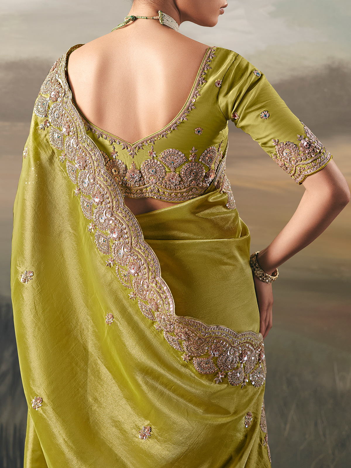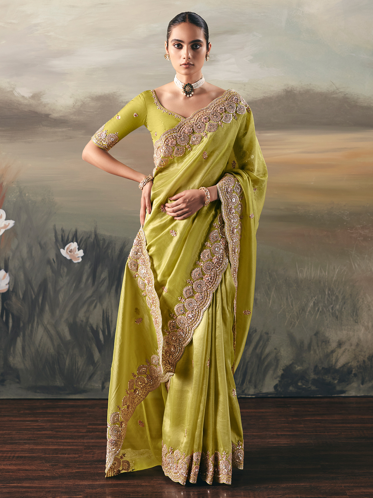 Elegantly adorned with sequins, stones, zardosi, resham, and bead work, this green tissue silk saree features a beautifully heavy border. Ideal for mehendi, weddings, receptions, and sangeet, it includes an unstitched blouse for custom stitching.
