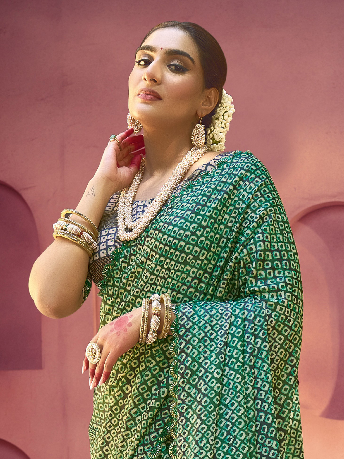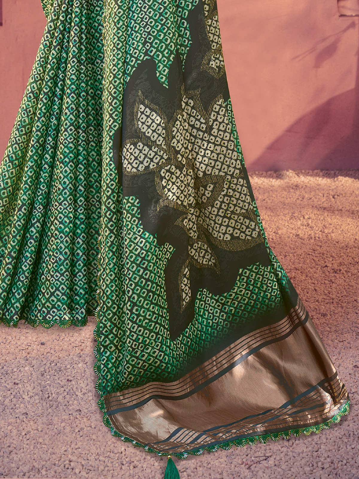 Crafted in fine green gajji silk, this saree showcases traditional prints enriched with cutdana and zari work. Its smooth texture and subtle gleam make it a graceful choice for festive and special occasions. Comes with an unstitched blouse piece.