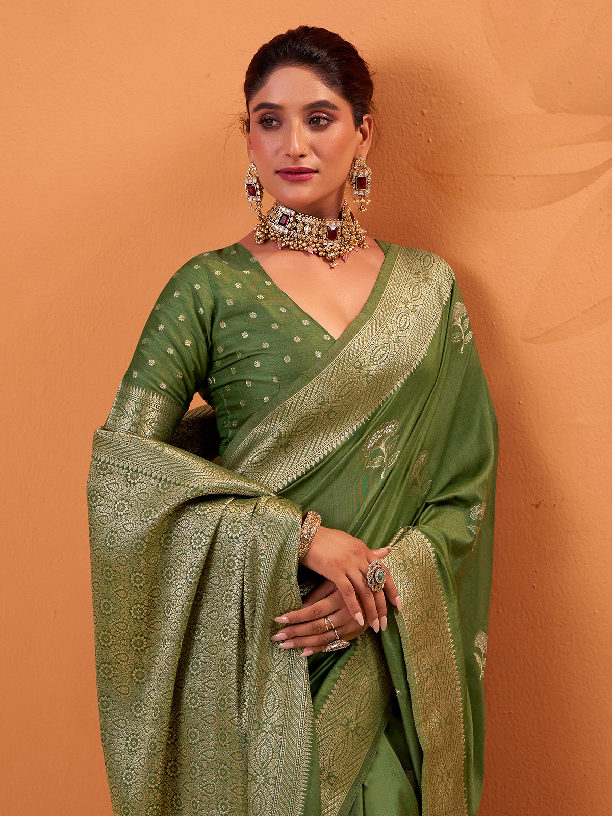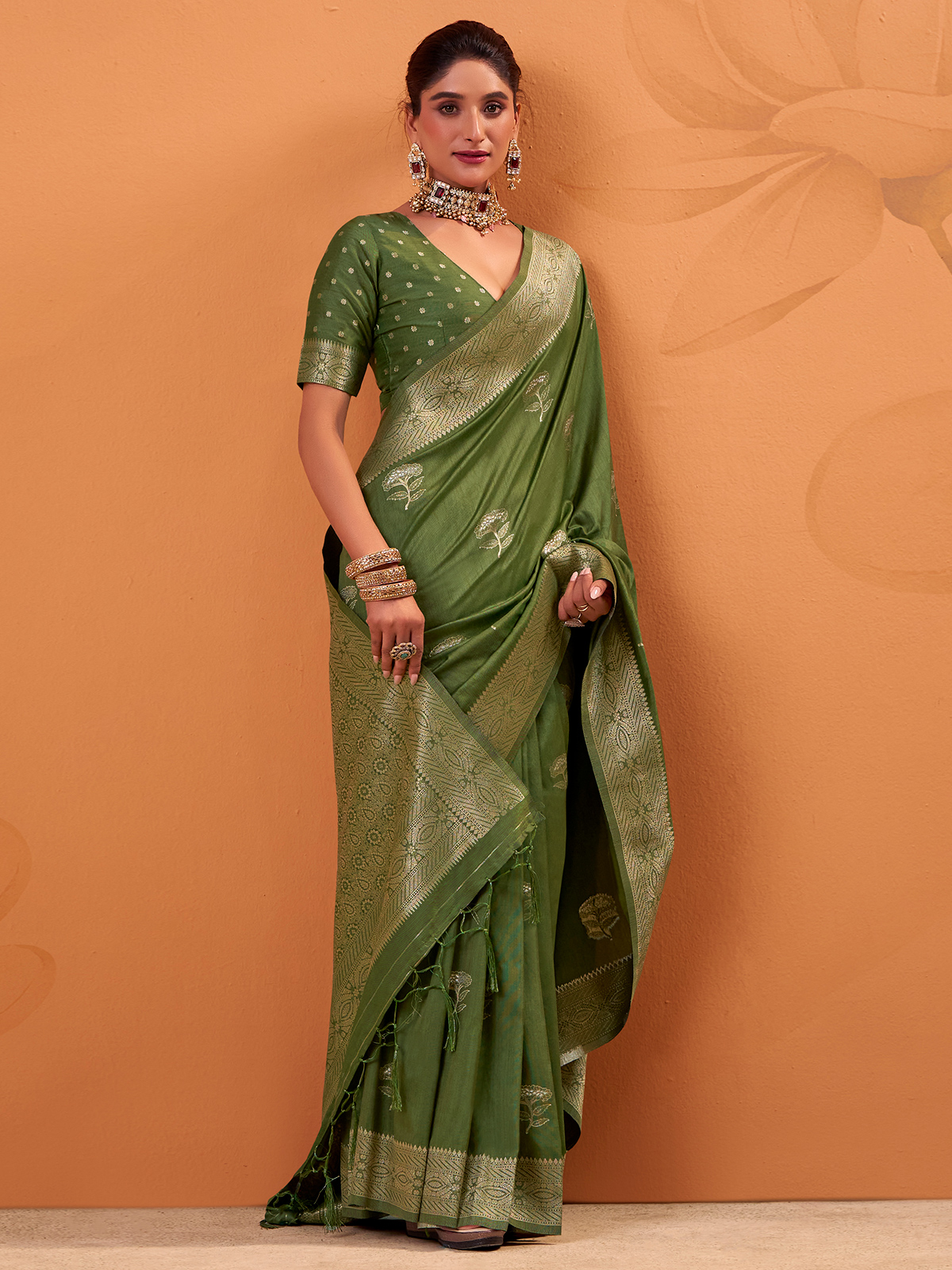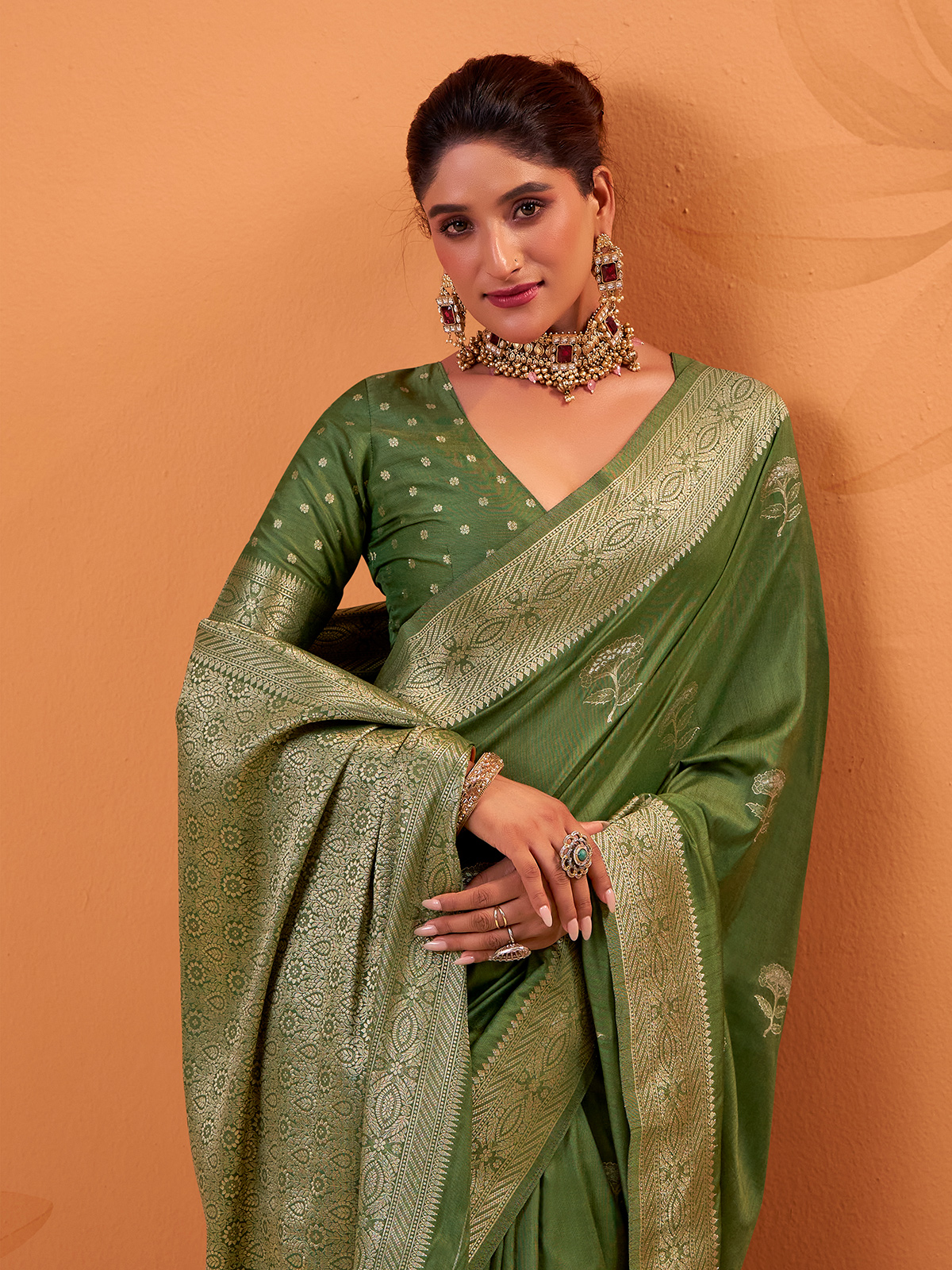 Green Tusser Silk Saree With Gleaming Zari Embellish